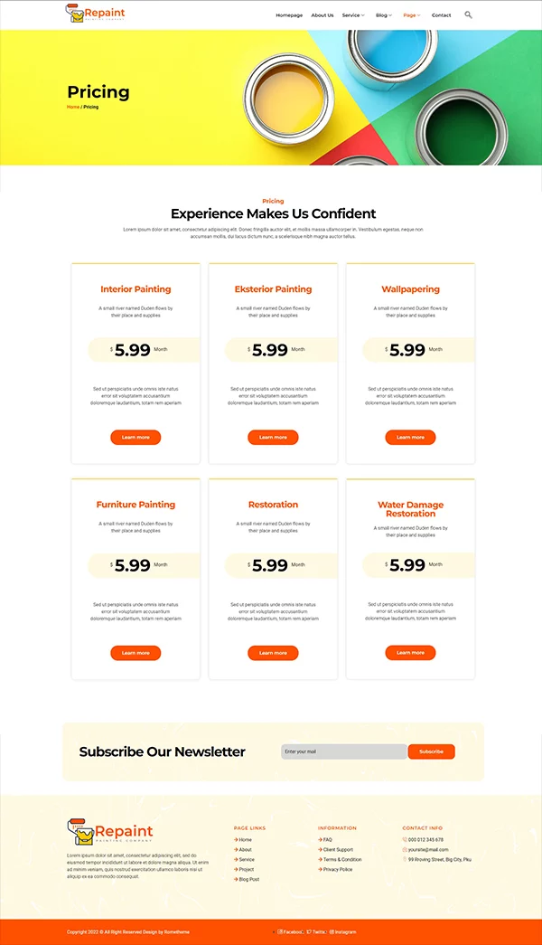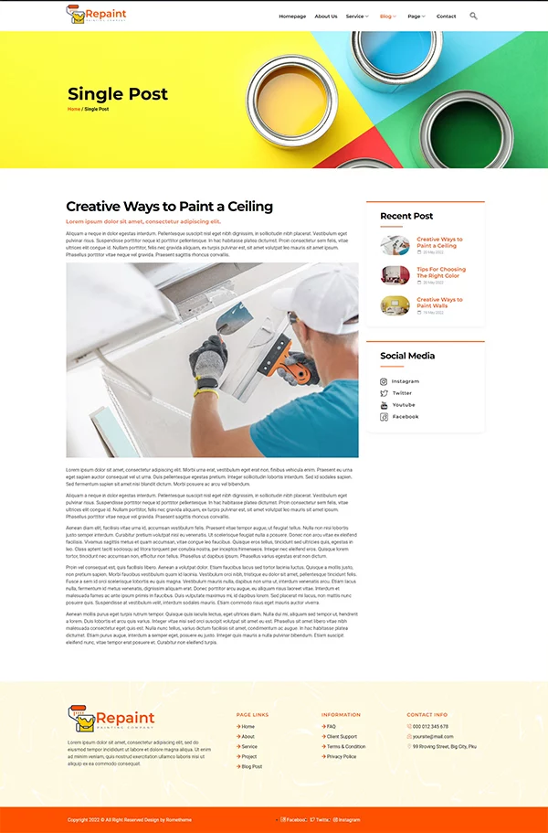 “کیت قالب المنتور خدمات شرکت نقاشی Repaint” یک قالب کاملاً واکنشگرا، تمیز و قابل سفارشیسازی است. ریپینت میتواند برای شرکتهای نقاشی، وبسایتهای نقاشی، استودیوهای معماری و وبسایتهای خدمات و کسبوکارهای مرتبط استفاده شود. ریپینت برای افرادی طراحی شده است که میخواهند کارها، خدمات و حرفهای بودن خود را به نمایش بگذارند.