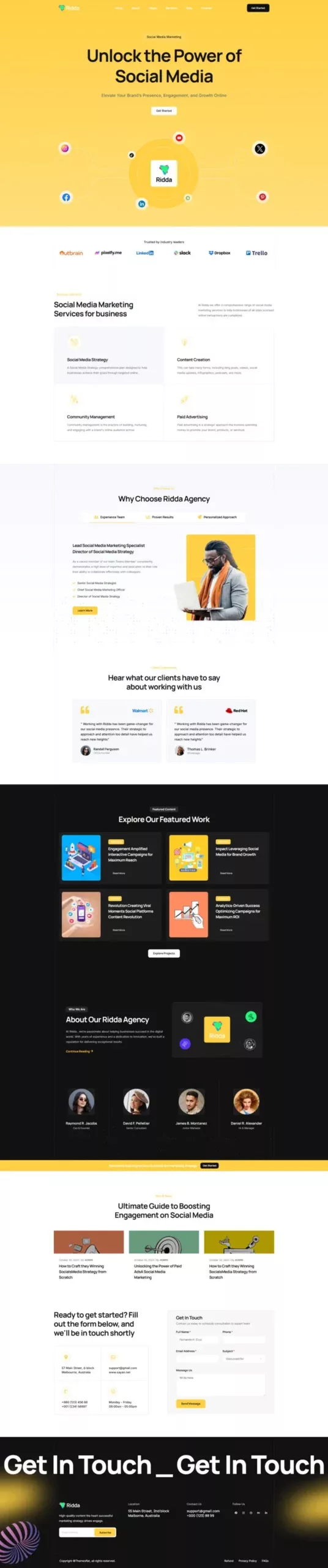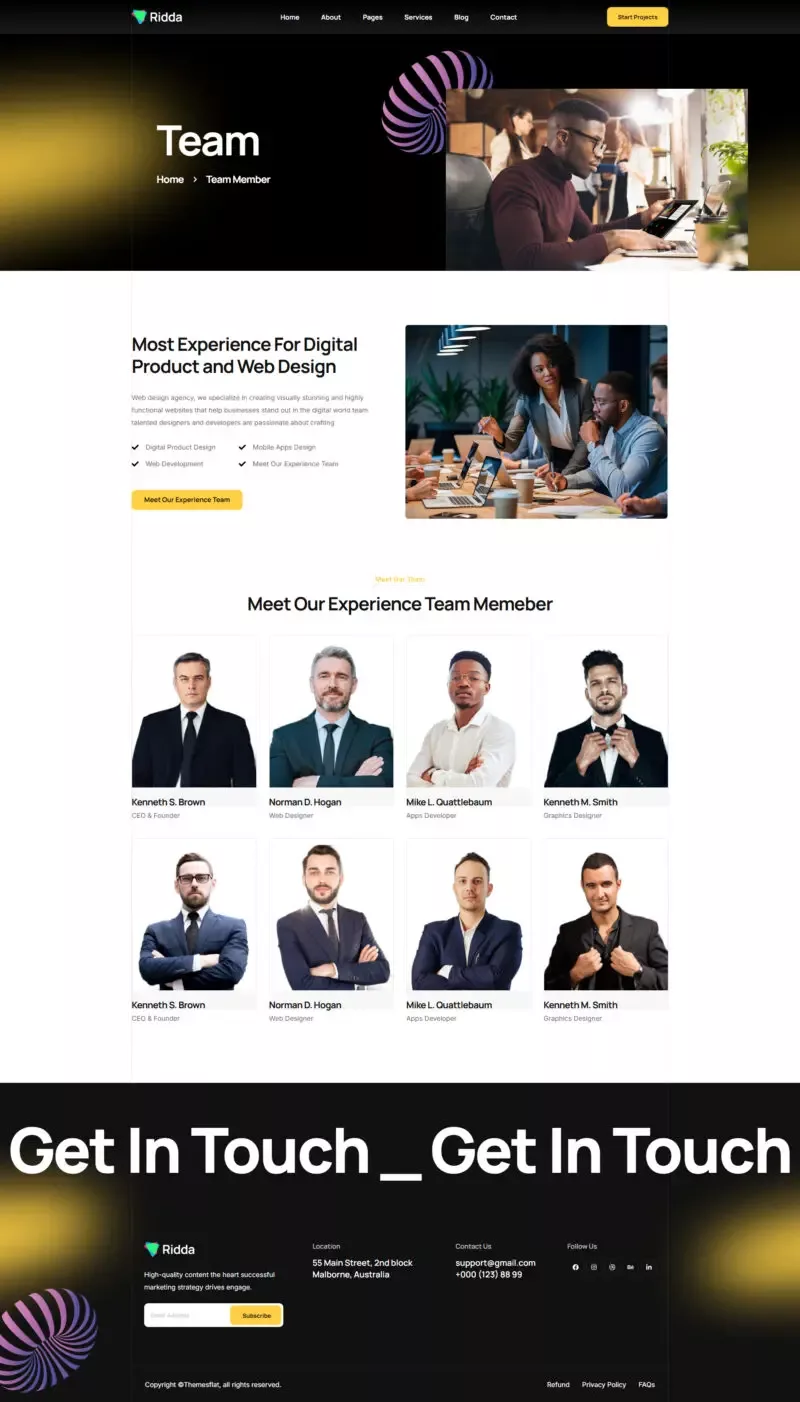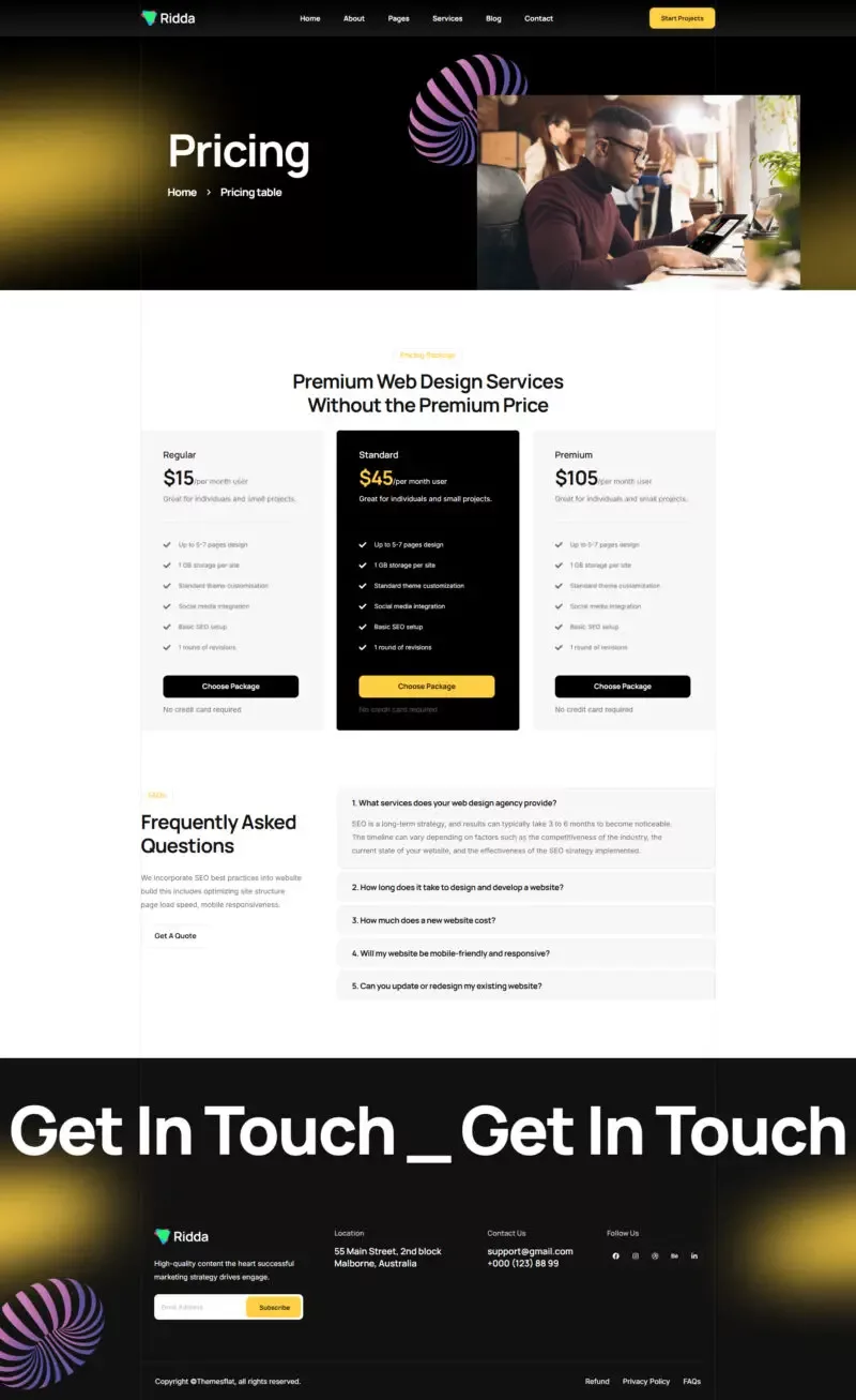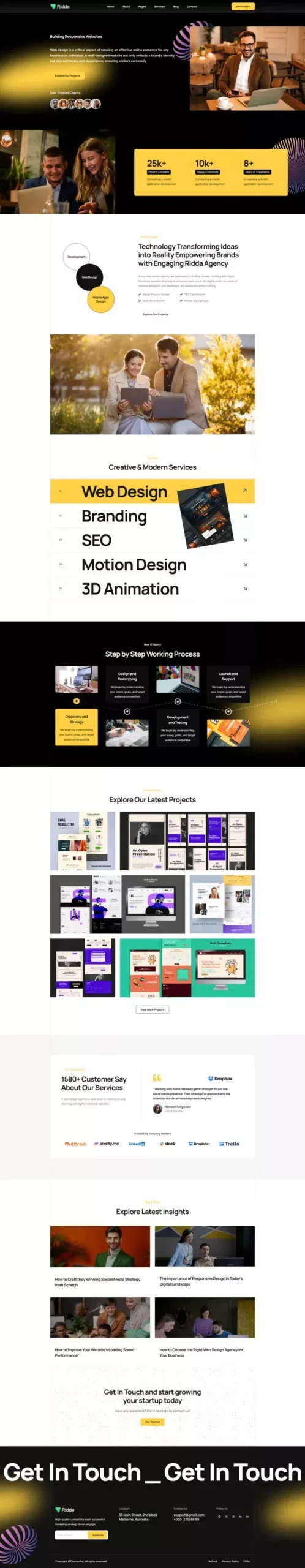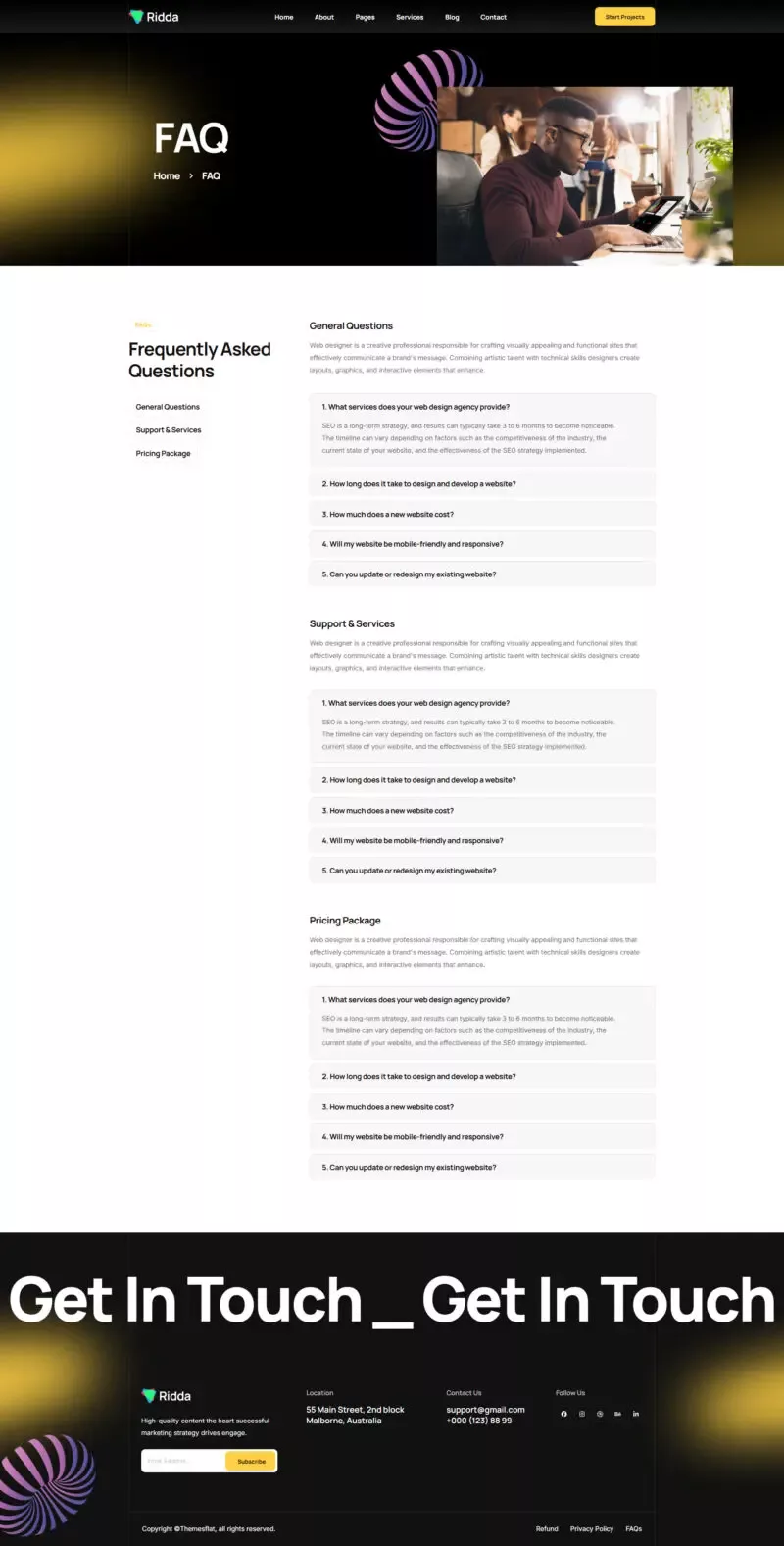 با استفاده از این کیت، دیگر نیازی به دانش کدنویسی یا طراحی حرفهای نخواهید داشت. تمامی المانها از پیش آماده شدهاند تا شما بتوانید تنها با چند کلیک ساده، یک وبسایت مدرن و زیبا بسازید. Ridda با تمرکز بر طراحی کاربرپسند و قابلیتهای پیشرفته، یکی از بهترین گزینهها برای وبسایتهای مرتبط با طراحی و بازاریابی دیجیتال است.