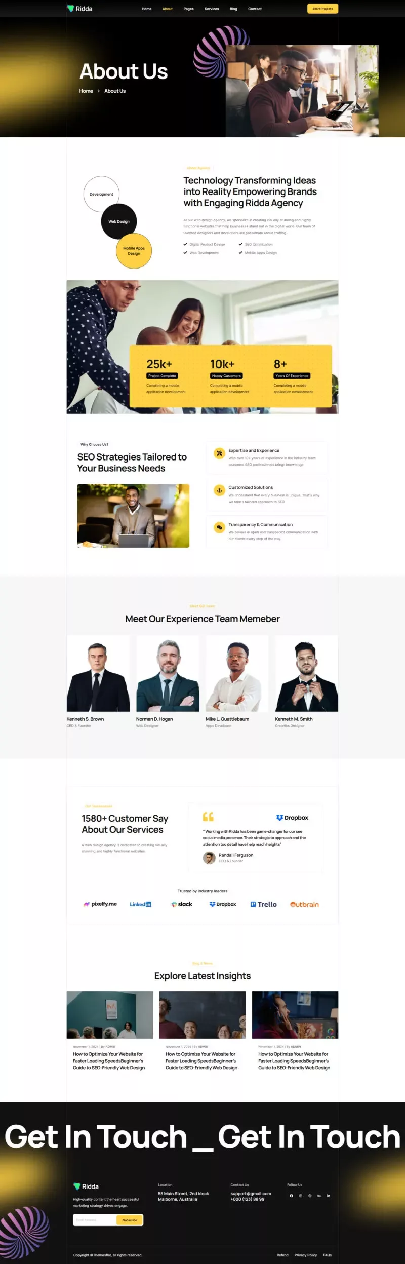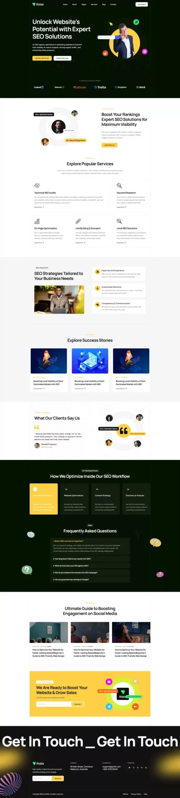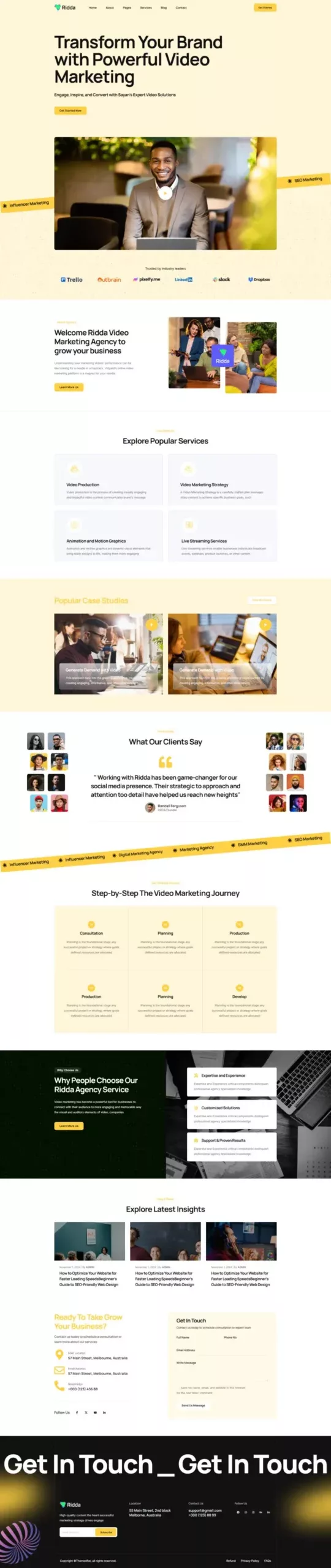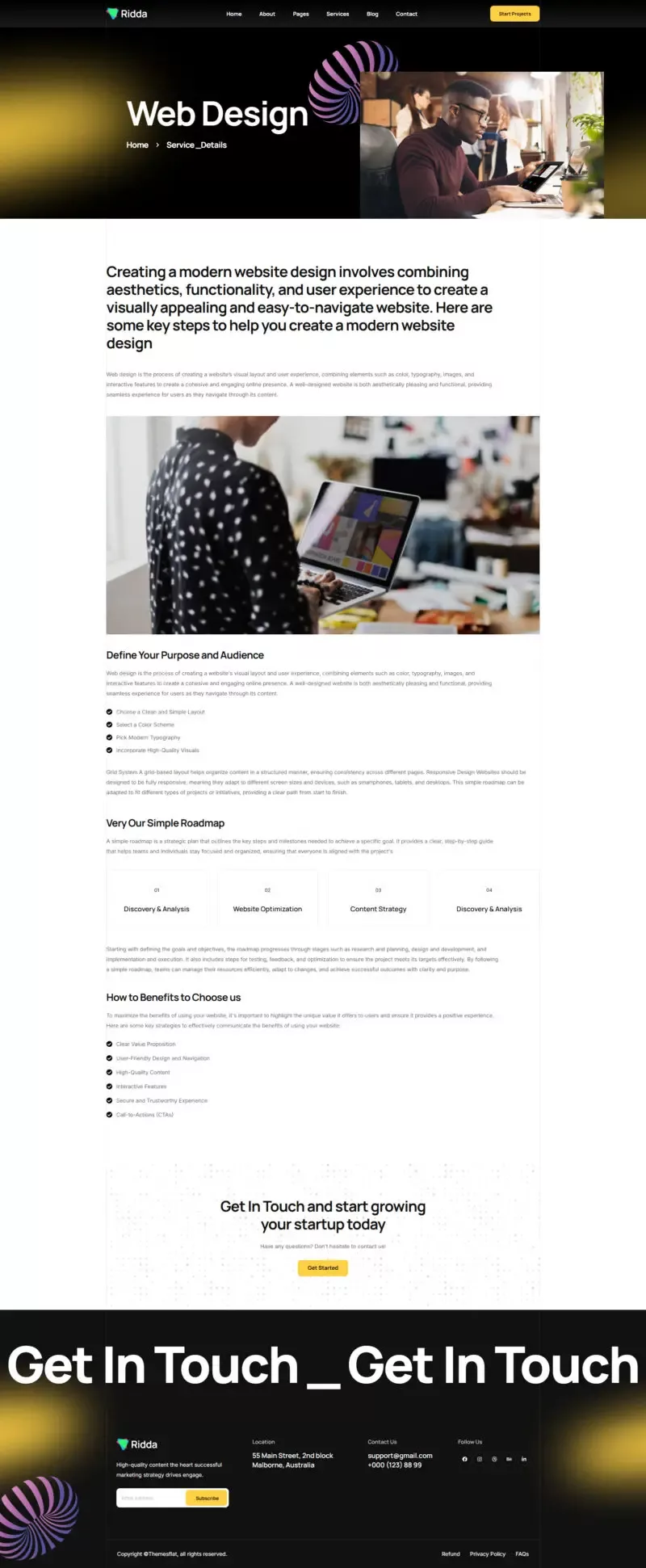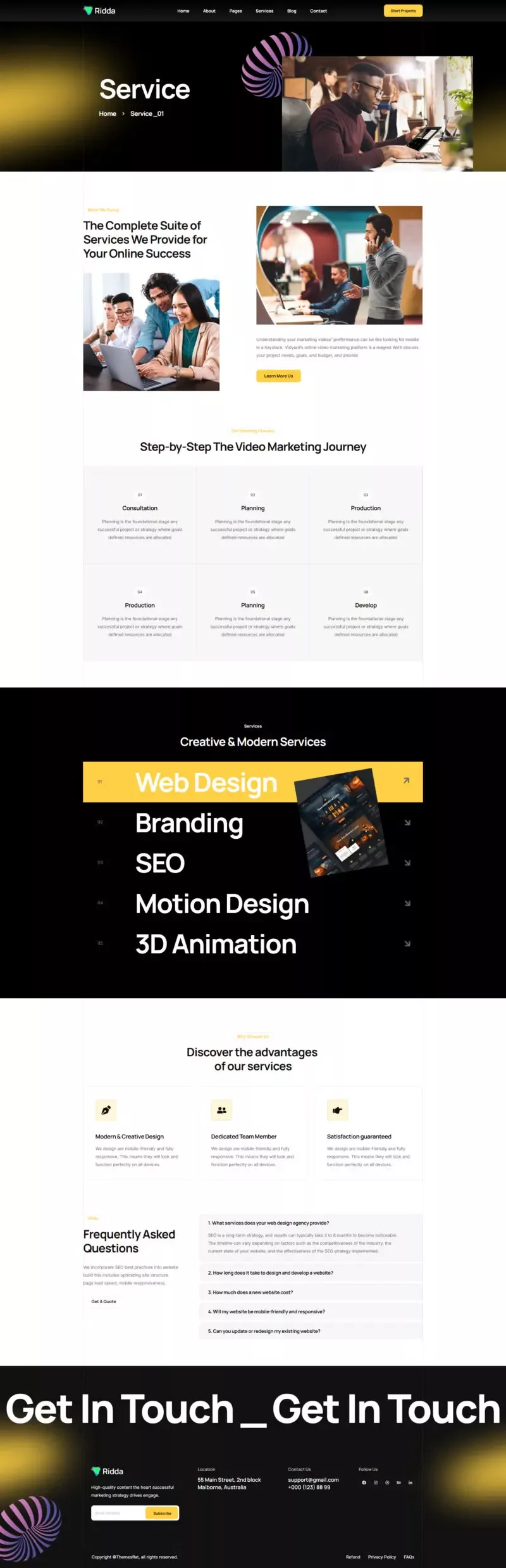 با استفاده از این کیت، دیگر نیازی به دانش کدنویسی یا طراحی حرفهای نخواهید داشت. تمامی المانها از پیش آماده شدهاند تا شما بتوانید تنها با چند کلیک ساده، یک وبسایت مدرن و زیبا بسازید. Ridda با تمرکز بر طراحی کاربرپسند و قابلیتهای پیشرفته، یکی از بهترین گزینهها برای وبسایتهای مرتبط با طراحی و بازاریابی دیجیتال است.