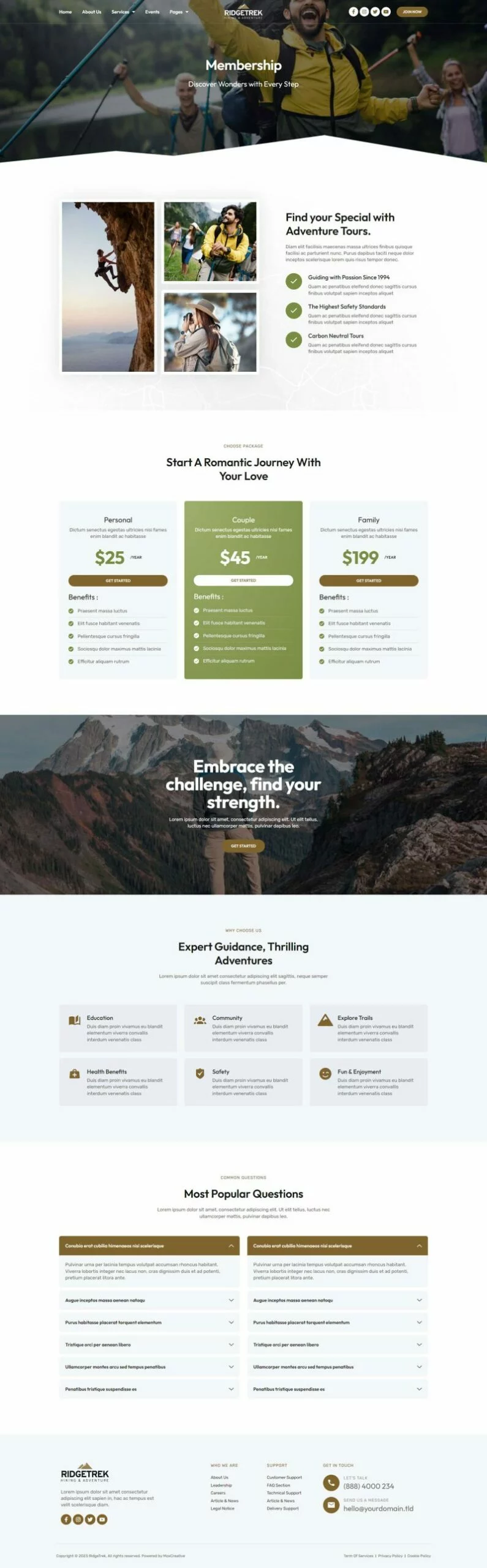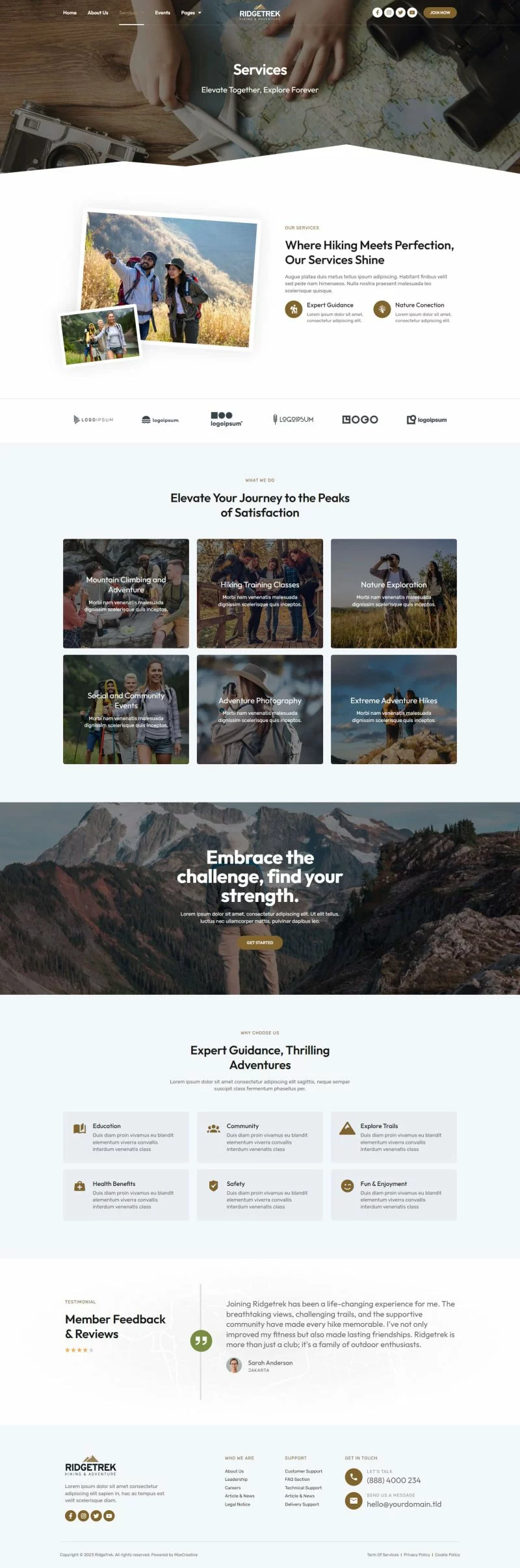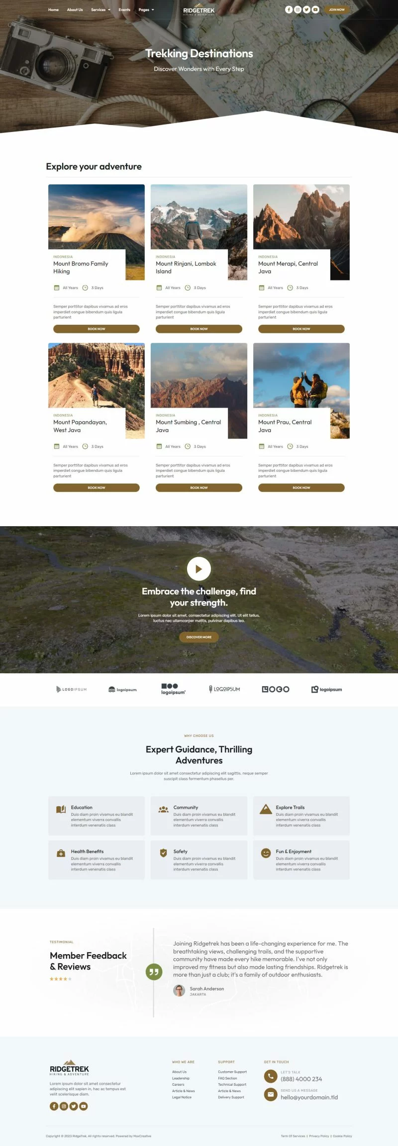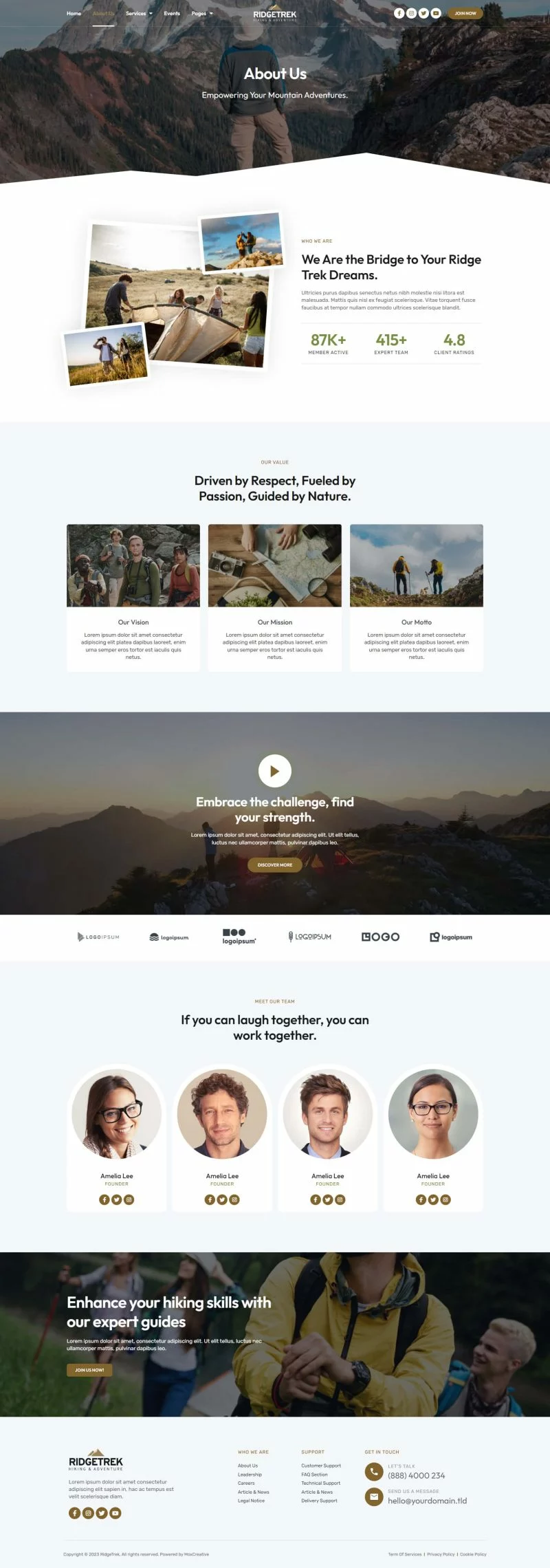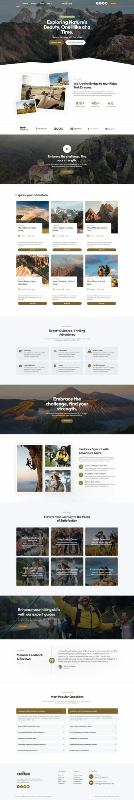 کیت قالب المنتور کوهنوردی و ماجراجویی RidgeTrek به شما کمک میکند تا هر وبسایتی که مرتبط با کمپینگ، ماجراجوییهای بیرون از خانه، کوهنوردی، تجربه طبیعت، پارک، کمپینگ لوکس، سفر و هر کسب و کار یا خدماتی که فعالیتهای بیرونی ارائه میدهد، بسازید. این کیت دارای بیش از 12 قالب پیشساخته با طراحی تمیز و سبک مدرن است.