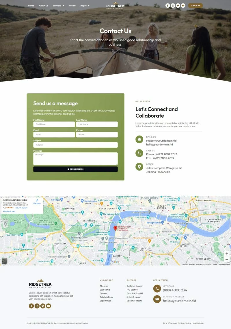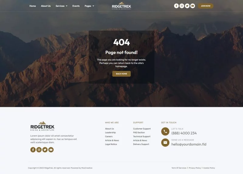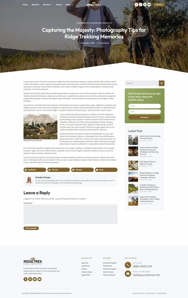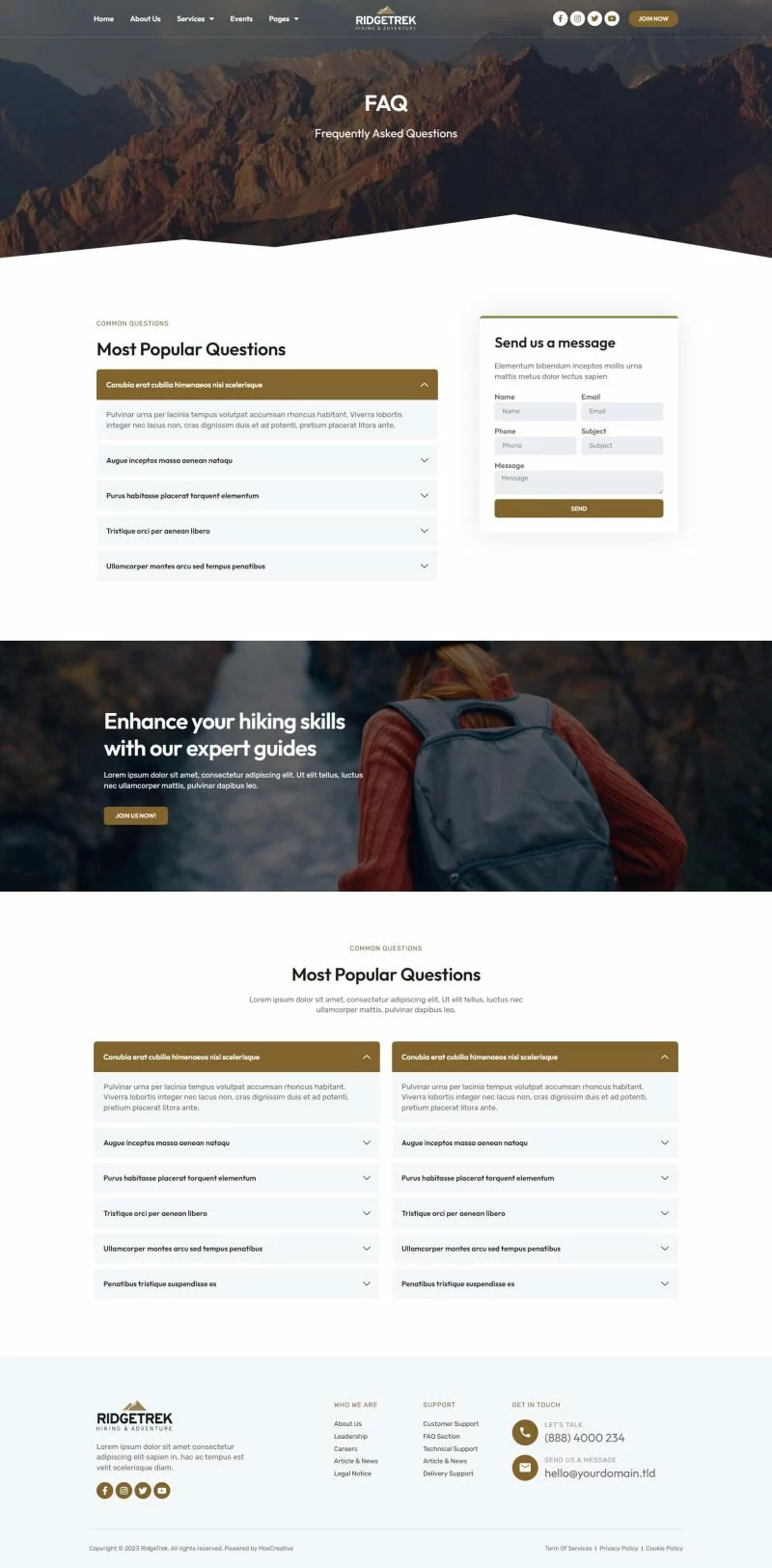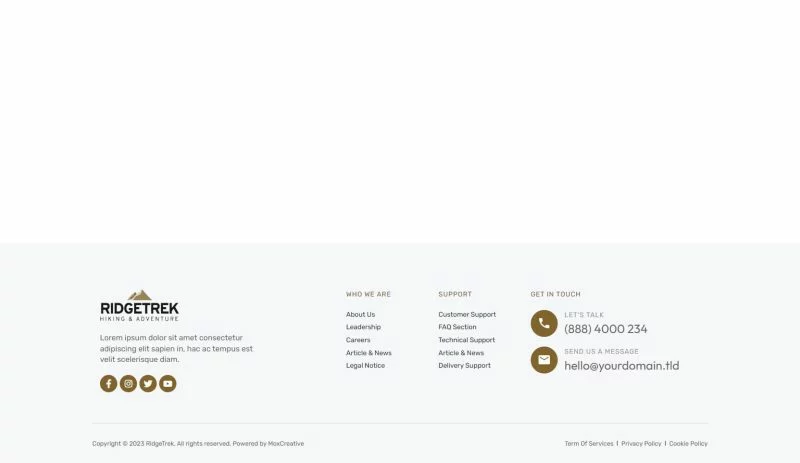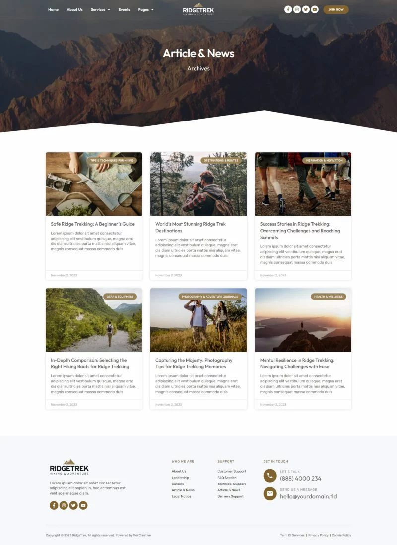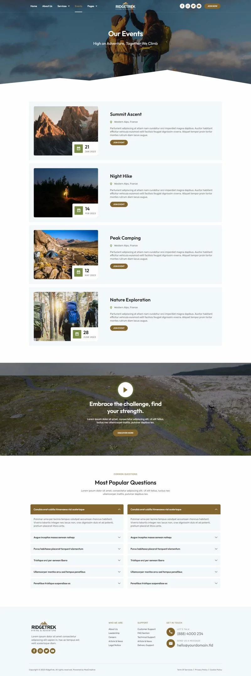کیت قالب المنتور کوهنوردی و ماجراجویی RidgeTrek به شما کمک میکند تا هر وبسایتی که مرتبط با کمپینگ، ماجراجوییهای بیرون از خانه، کوهنوردی، تجربه طبیعت، پارک، کمپینگ لوکس، سفر و هر کسب و کار یا خدماتی که فعالیتهای بیرونی ارائه میدهد، بسازید. این کیت دارای بیش از 12 قالب پیشساخته با طراحی تمیز و سبک مدرن است.