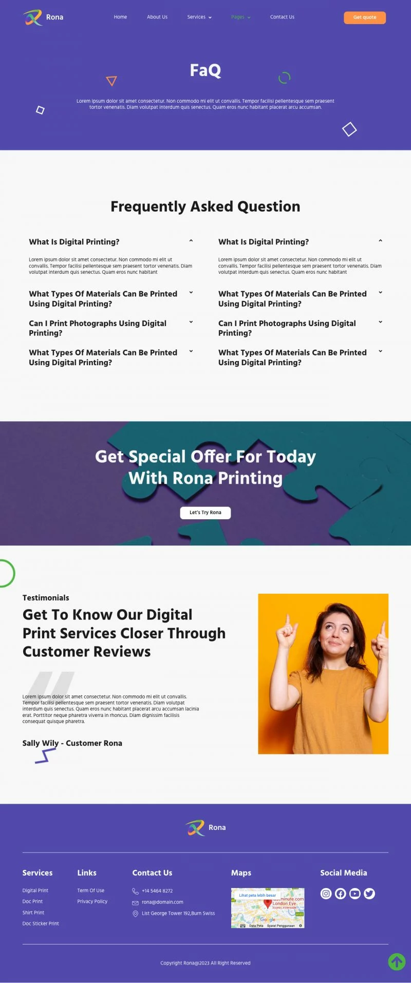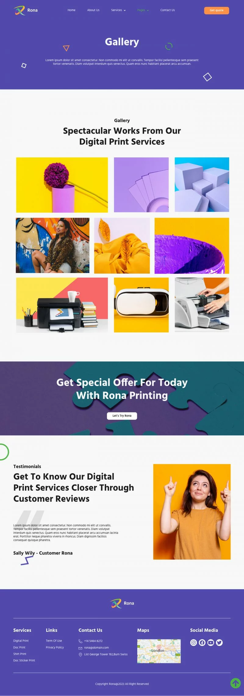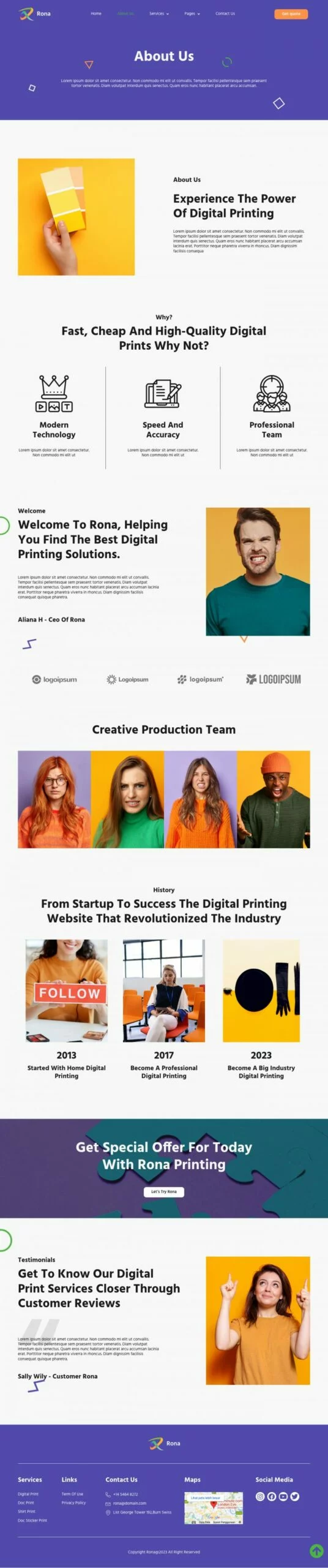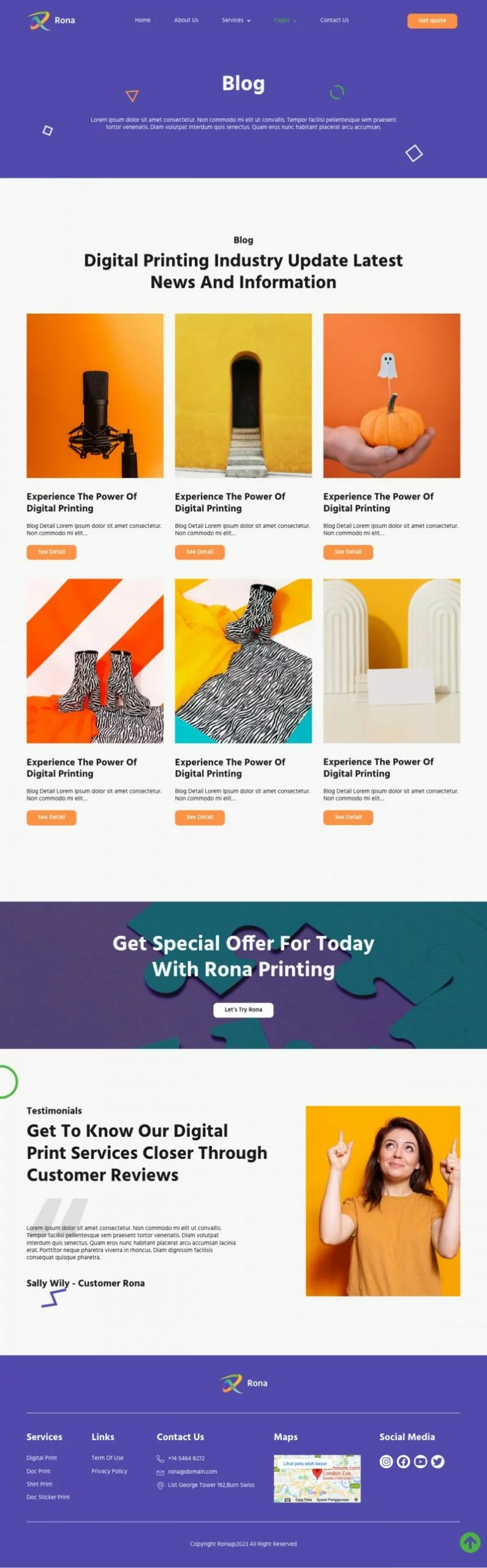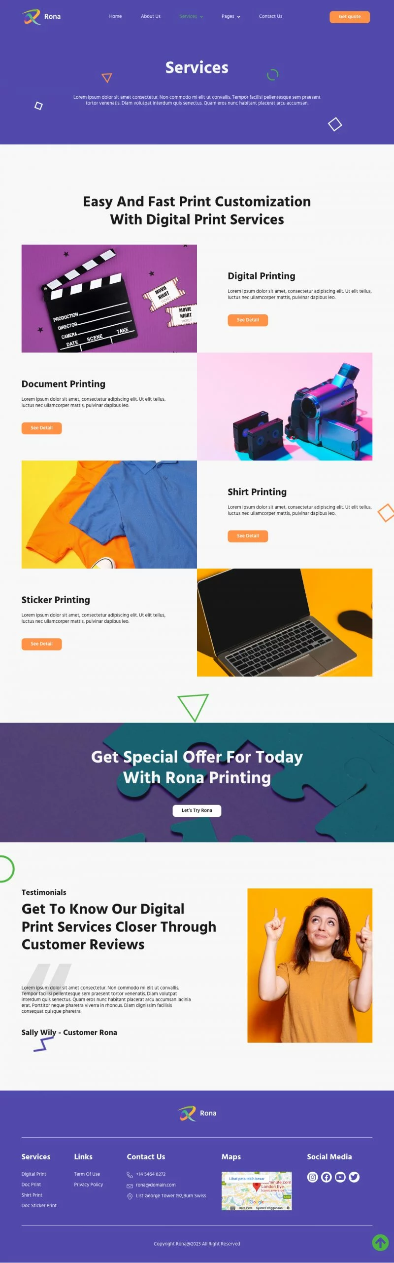 کیت قالب المنتور Rona برای خدمات چاپ دیجیتال، یک کیت قالب المنتور برای ساخت سریع و آسان وبسایتهای کسبوکار شما با استفاده از افزونه Elementor Page Builder برای وردپرس است. این یک قالب وردپرس نیست. کیتهای قالب شامل محتوای صفحه برای سازنده صفحه المنتور هستند.