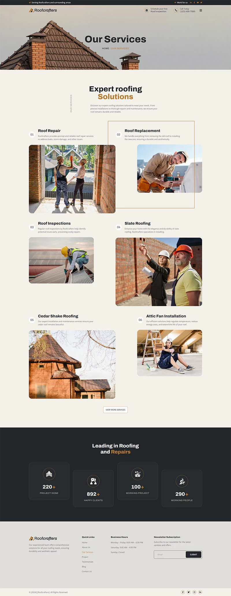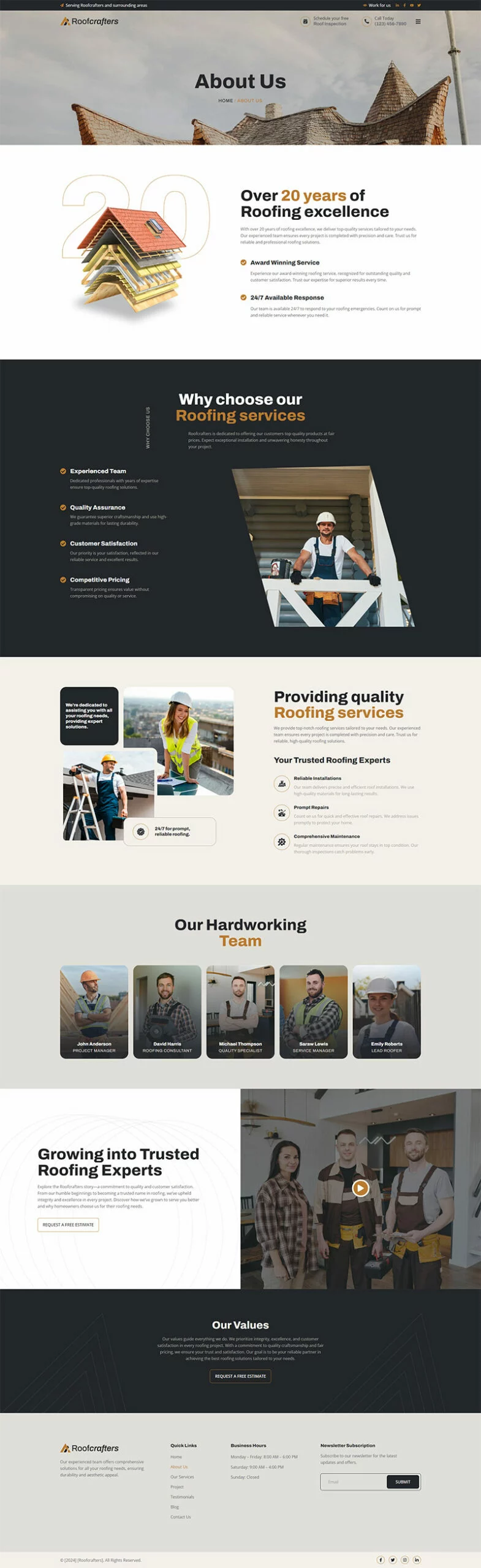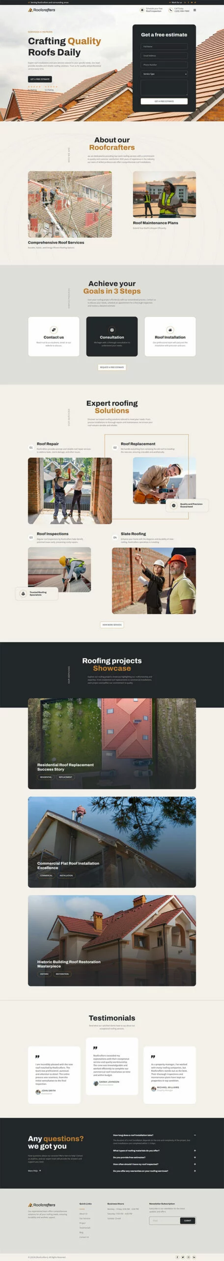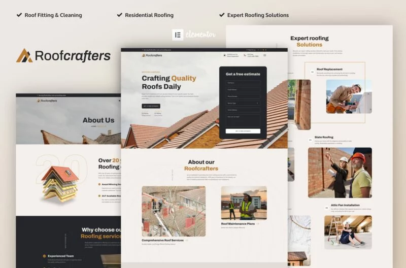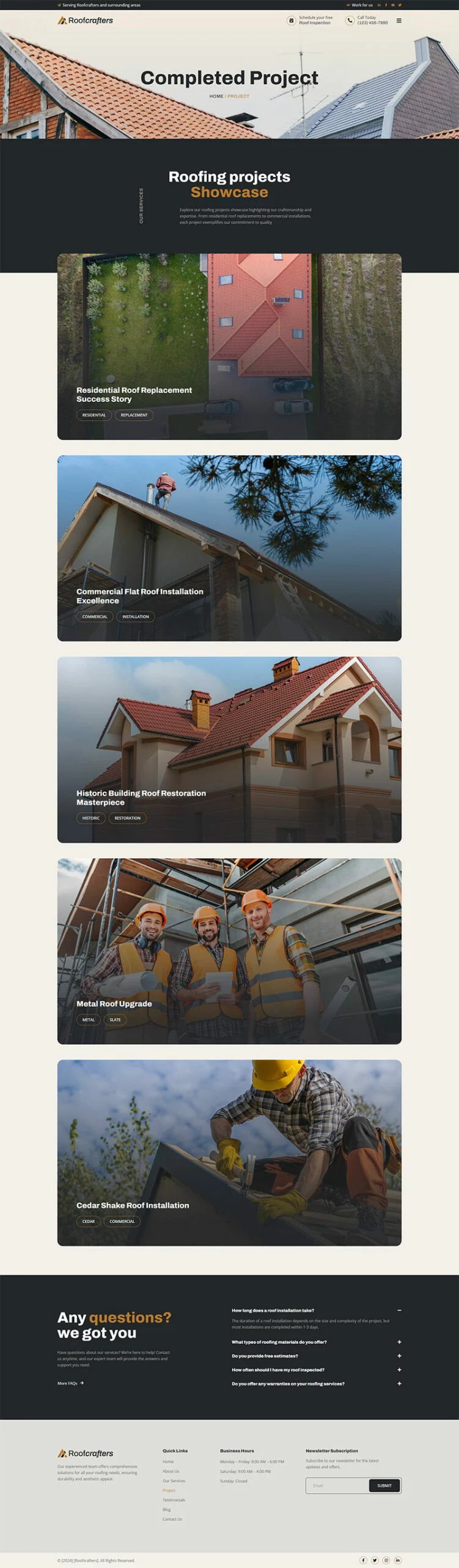 با بخشهای زیبا و طراحیشده بهمنظور نمایش پروژههای برتر و نظرات مشتریان، Roofcrafters به شما کمک میکند که اعتماد و اعتبار خود را نزد مشتریان بالقوه تقویت کنید و بهوضوح کیفیت و قابلیت اطمینان شرکت سقفسازی خود را به نمایش بگذارید.