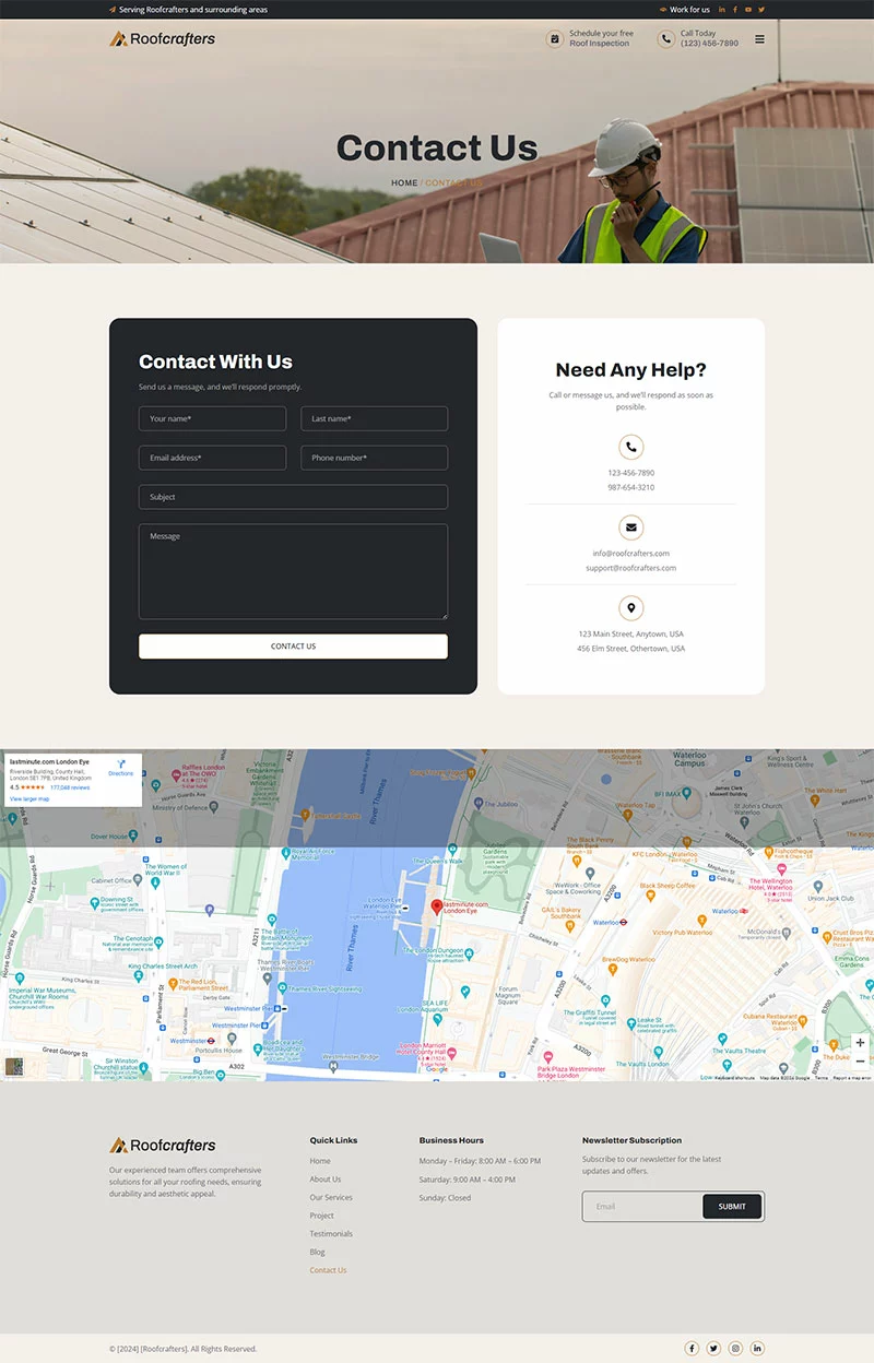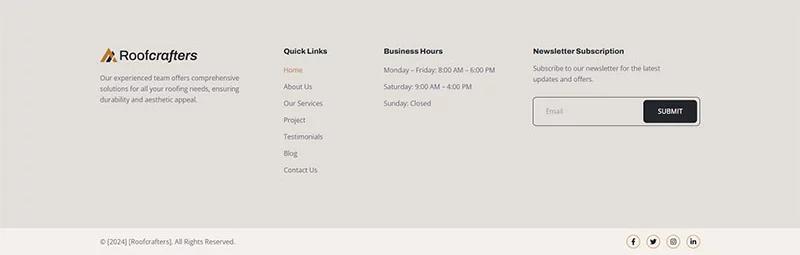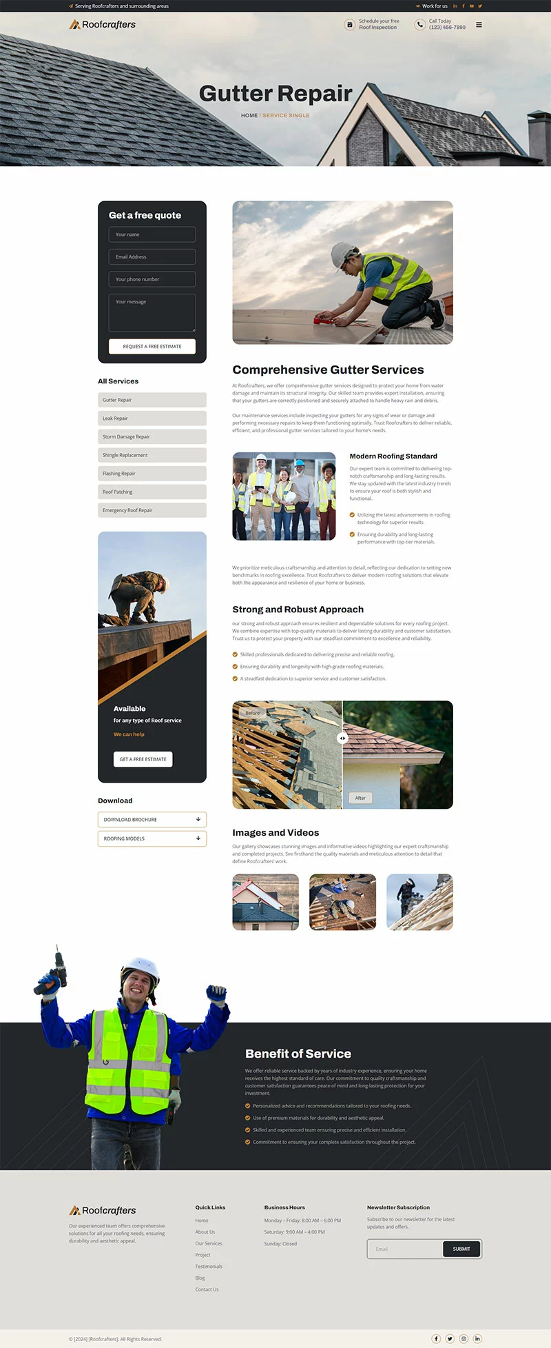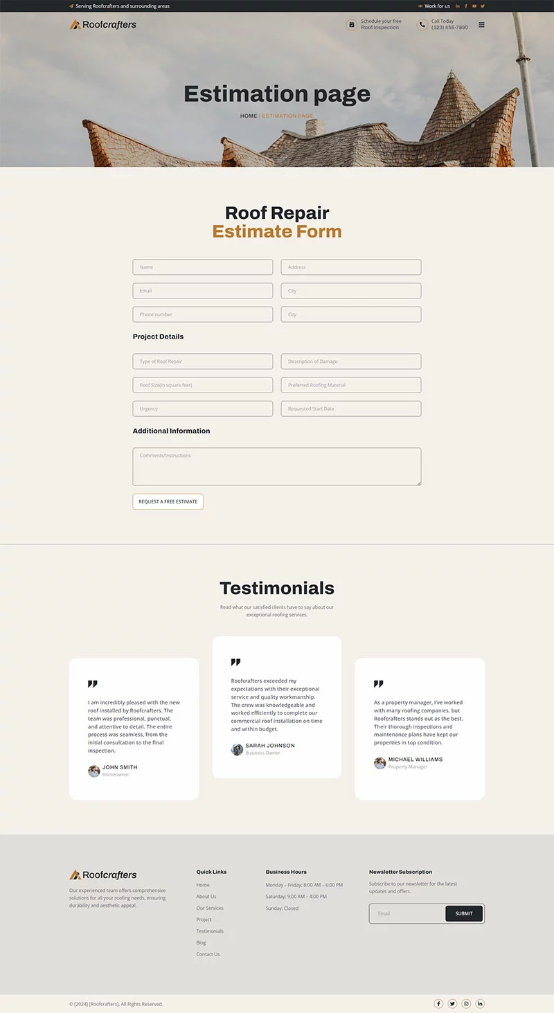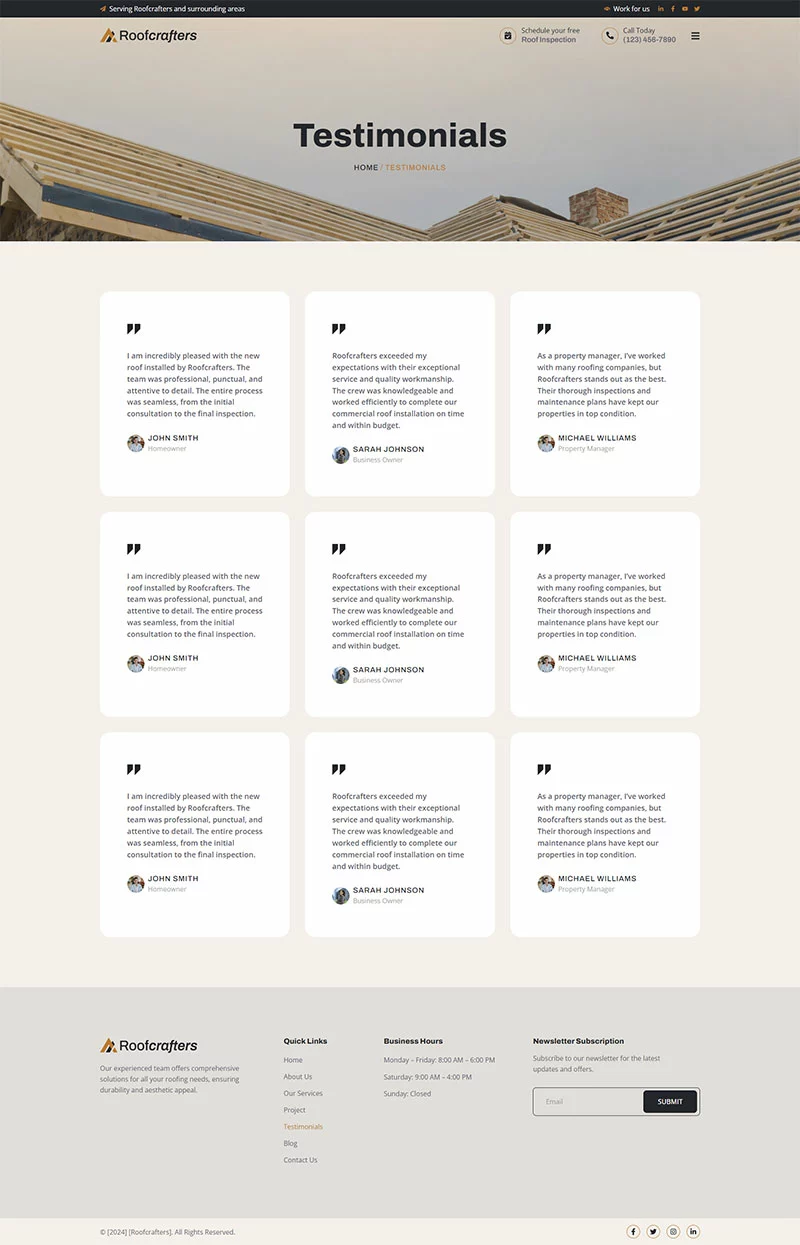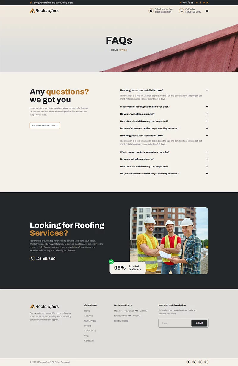 با بخشهای زیبا و طراحیشده بهمنظور نمایش پروژههای برتر و نظرات مشتریان، Roofcrafters به شما کمک میکند که اعتماد و اعتبار خود را نزد مشتریان بالقوه تقویت کنید و بهوضوح کیفیت و قابلیت اطمینان شرکت سقفسازی خود را به نمایش بگذارید.