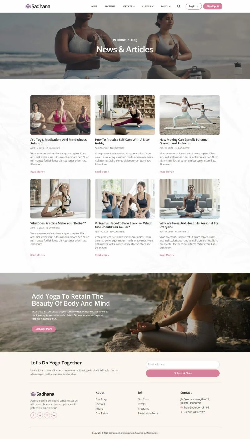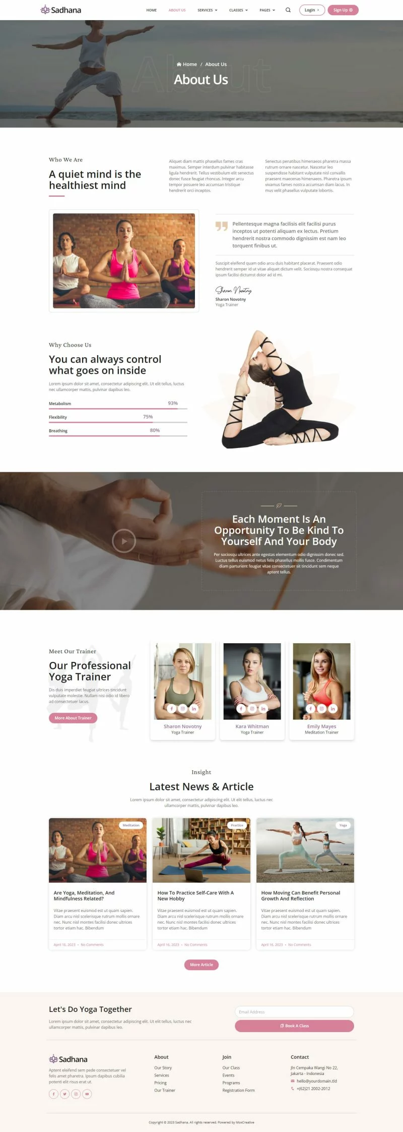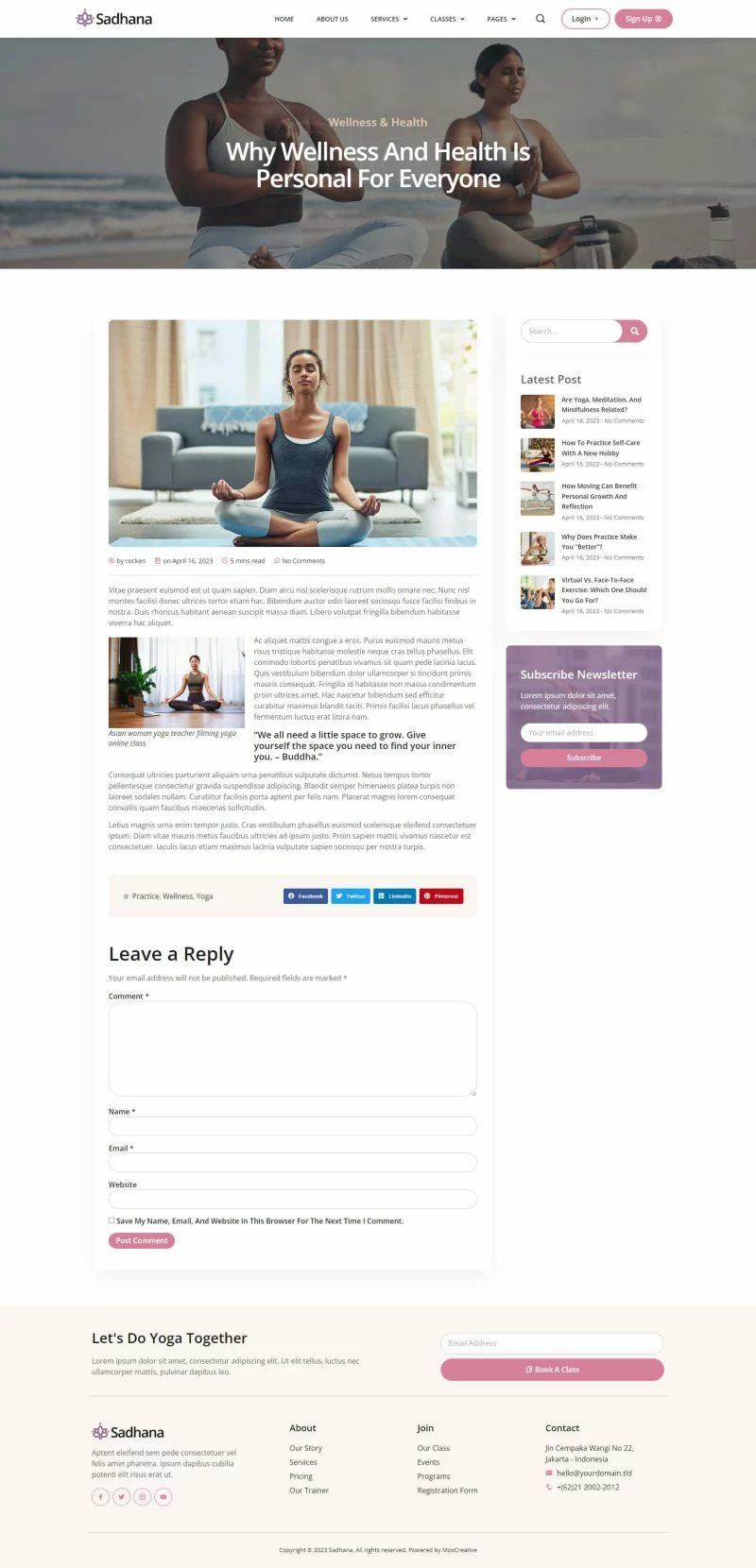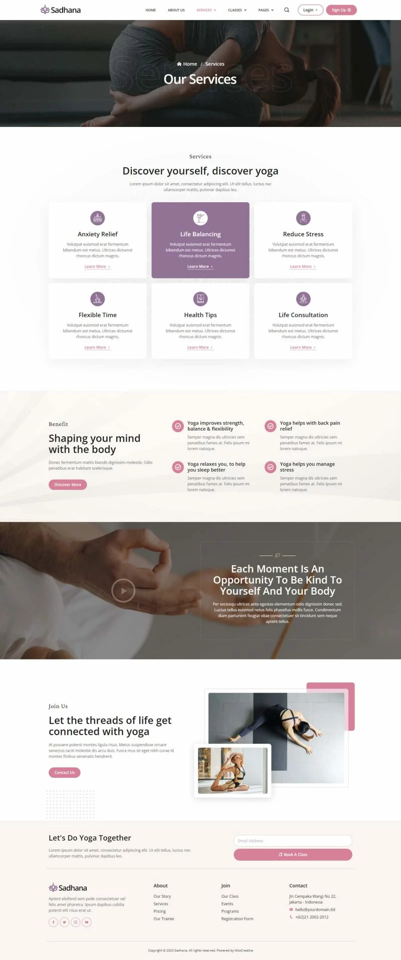 با استفاده از کیت قالب المنتور یوگا Sadhana، میتوانید به سرعت و بدون نیاز به کدنویسی یک وبسایت حرفهای و واکنشگرا برای مربی و استودیوی یوگا خود ایجاد کنید. این کیت با طراحی مدرن و زیبا، تمامی ابزارهای لازم برای نمایش کلاسها، مربیان، خدمات و تماس با ما را در اختیار شما قرار میدهد. Sadhana انتخابی عالی برای ایجاد یک حضور آنلاین برجسته و حرفهای در زمینه یوگا است.