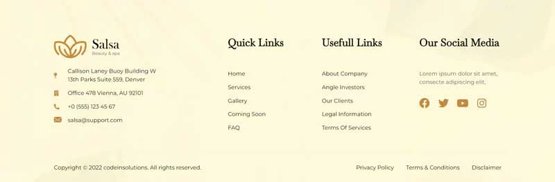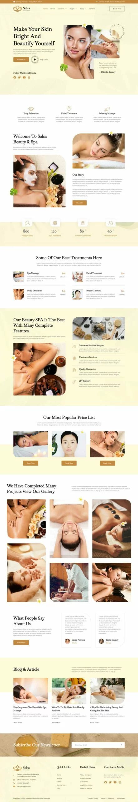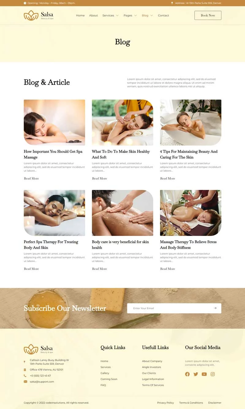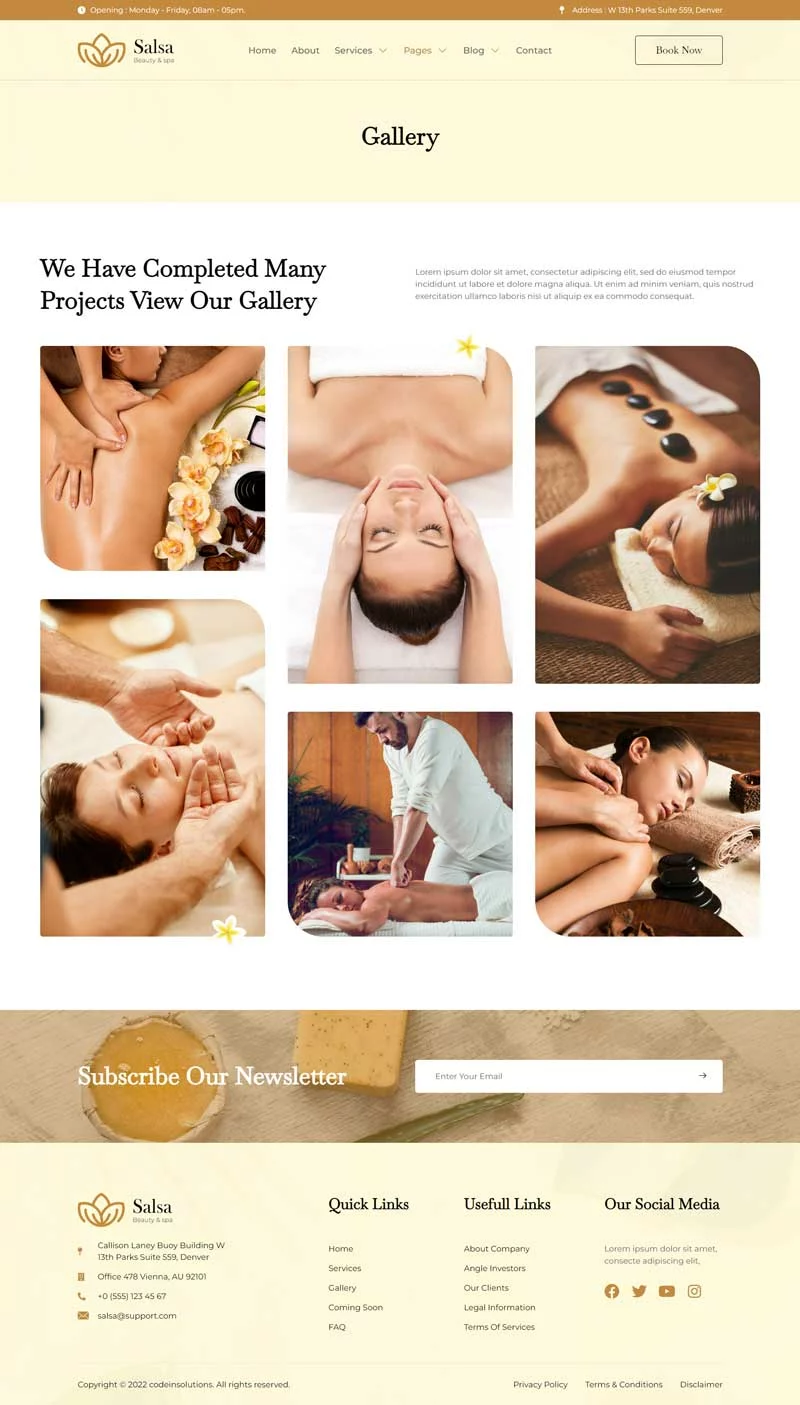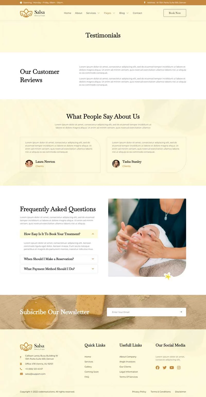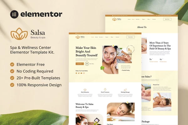 کیت قالب المنتور سالن زیبایی Salsa، یک کیت قالب مدرن است که برای سالنهای زیبایی، اسپا، مراکز سلامت، کلاسهای یوگا و مدیتیشن و سایر کسبوکارهای مرتبط با سلامت طراحی شده است. این کیت قالب با طراحی ساده و تمیز و همچنین چیدمانی 100٪ واکنشگرا، بهراحتی قابل سفارشیسازی است و هر کسی میتواند بدون نیاز به دانش کدنویسی از آن استفاده کند.