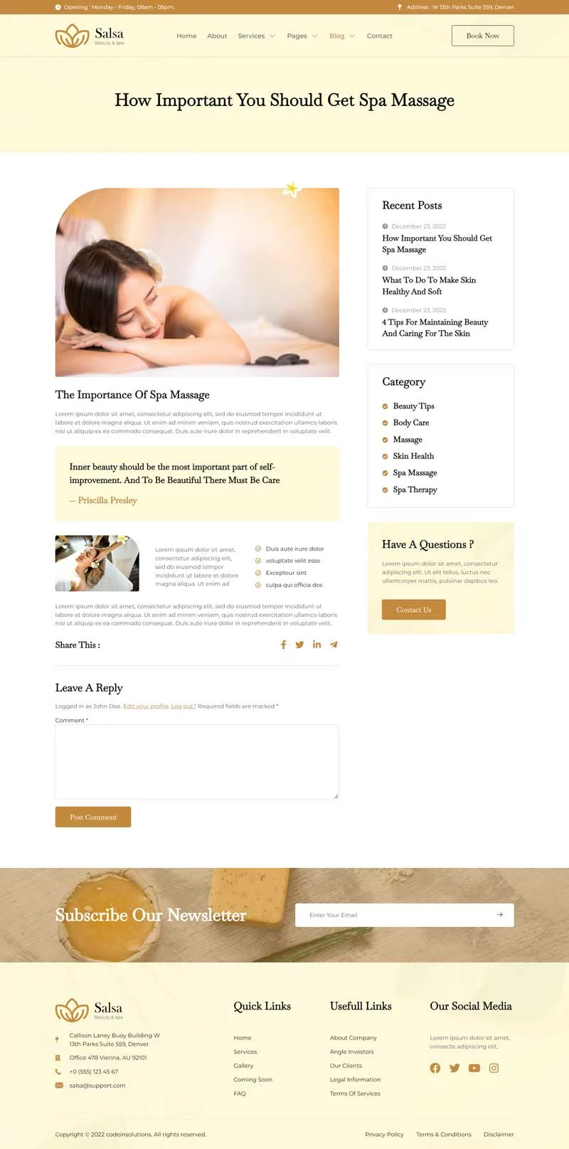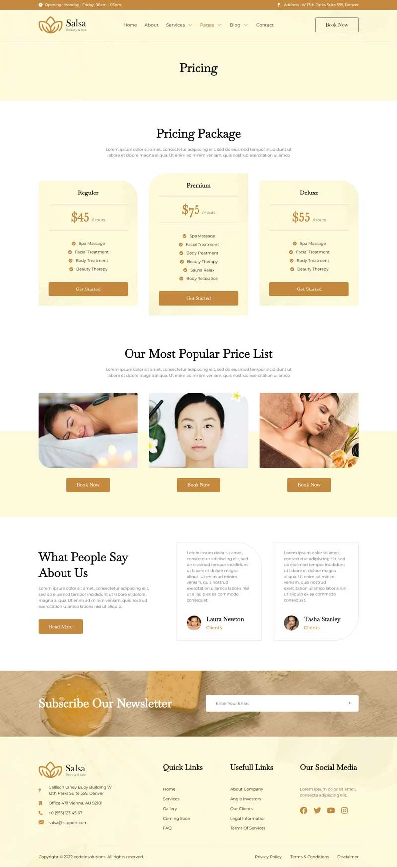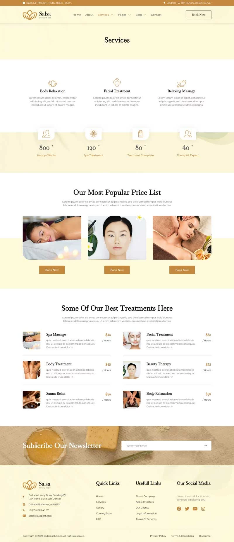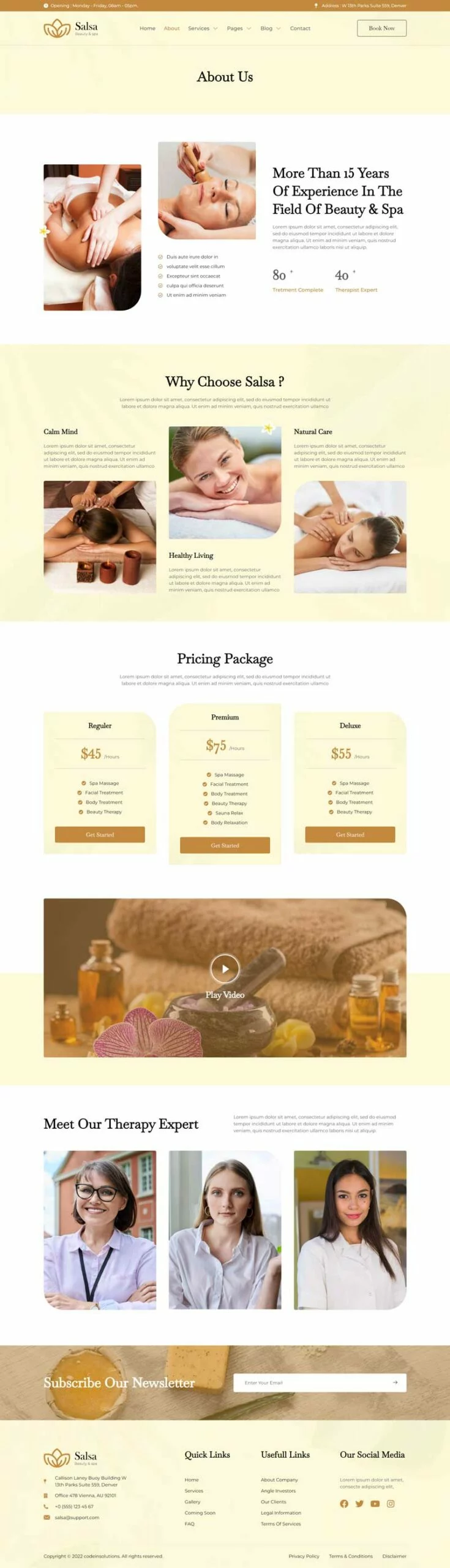 کیت قالب المنتور سالن زیبایی Salsa، یک کیت قالب مدرن است که برای سالنهای زیبایی، اسپا، مراکز سلامت، کلاسهای یوگا و مدیتیشن و سایر کسبوکارهای مرتبط با سلامت طراحی شده است. این کیت قالب با طراحی ساده و تمیز و همچنین چیدمانی 100٪ واکنشگرا، بهراحتی قابل سفارشیسازی است و هر کسی میتواند بدون نیاز به دانش کدنویسی از آن استفاده کند.