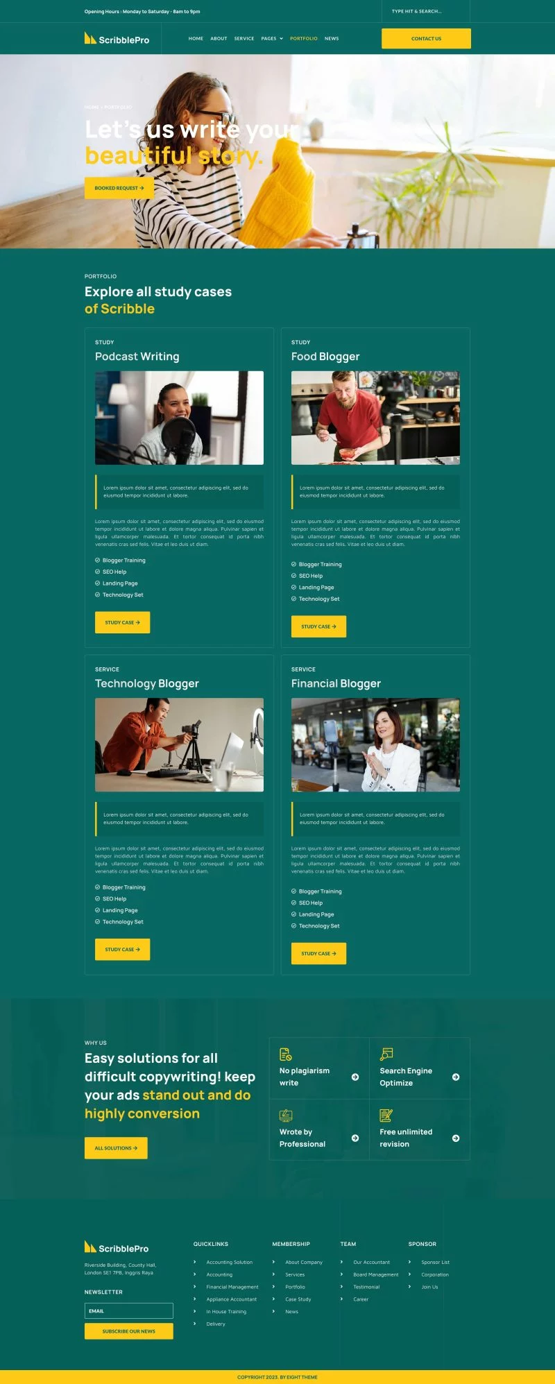 کیت قالب المنتور خدمات نوشتن محتوا ScribblePro یک ابزار کامل و حرفهای برای ایجاد وبسایتهای خدمات نوشتن محتوا است. با طراحی مدرن و تایپوگرافیک، این کیت قالب به شما امکان میدهد تا وبسایتی ایجاد کنید که جذاب و حرفهای باشد. تمامی قالبها به صورت کامل واکنشگرا و قابل سفارشیسازی هستند، بنابراین میتوانید ظاهر وبسایت خود را به دلخواه تغییر دهید. از صفحه اصلی تا صفحه پورتفولیو، همه چیز به دقت طراحی شده تا شما بتوانید مهارتها و خدمات نوشتاری خود را به بهترین شکل نمایش دهید. با استفاده از فرمهای متفرم، به راحتی میتوانید با مشتریان خود در ارتباط باشید و خبرنامهها را مدیریت کنید. با این کیت، وبسایت خدمات نوشتن خود را به سطح بالاتری ببرید و تجربه کاربری بهتری برای بازدیدکنندگان خود فراهم کنید.