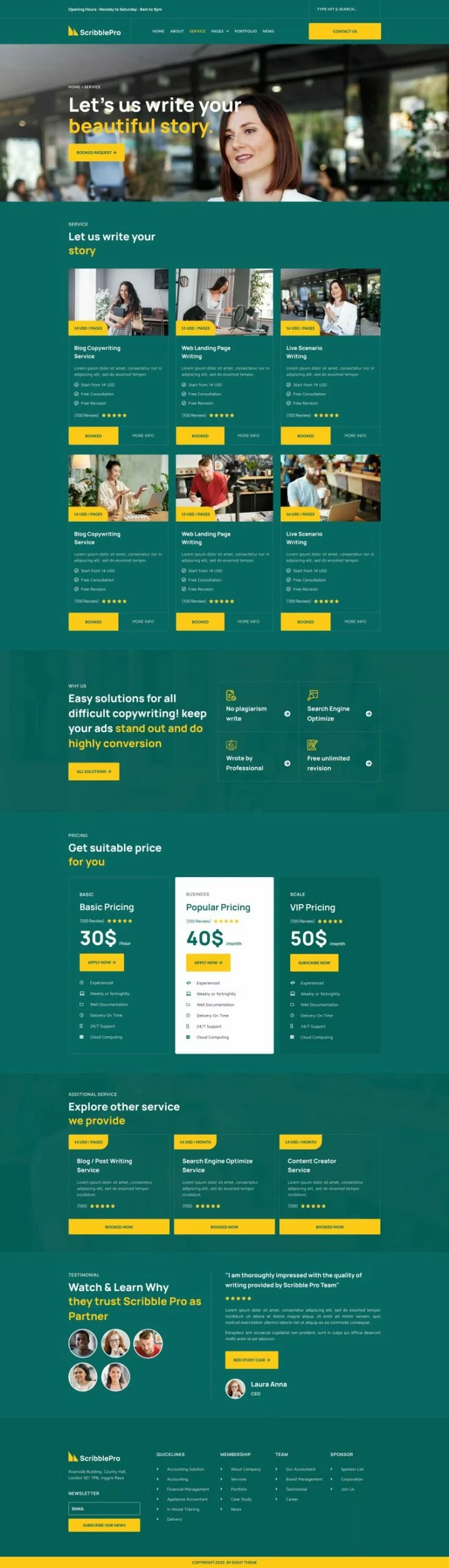 کیت قالب المنتور خدمات نوشتن محتوا ScribblePro، کسبوکار خدمات نوشتن شما را به سطح بعدی میبرد. این کیت با طراحی شیک و حرفهای، شامل 8 صفحه و چندین بلوک مفید است که به شما کمک میکند تا وبسایتی ایجاد کنید که نه تنها عالی به نظر میرسد، بلکه تجربهای کاربرپسند و شهودی برای مشتریان شما فراهم میکند. بیش از این منتظر نمانید تا کسبوکار خدمات نوشتن خود را به سطح بعدی ببرید.همین حالا کیت قالب المنتور خدمات نوشتن محتوا ScribblePro را دریافت کنید و شروع به ایجاد وبسایتی کنید که واقعاً برجسته باشد!