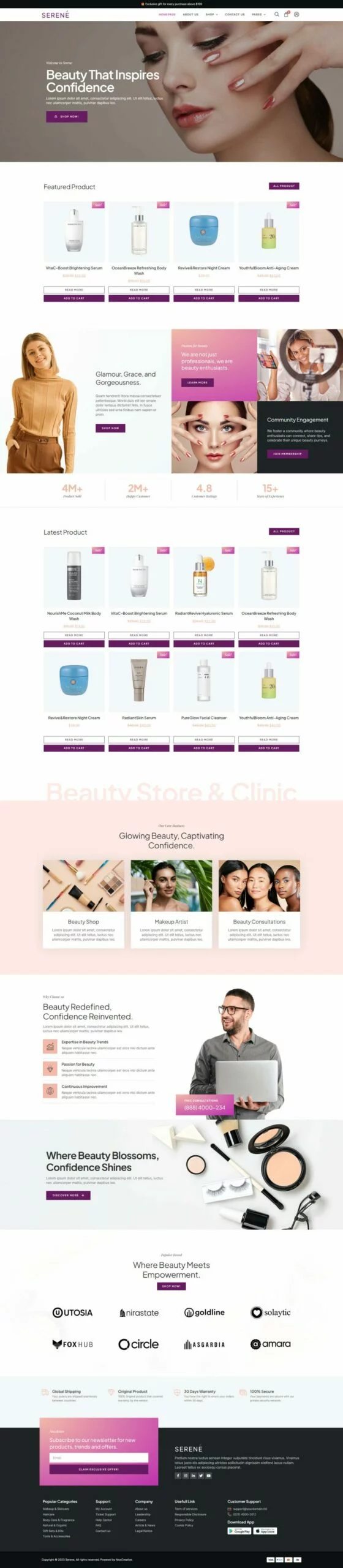 کیت قالب المنتور فروشگاه زیبایی و مراقبت از پوست Serene دارای ظاهری تمیز، مدرن و حرفهای است. شما میتوانید به راحتی فروشگاههای ووکامرس را برای فروش محصولات زیبایی با استفاده از صفحهساز المنتور برای وردپرس بسازید.