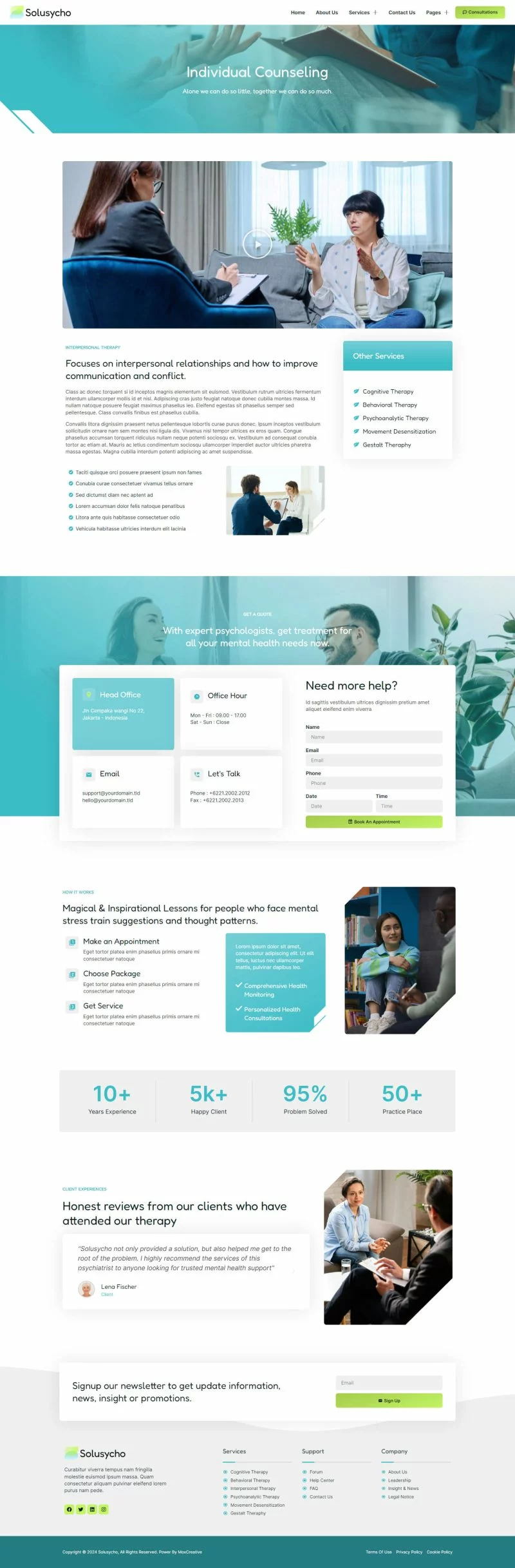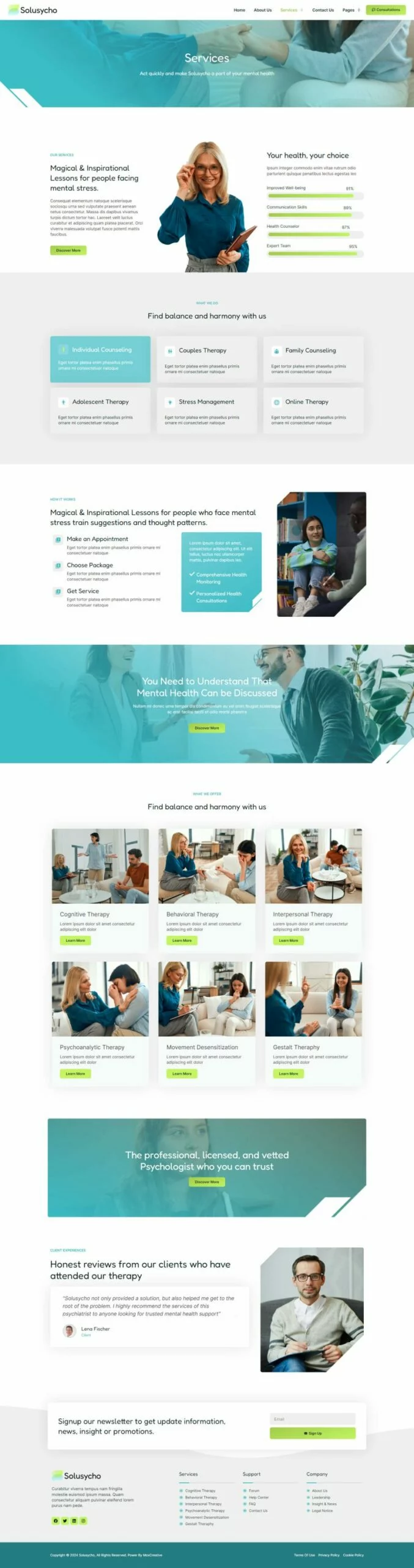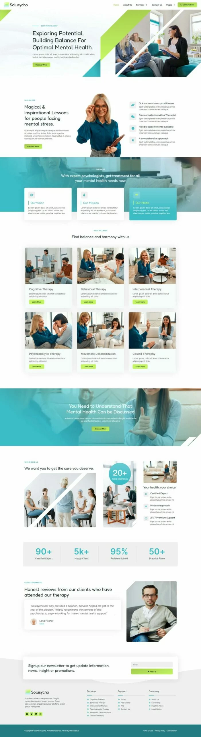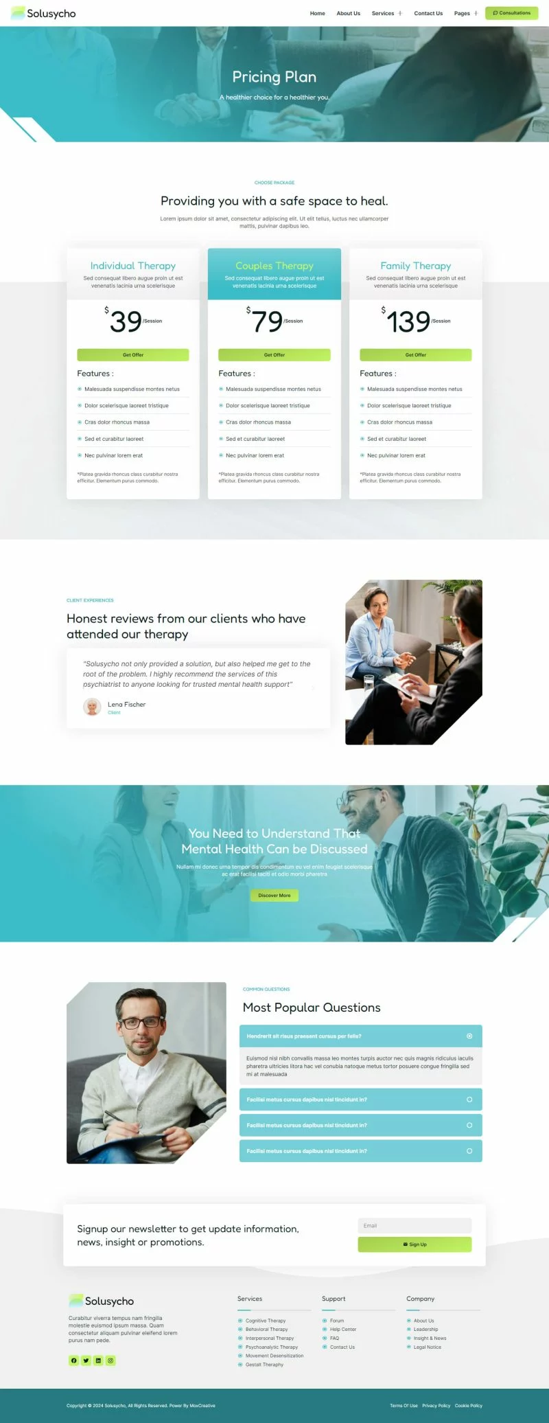 کیت قالب المنتور روانشناسی و سلامت روان Solusycho دارای بیش از 12 قالب از پیش ساخته شده با طراحی مدرن و سبک حرفهای است. شما به راحتی میتوانید هر وبسایتی مرتبط با خدمات روانشناسی و سلامت روان، مانند روانپزشکان، درمانگران، مشاوران روانشناسی آنلاین، مشاوره خانوادگی، روانشناسان فردی، کلینیکهای سلامت روان، درمان فردی، وبسایت مربیان زندگی و غیره را بسازید. تنها با کشیدن و رها کردن، بدون نیاز به کدنویسی.