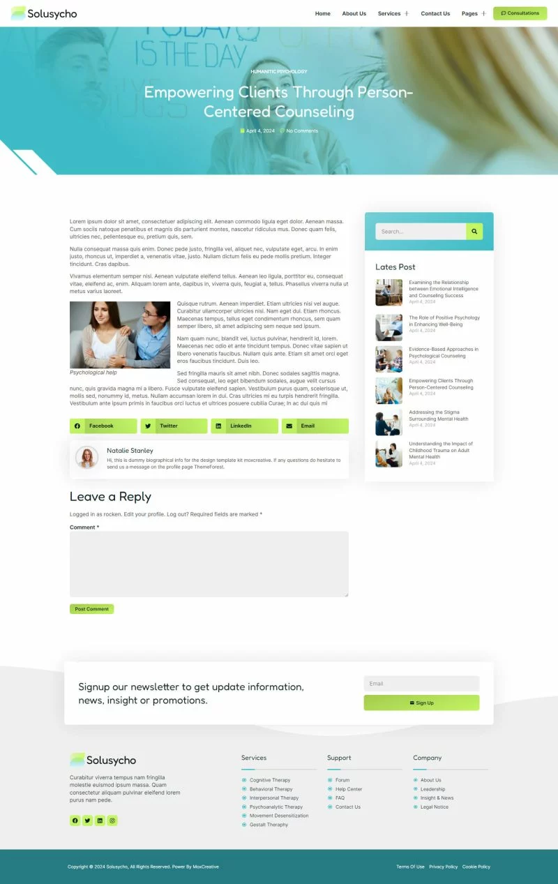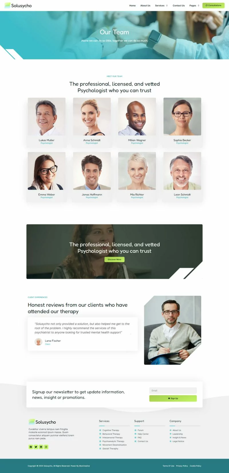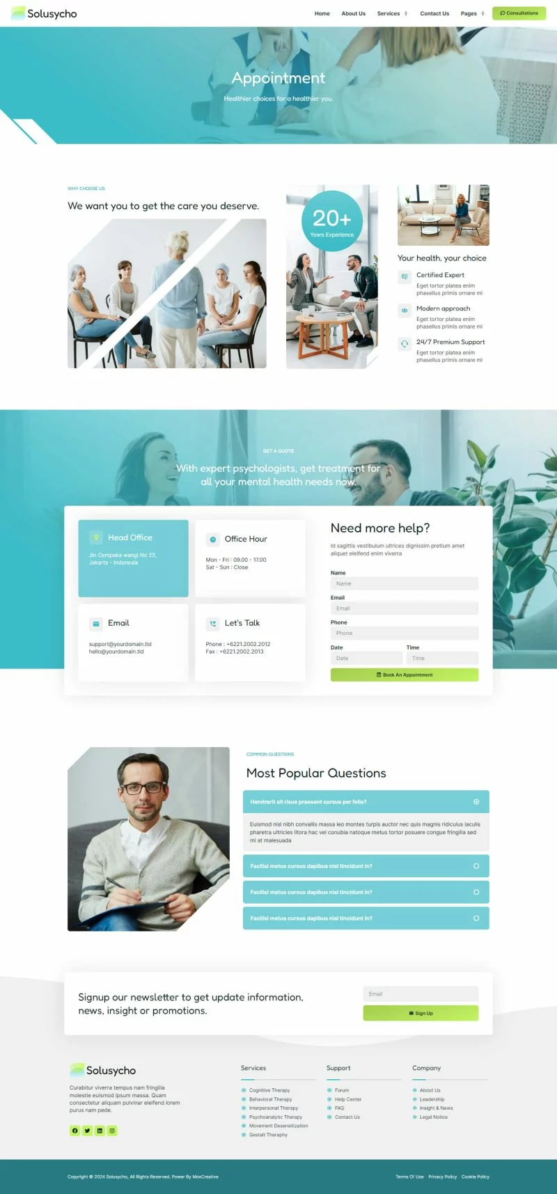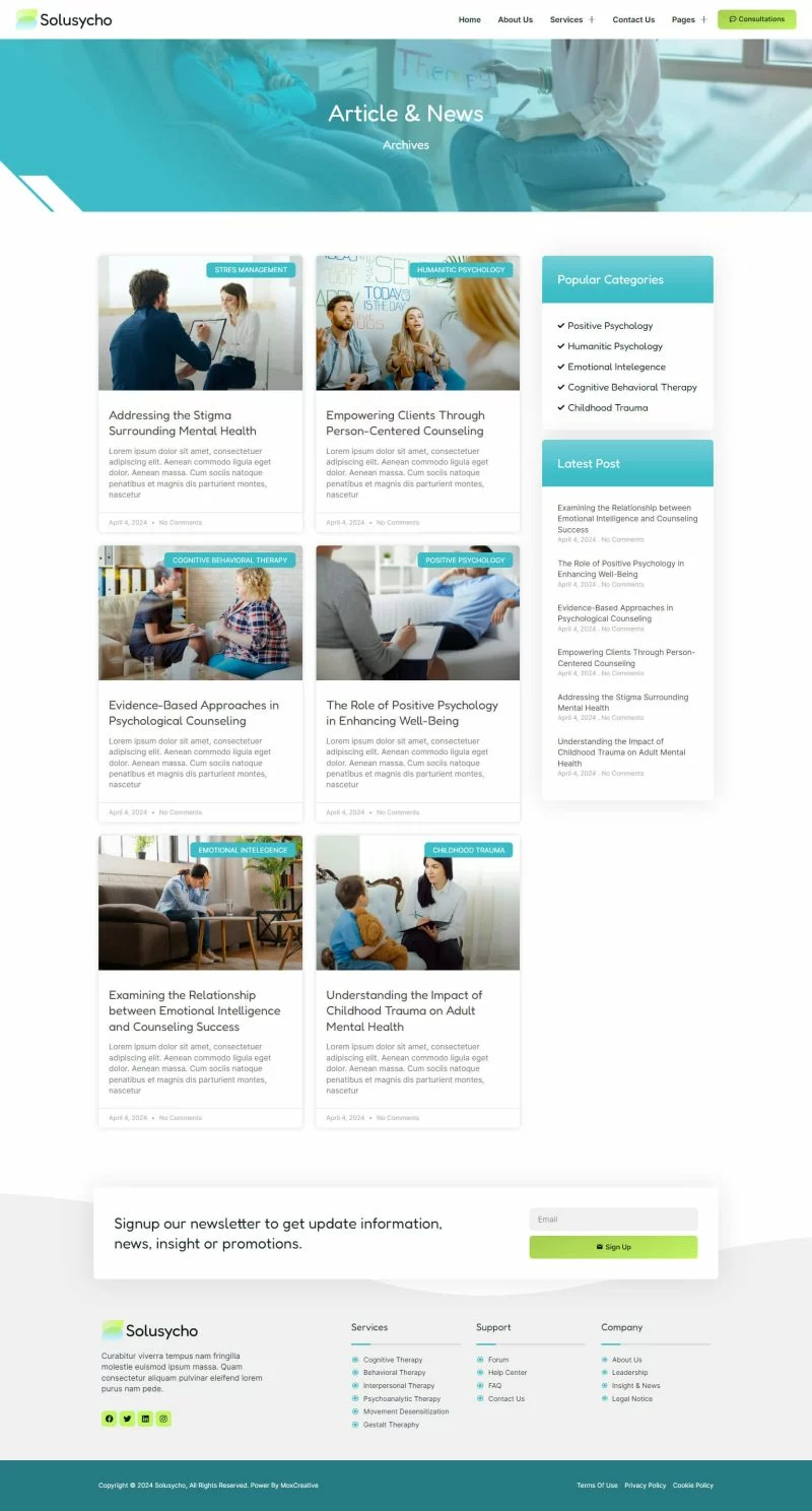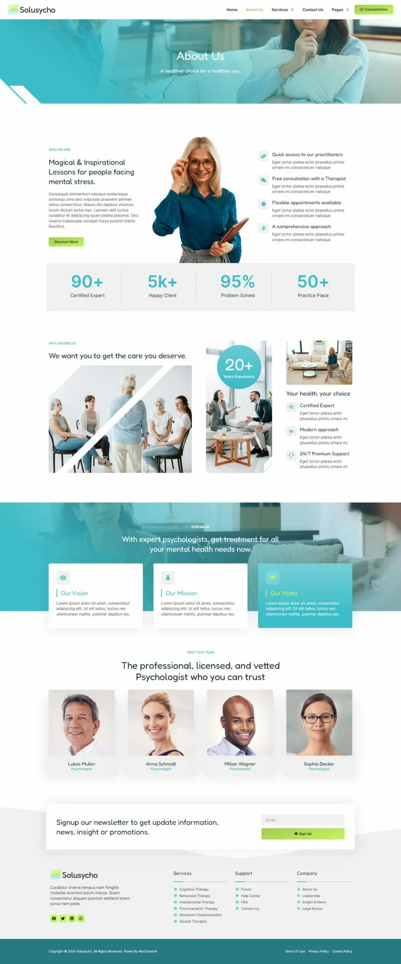 کیت قالب المنتور روانشناسی و سلامت روان Solusycho دارای بیش از 12 قالب از پیش ساخته شده با طراحی مدرن و سبک حرفهای است. شما به راحتی میتوانید هر وبسایتی مرتبط با خدمات روانشناسی و سلامت روان، مانند روانپزشکان، درمانگران، مشاوران روانشناسی آنلاین، مشاوره خانوادگی، روانشناسان فردی، کلینیکهای سلامت روان، درمان فردی، وبسایت مربیان زندگی و غیره را بسازید. تنها با کشیدن و رها کردن، بدون نیاز به کدنویسی.