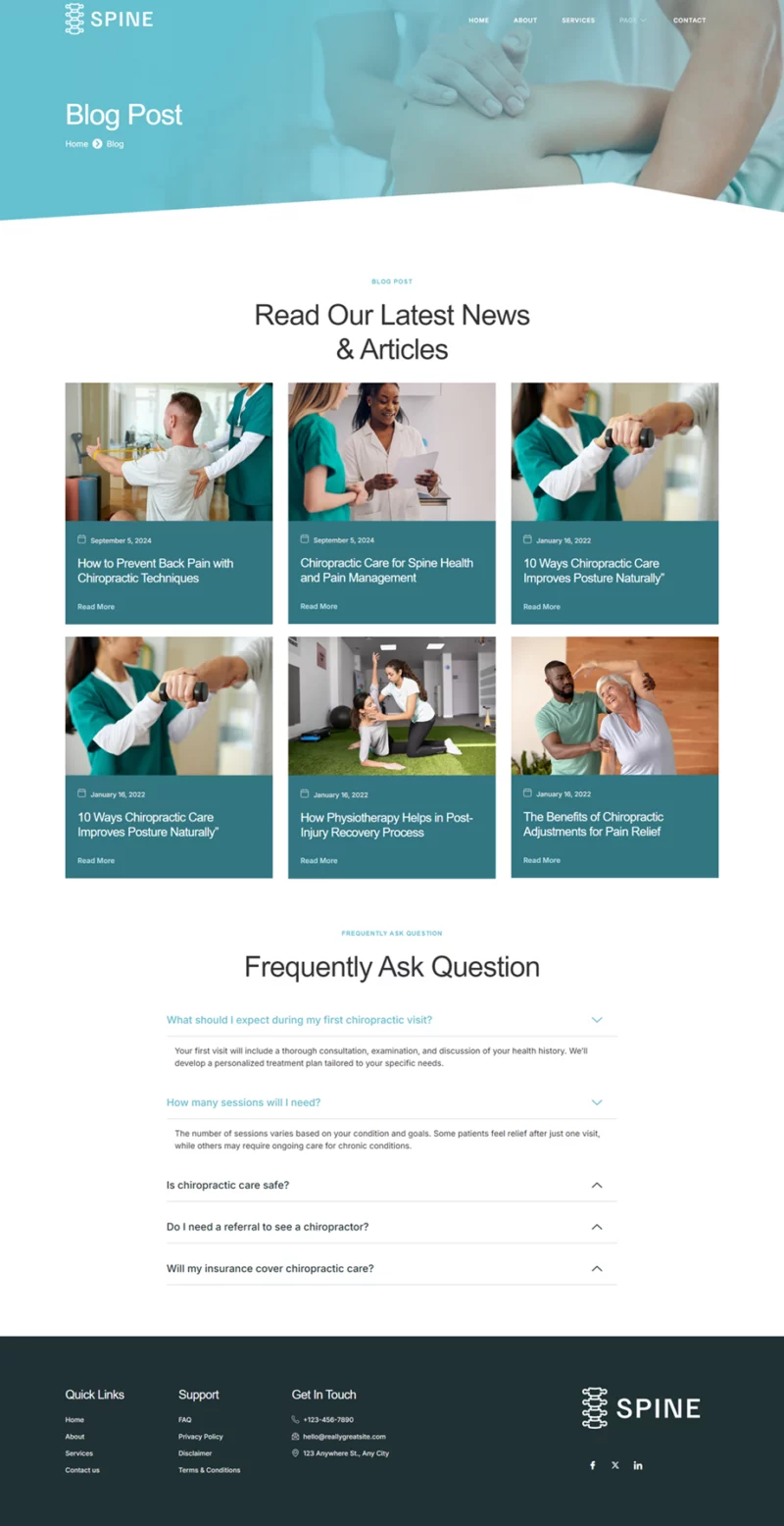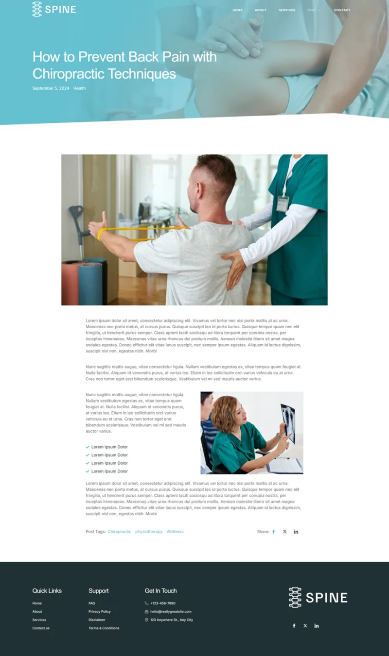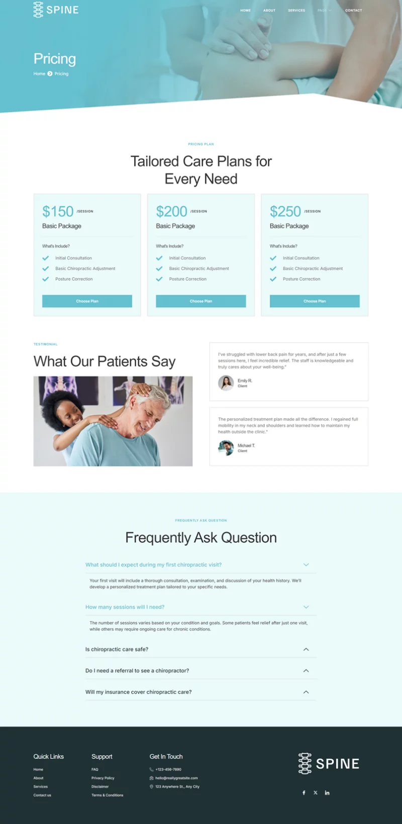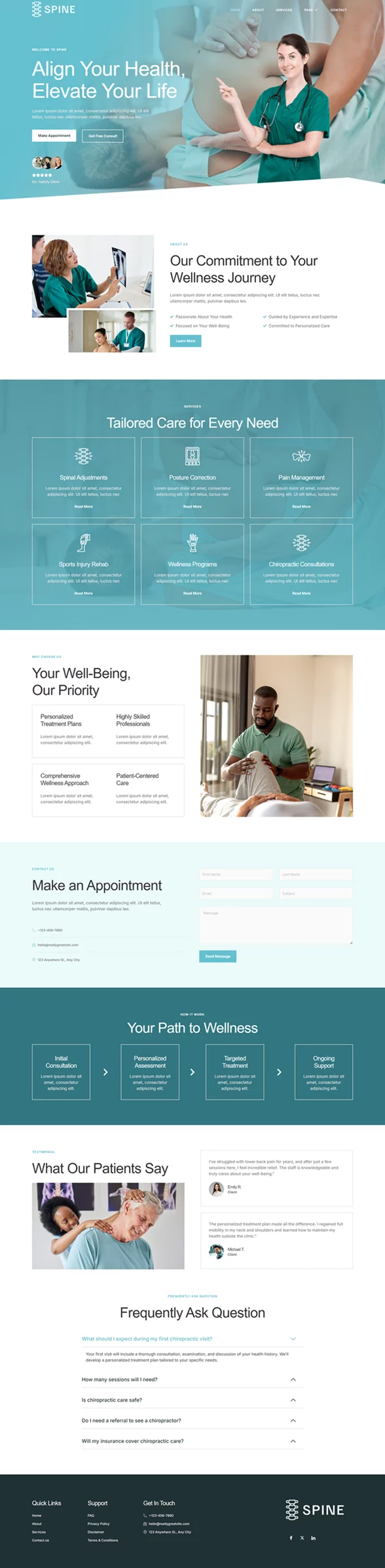 کیت قالب المنتور Spine یک راهکار جامع برای وبسایتهای خدمات کایروپراکتیک و فیزیوتراپی است که بهصورت اختصاصی برای وردپرس طراحی شده است. این کیت با دقت فراوان و با استفاده از افزونههای رایگان ساخته شده تا نیاز به توسعه پیچیده و هزینههای سنگین را برای شما حذف کند. Spine مناسب متخصصین حوزه سلامت است که به دنبال ایجاد حضور قوی و حرفهای در فضای آنلاین هستند. از جمله کاربردهای اصلی آن میتوان به کایروپراکتورها، فیزیوتراپیستها، کلینیکهای سلامت و مراکز توانبخشی اشاره کرد.