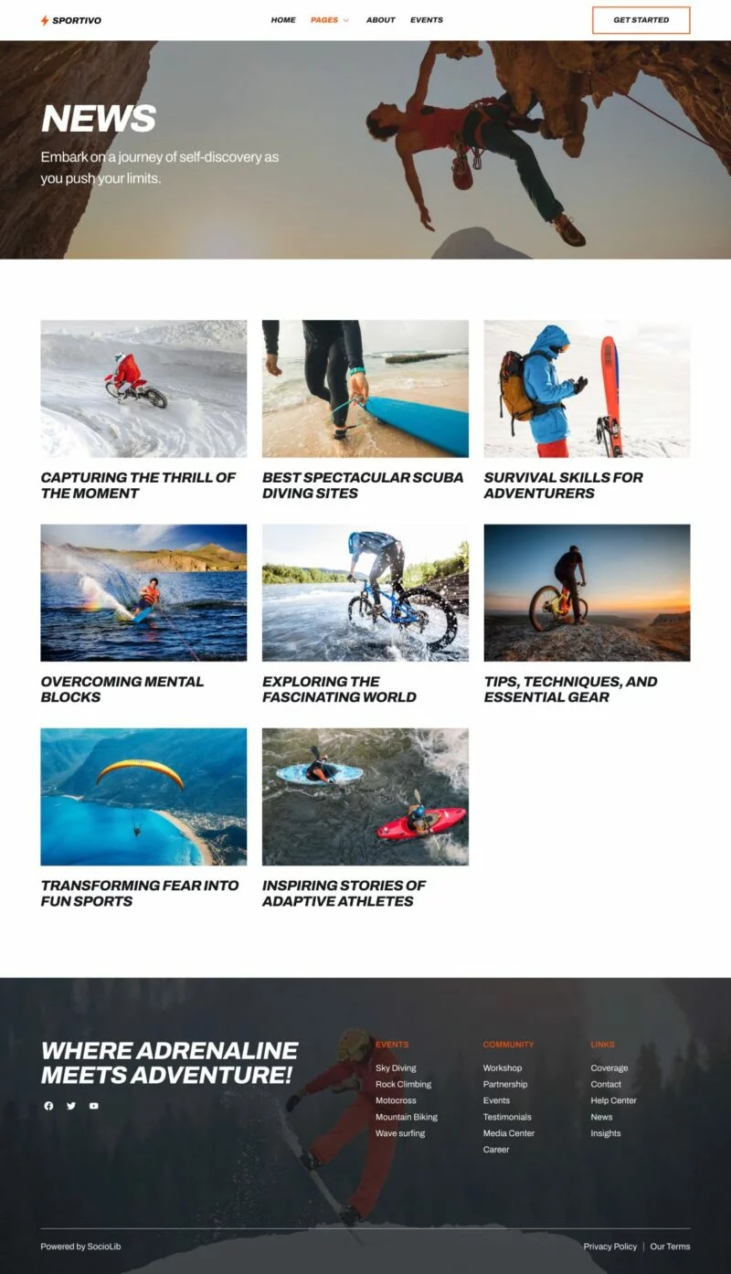 کیت قالب المنتور باشگاه ورزشی Sportivo بهطور سریع و آسان برای ایجاد وبسایتهای باشگاه و جامعه ورزشهای مخاطرهآمیز با استفاده از افزونه Elementor Page Builder برای وردپرس طراحی شده است. مناسب برای ورزشهای مخاطرهآمیز، رویدادهای ورزشی، باشگاههای ورزشی، جوامع ورزشی، ماجراجوییها، چالشها و غیره. این کیت قالب با طراحی وب مدرن و خلاقانه، به وبسایت شما احساس مدرن و حرفهای میبخشد.
