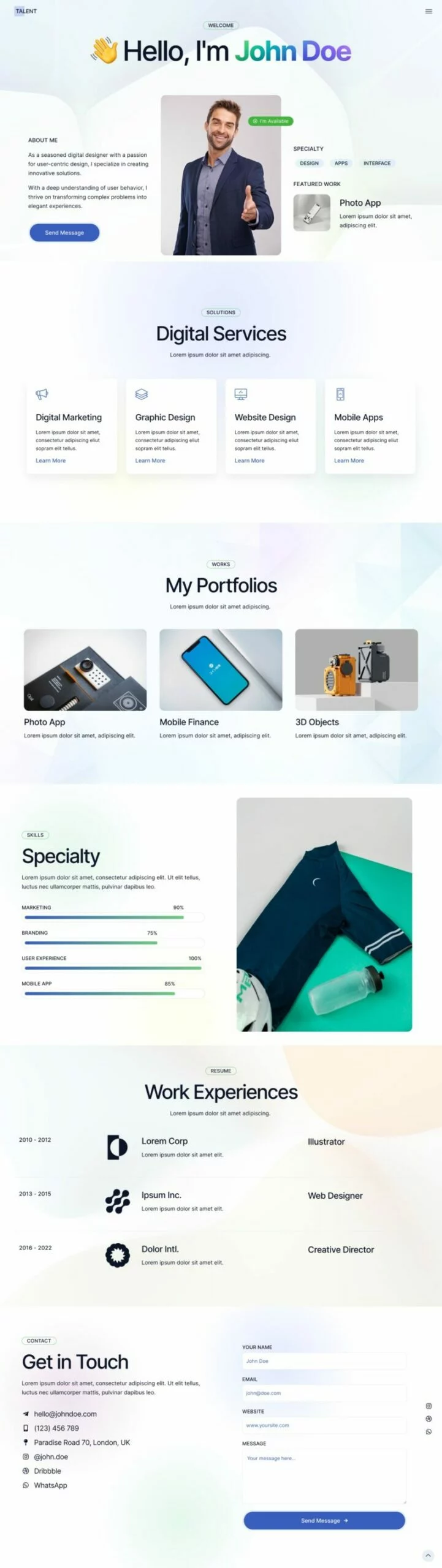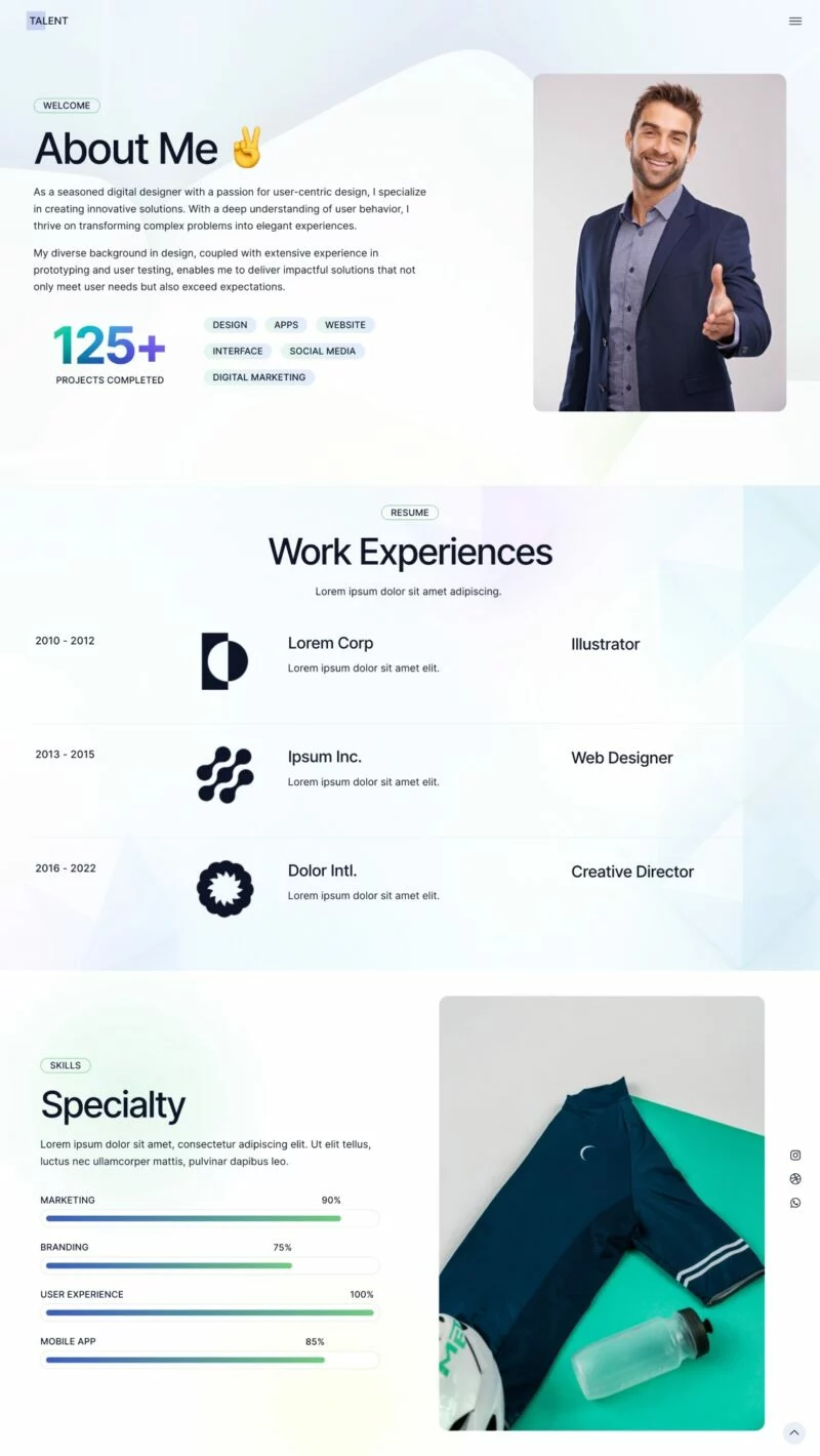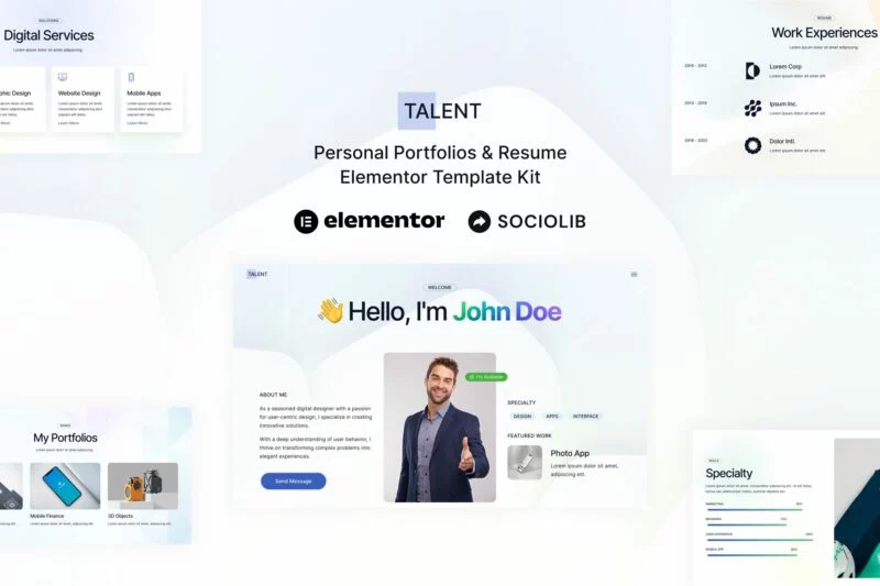 کیت قالب المنتور نمونه کار و رزومه Talent به شما امکان میدهد به سرعت و بهراحتی یک وبسایت برای نمونه کارها و رزومه شخصی با استفاده از پلاگین Elementor Page Builder برای وردپرس ایجاد کنید. این کیت مناسب برای وبسایتهای شخصی، رزومه، بیوگرافی، پروفایل، طراحان، CV، سایتهای تک صفحهای، رنگارنگ و غیره است.