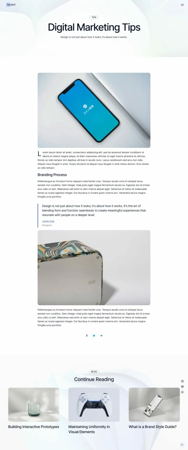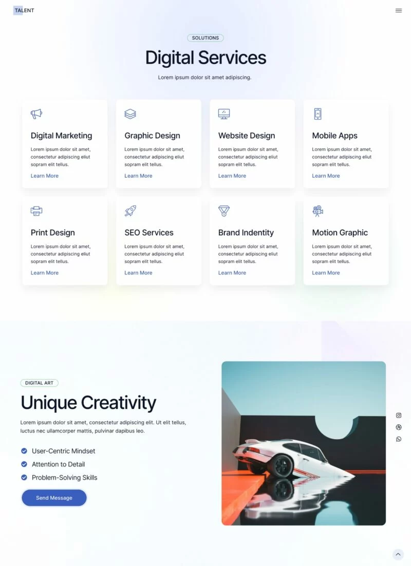 با استفاده از کیت قالب المنتور نمونه کار و رزومه Talent، وبسایت وردپرس خود را با یک طراحی مدرن و خلاقانه سبکدهی کنید تا حس و حال جدیدی به وبلاگ خود ببخشید.