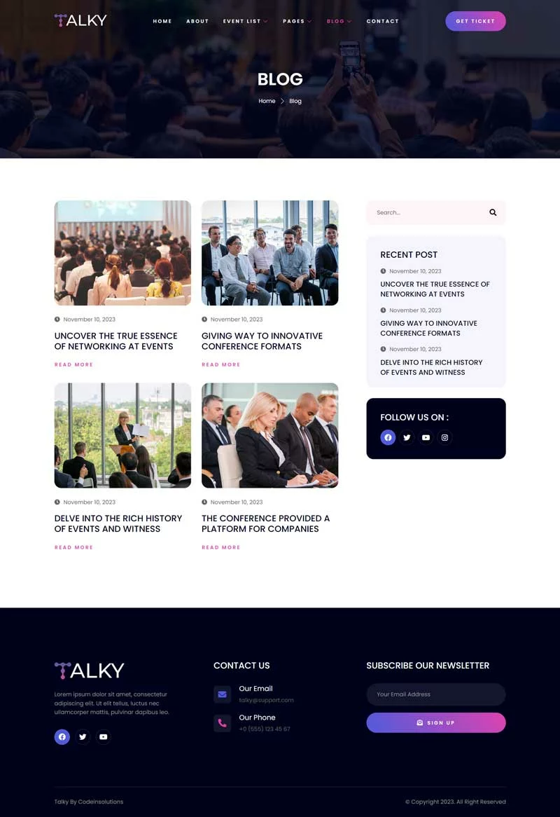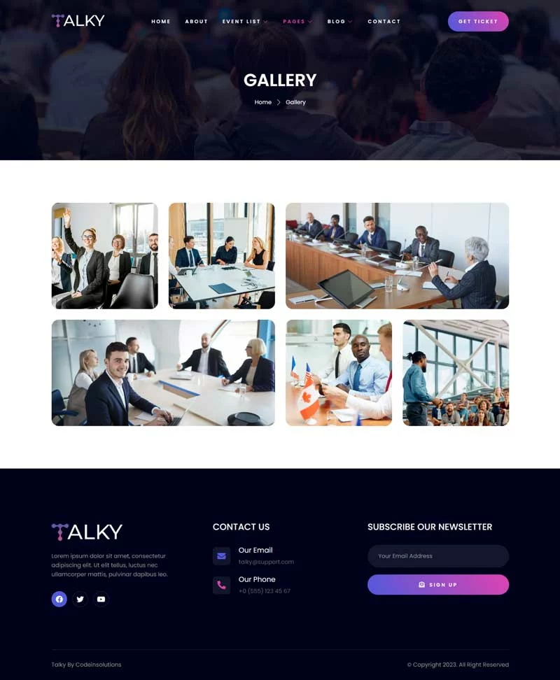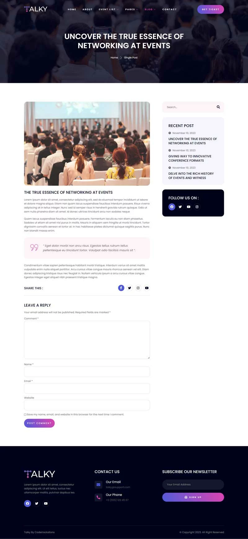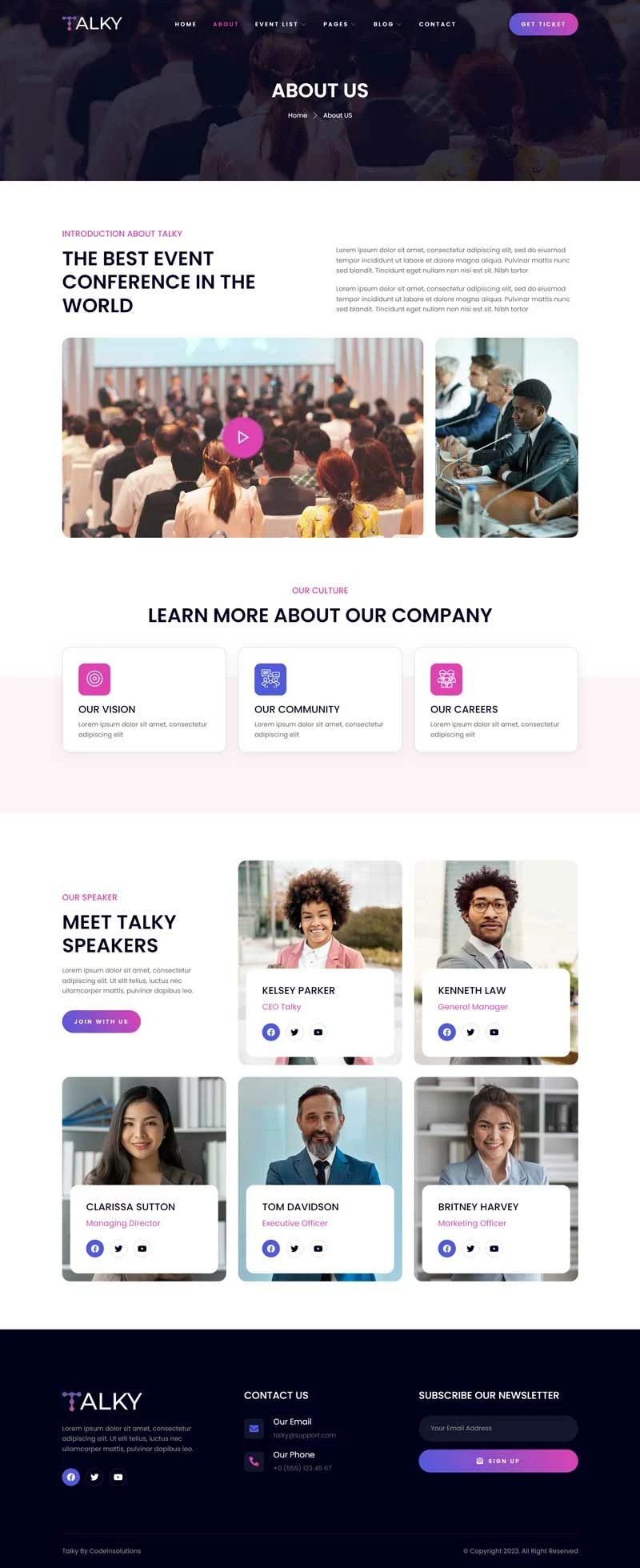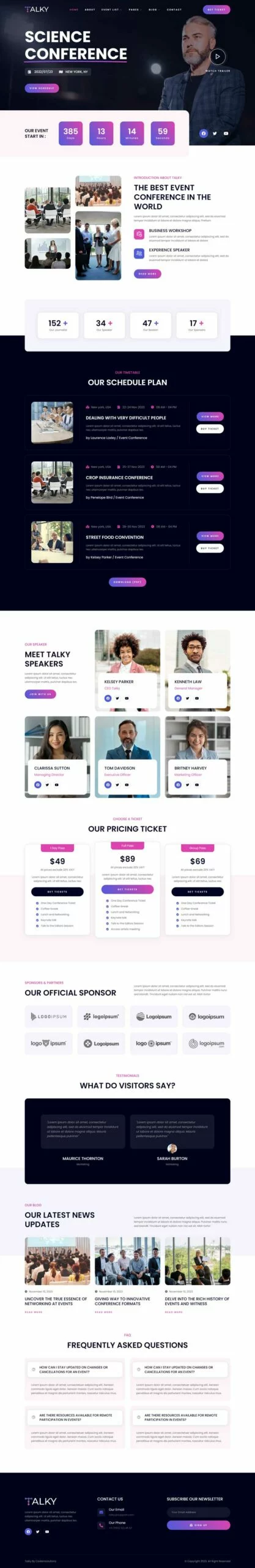 کیت قالب المنتور رویداد و کنفرانس Talky بهطور خاص برای سازماندهندگان و علاقهمندان به رویدادها طراحی شده است. این کیت با ترکیب طراحی مدرن و ویژگیهای کاربرپسند، تجربهای بینظیر برای وبسایتهای رویداد شما ارائه میدهد.