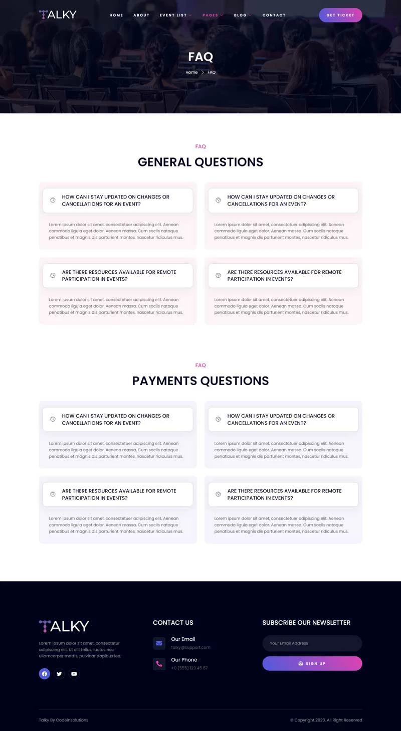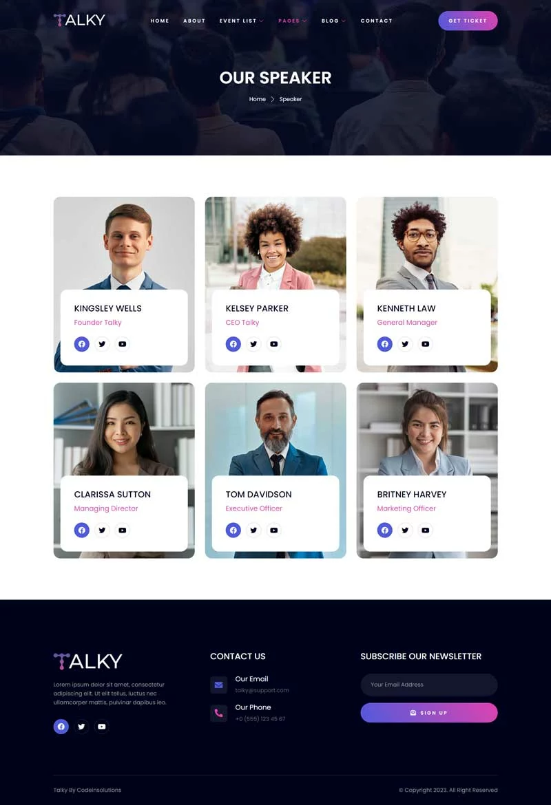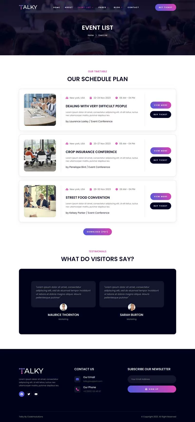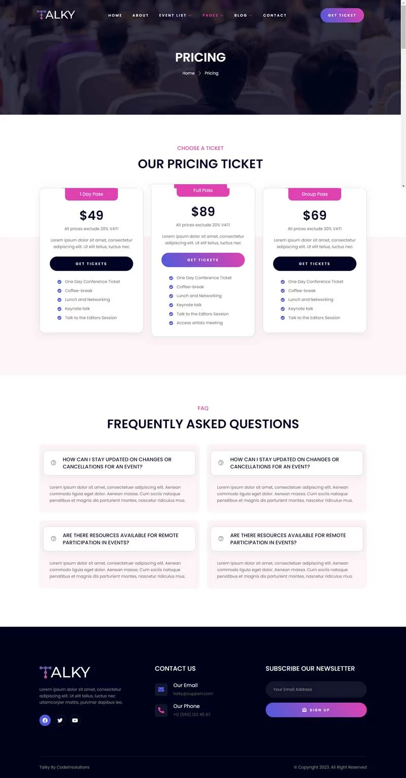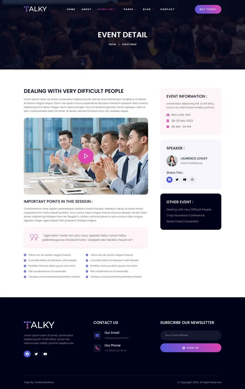 کیت قالب المنتور رویداد و کنفرانس Talky بهطور خاص برای سازماندهندگان و علاقهمندان به رویدادها طراحی شده است. این کیت با ترکیب طراحی مدرن و ویژگیهای کاربرپسند، تجربهای بینظیر برای وبسایتهای رویداد شما ارائه میدهد.