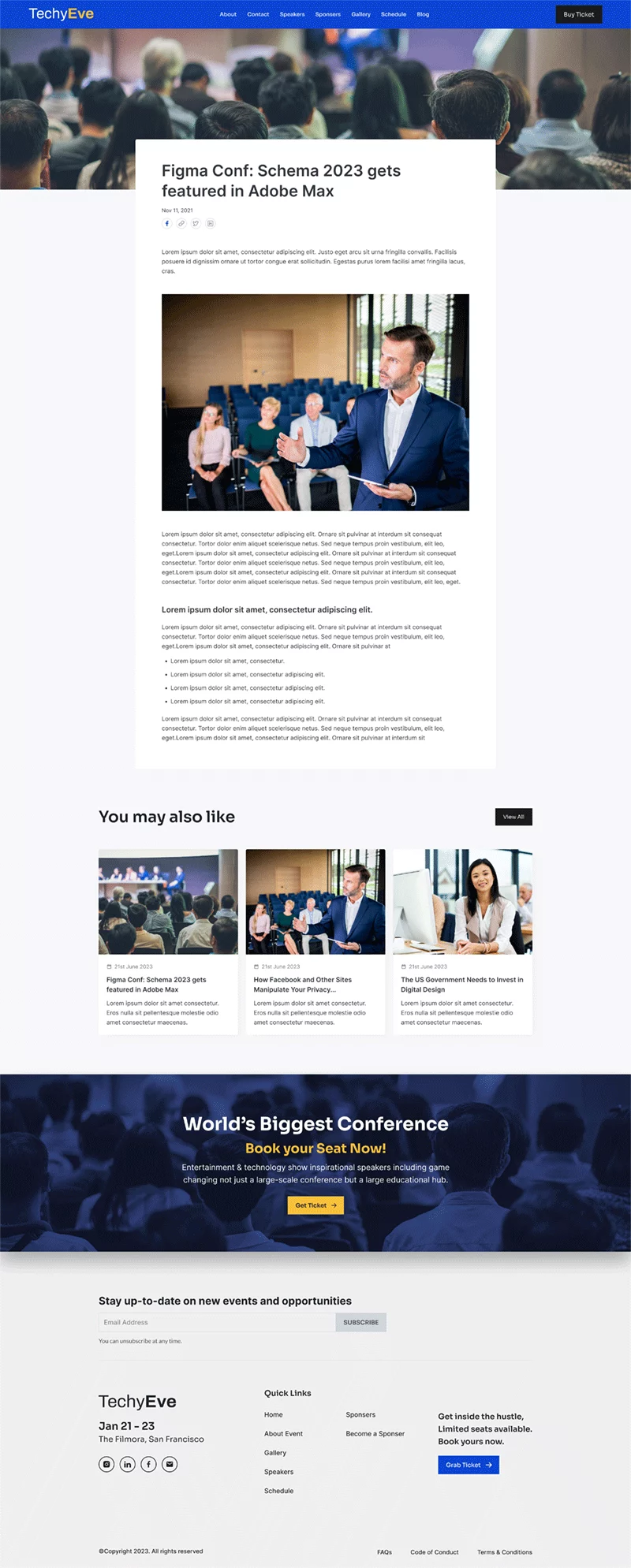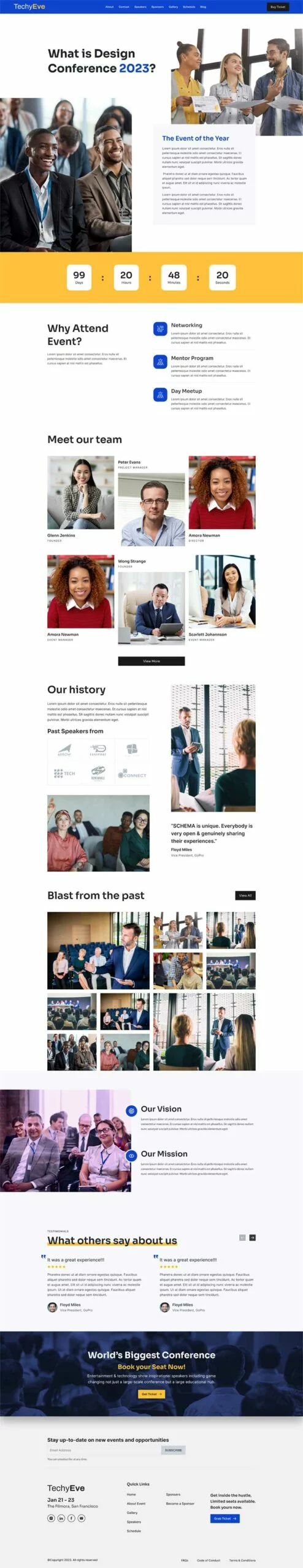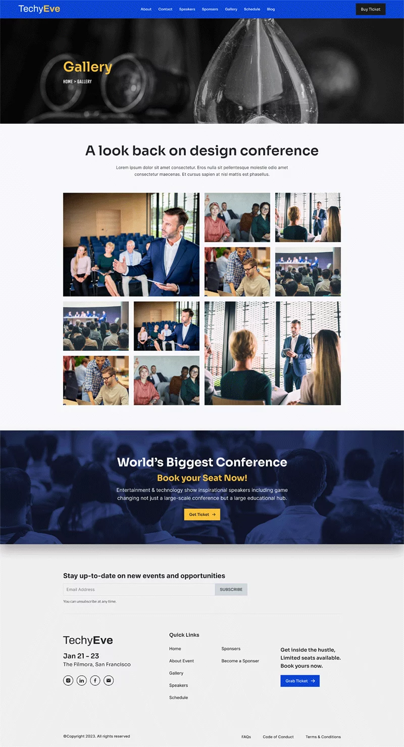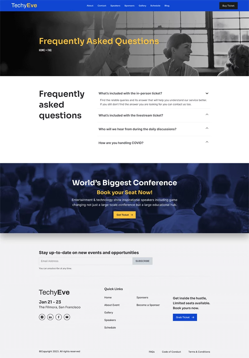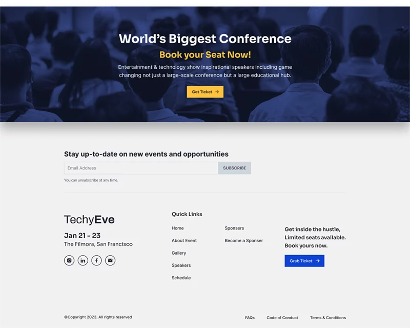 به طور کلی، کیت قالب المنتور رویداد و کنفرانس TechyEve یک انتخاب عالی برای کسانی است که میخواهند بدون نیاز به شروع از صفر، یک وبسایت حرفهای و ریسپانسیو برای رویداد یا کنفرانس خود ایجاد کنند. توجه داشته باشید که برای استفاده از برخی از قالبها و ویژگیها، ارتقاء به Elementor Pro (که به صورت جداگانه خریداری میشود) مورد نیاز است.