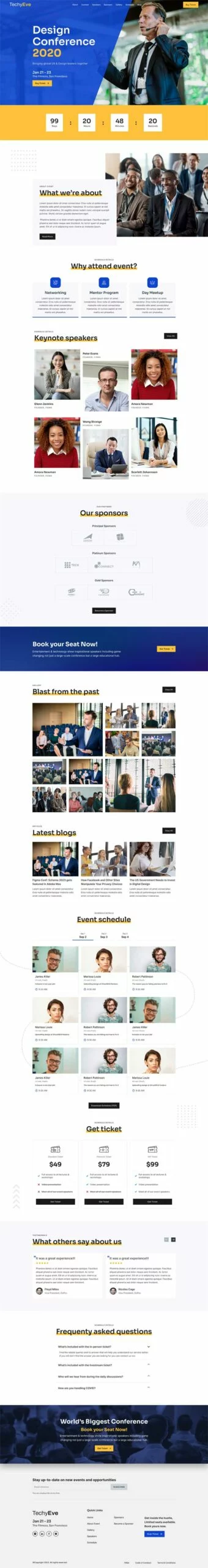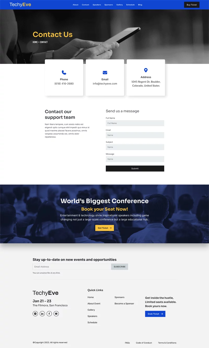 کیت قالب المنتور رویداد و کنفرانس TechyEve همراه با صفحات پیشطراحی شده برای خانه، درباره ما، سخنرانان، برنامه، قیمتگذاری، حامیان و صفحات دیگر ارائه میشود. این صفحات را میتوان به راحتی با استفاده از سازنده صفحه المنتور سفارشی کرد، که به شما امکان میدهد عناصر را کشیده و رها کنید، رنگها و فونتها را تغییر دهید و محتوای خود را اضافه کنید.