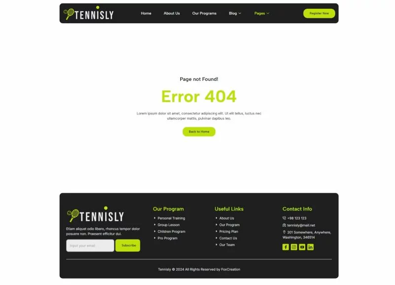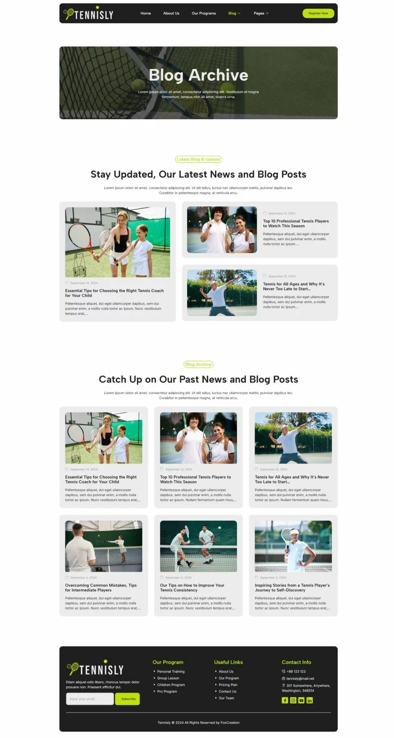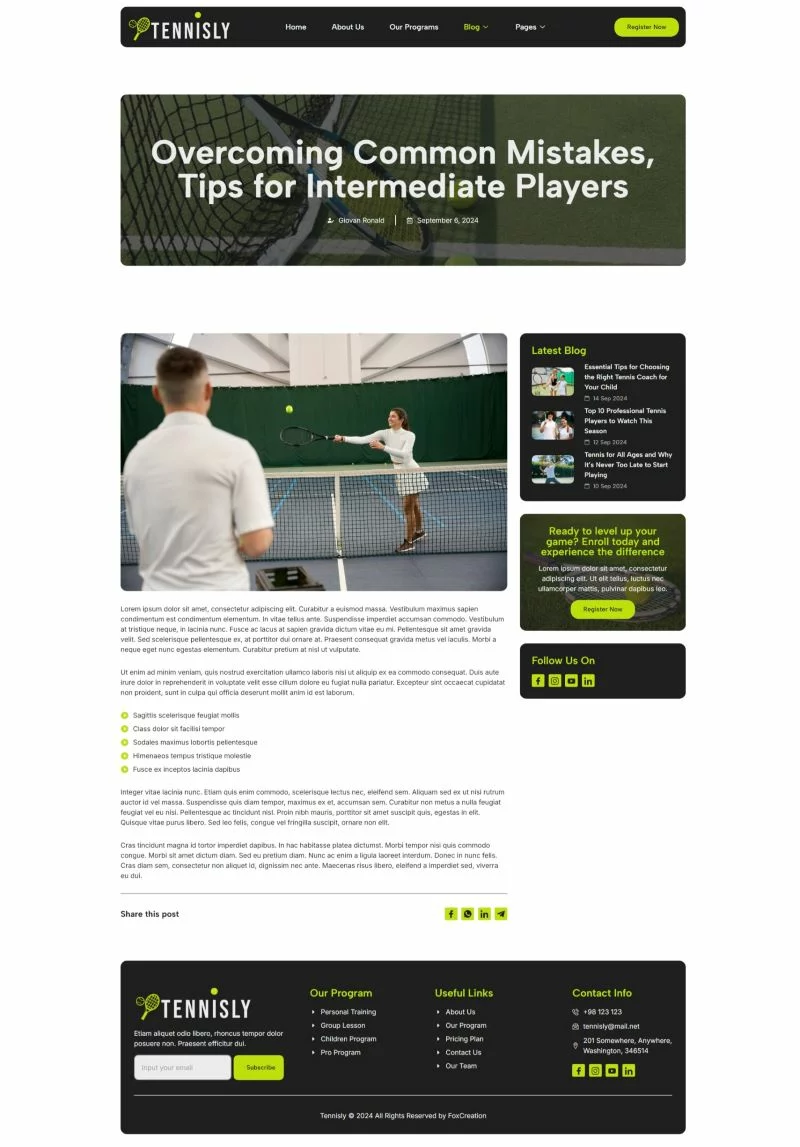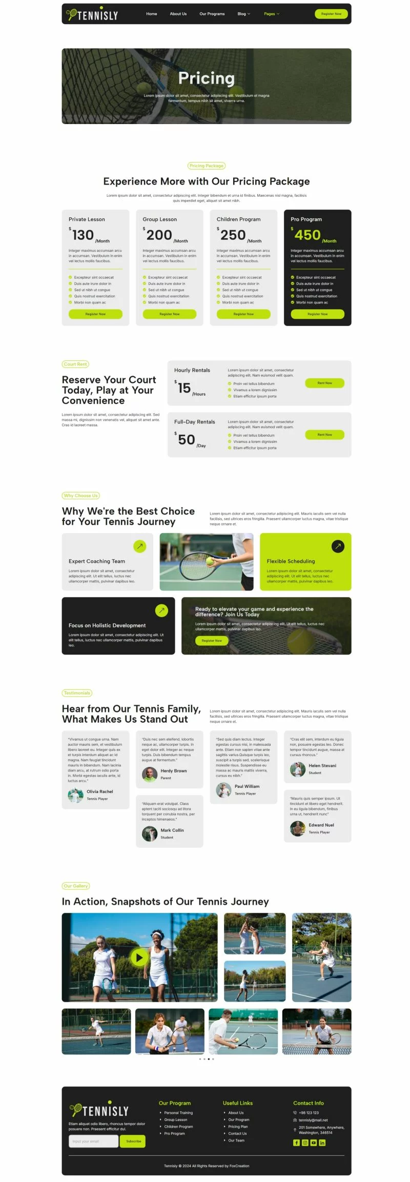 قالب Tennisly دارای بیش از 10 صفحه از پیشساخته است که به شما کمک میکند تا بدون اتلاف وقت، تمامی صفحات مورد نیاز برای وبسایت آموزشی و ورزشی خود را آماده کنید.