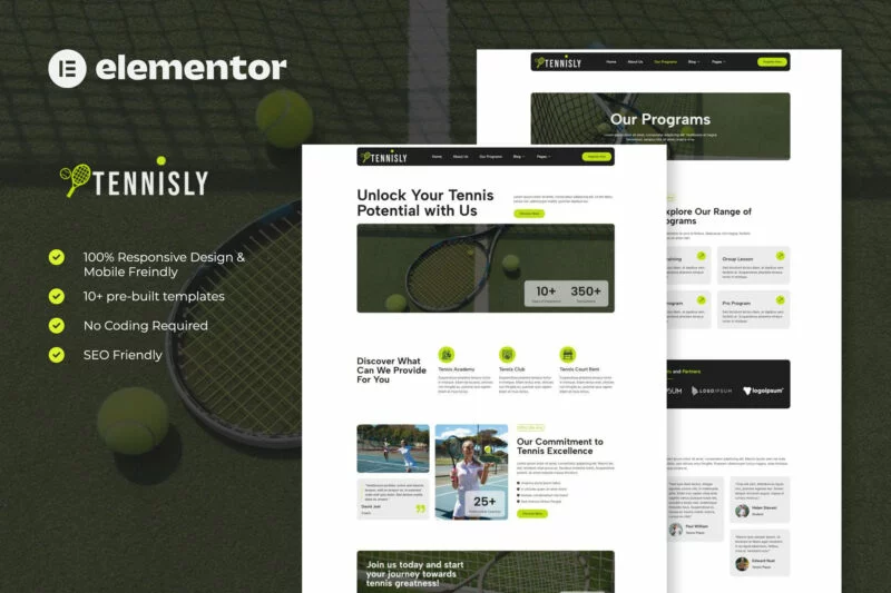 کیت قالب المنتور باشگاه ورزشی تنیس Tennisly برای استفاده با قالب رایگان Hello Elementor بهینهسازی شده است اما با سایر قالبهای سازگار با المنتور نیز قابل استفاده است.