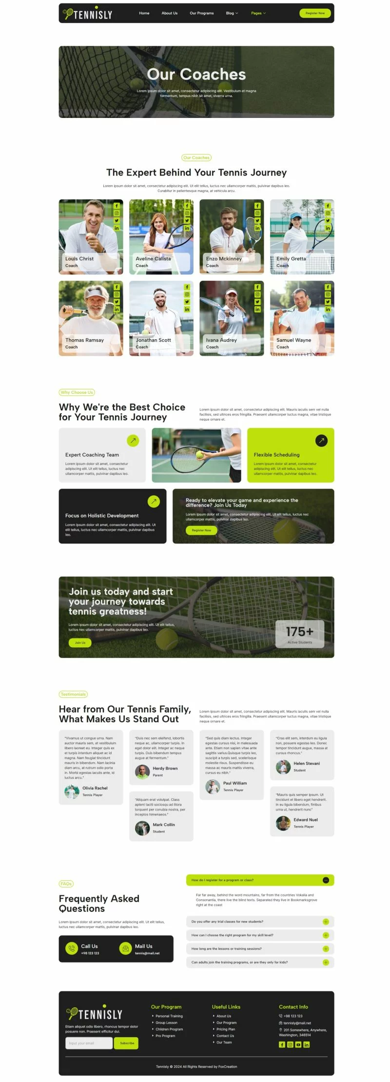 قالب Tennisly یک کیت المنتور مدرن و ورزشی برای وبسایتهای مربوط به آموزشگاههای تنیس است. این کیت برای کسبوکارهای مرتبط با آکادمی تنیس، باشگاههای تنیس، دورههای آموزشی تنیس، اجاره زمین تنیس و سایر خدمات مرتبط با مربیان و ورزشکاران طراحی شده است. این قالب به شما امکان میدهد تا به راحتی تخصص خود را در زمینه تنیس و ورزشهای مرتبط نمایش دهید.