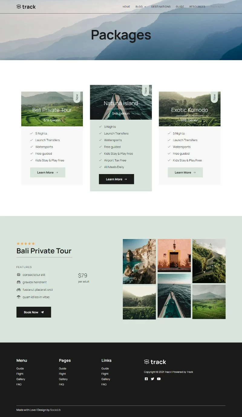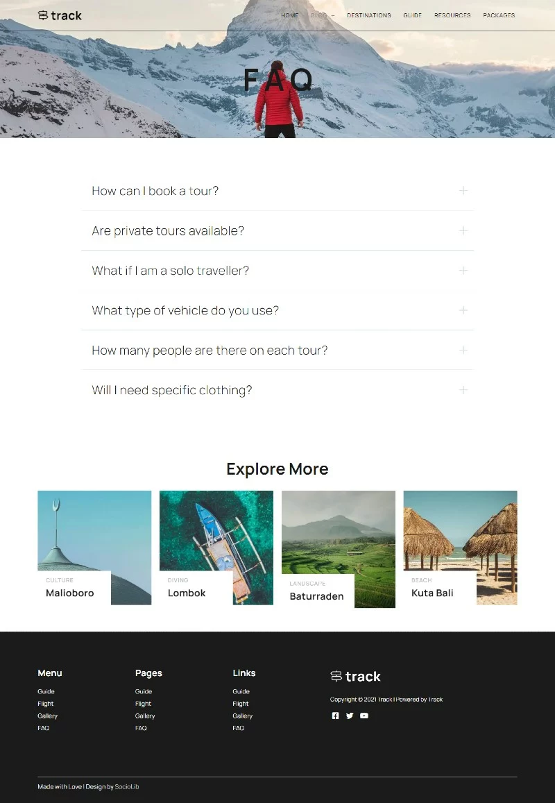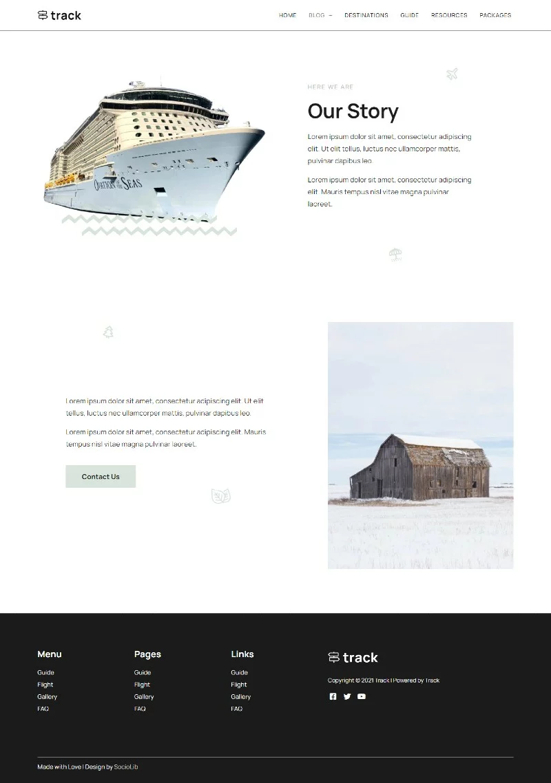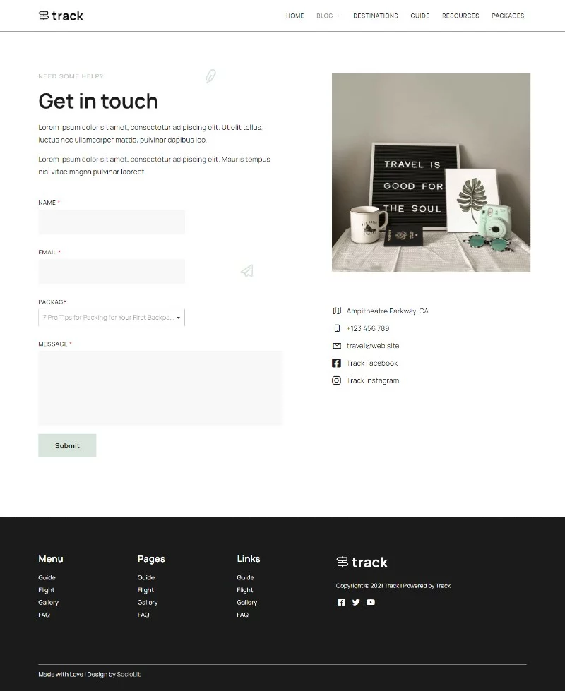 کیت قالب المنتور وبلاگ سفر Track برای ساخت سریع و آسان وبسایتهای وبلاگ راهنمای سفر با استفاده از افزونه صفحهساز المنتور برای وردپرس است. این کیت برای استفاده با قالب رایگان Hello Elementor بهینهسازی شده، اما میتوان آن را با اکثر قالبهایی که از المنتور پشتیبانی میکنند، استفاده کرد.