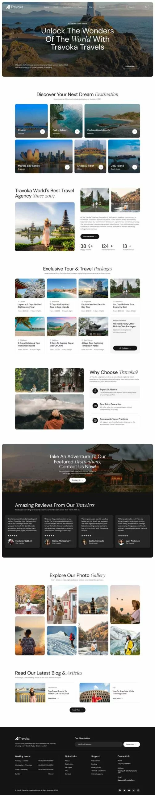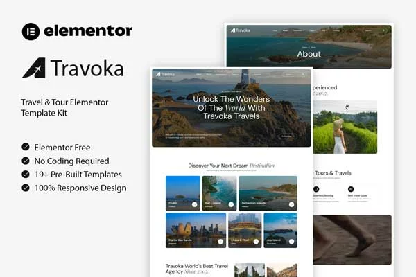 کیت Travoka شامل بیش از 19 صفحه حرفهای از پیش ساخته شده است که به شما این امکان را میدهد تا یک وبسایت سفر و گردشگری شگفتانگیز ایجاد کنید. بدون نیاز به دانش کدنویسی، با استفاده از رابط کشیدن و رها کردن Elementor، میتوانید به راحتی قالب را شخصیسازی کنید؛ رنگها را انتخاب کنید، محتوای خود را بارگذاری کنید و الهامبخش رویاهای سفر کاربران شوید!