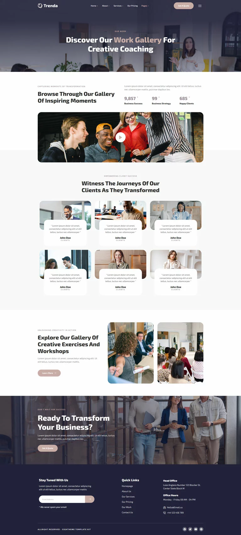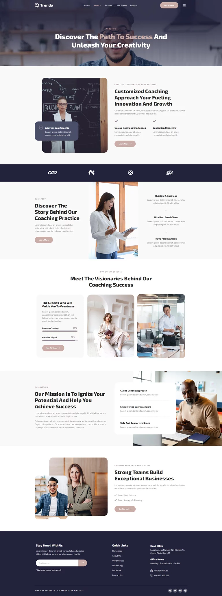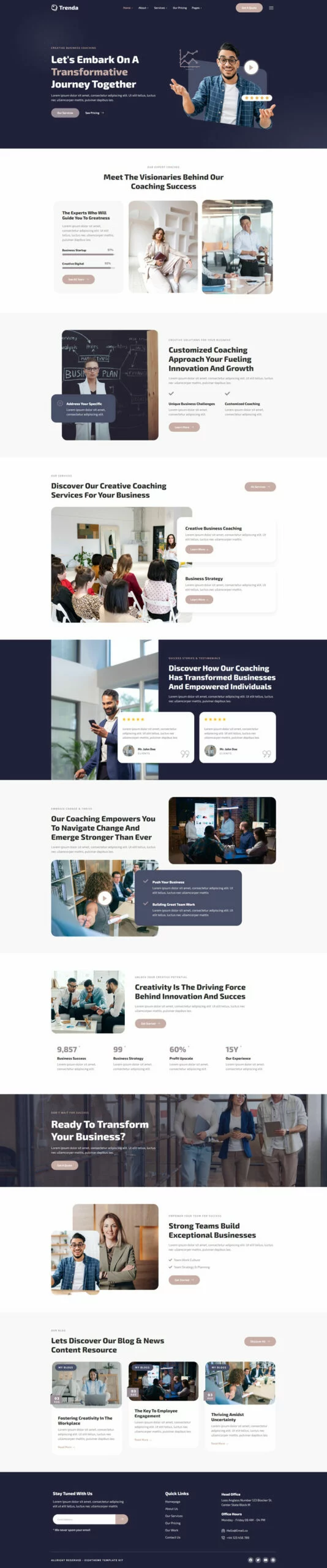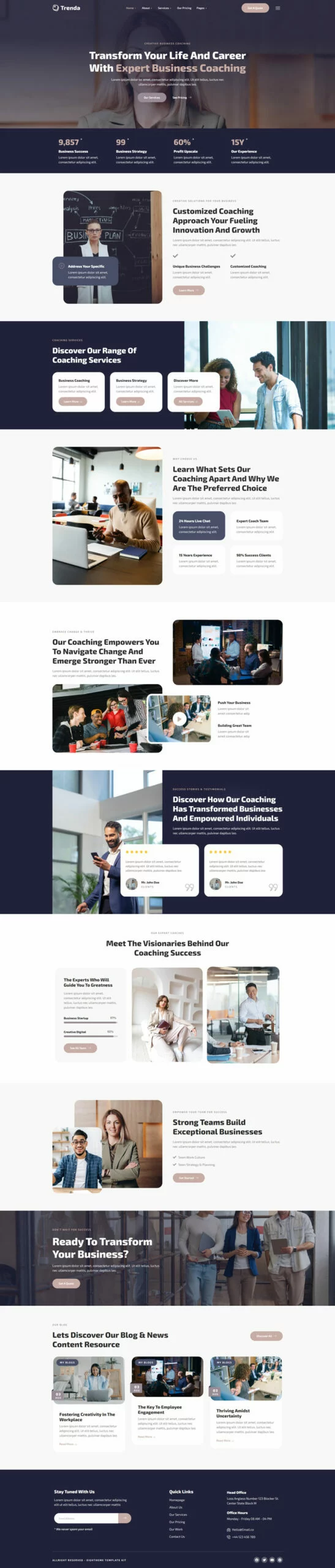 کیت قالب المنتور مربیگری کسب و کار Trenda، تمامی ابزارهای لازم برای ایجاد یک وبسایت حرفهای و جذاب را در اختیار شما قرار میدهد. این کیت با استفاده از افزونه رایگان المنتور و بدون نیاز به کدنویسی، به شما امکان میدهد تا به سرعت و به راحتی یک وبسایت تمیز و زیبا برای کسبوکار مربیگری خود ایجاد کنید.