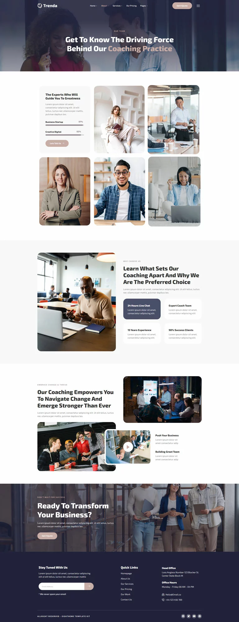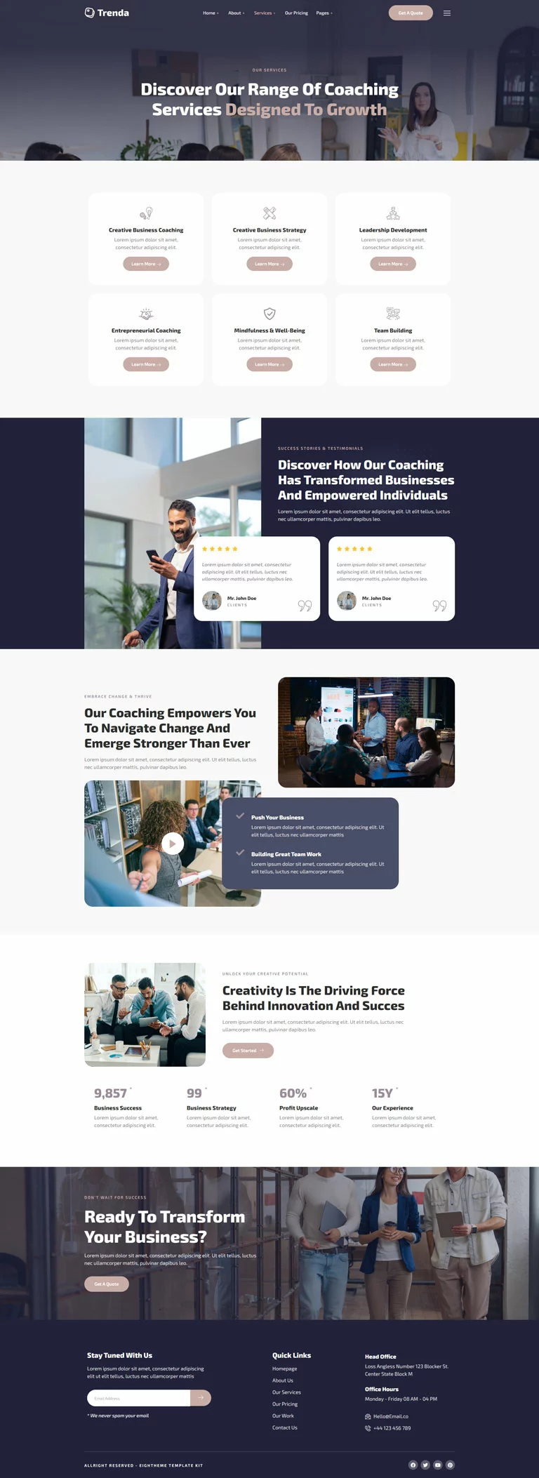 کیت قالب المنتور مربیگری کسب و کار Trenda برای مربیگری کسب و کار خلاق یک مجموعه از طرحها برای افزونه صفحهساز المنتور وردپرس است که برای استفاده با نسخه رایگان المنتور طراحی شده است. این کیت قالب با اکثر تمها سازگار است و برای استفاده با تم رایگان Hello Elementor بهینهسازی شده است.