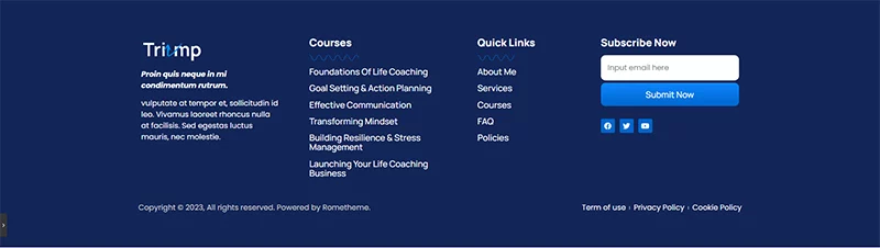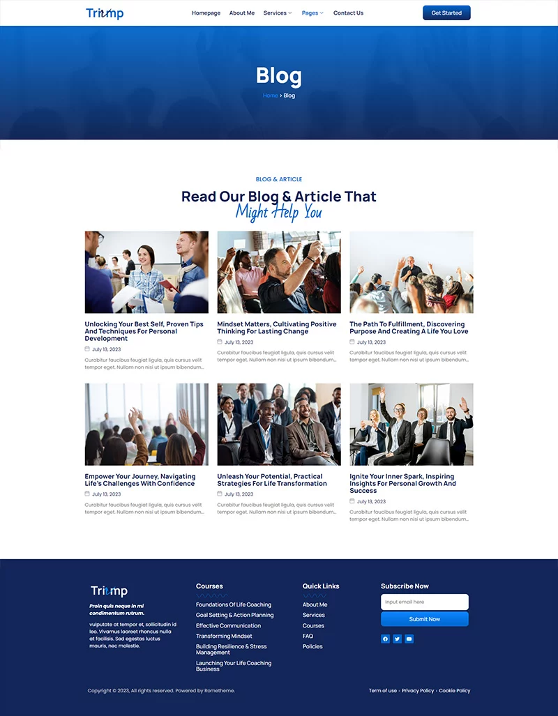 کیت قالب المنتور مشاوره Triump به طور خاص برای وبسایتهای مربی زندگی و انگیزهدهنده طراحی شده است! این کیت قالب شامل مجموعهای از قالبهای ایدهآل برای خدمات مختلف از جمله وبسایتهای مربی کسبوکار، سخنرانان، مربیان، انگیزهدهندگان، مشاوران، دورههای آنلاین، درمانگران و آموزش کسبوکار است. این کیت دارای طراحی مدرن و منحصربهفرد با یک طرحبندی 100٪ واکنشگرا، نصب آسان و سفارشیسازی بسیار راحت است زیرا با استفاده از المنتور ساخته شده است و نیازی به نوشتن یک خط کد ندارید!