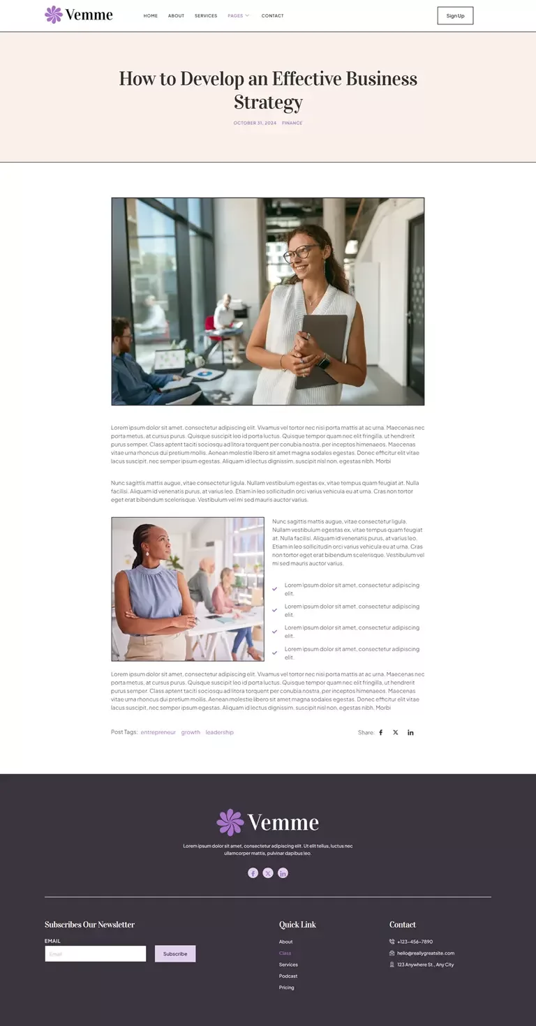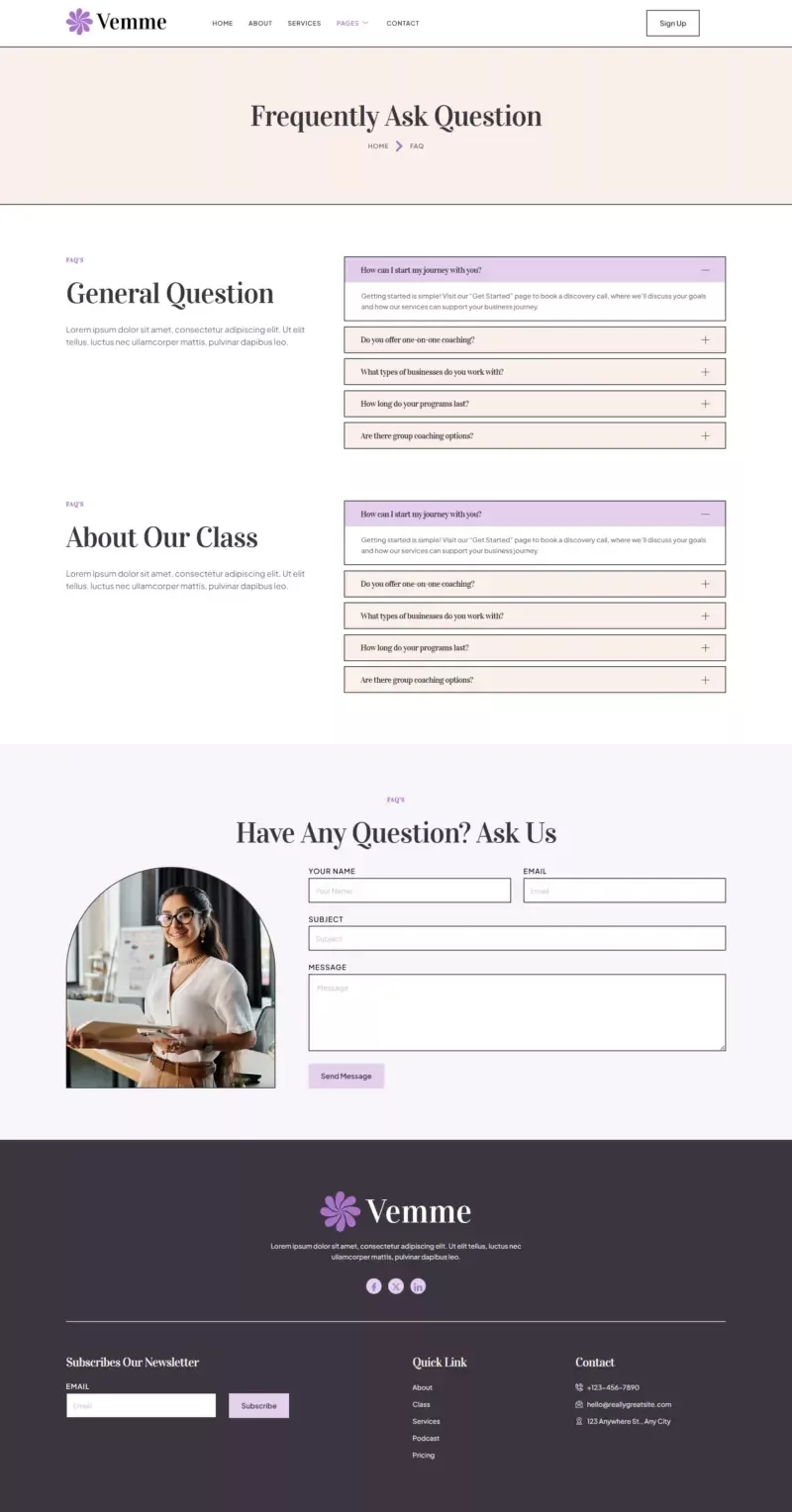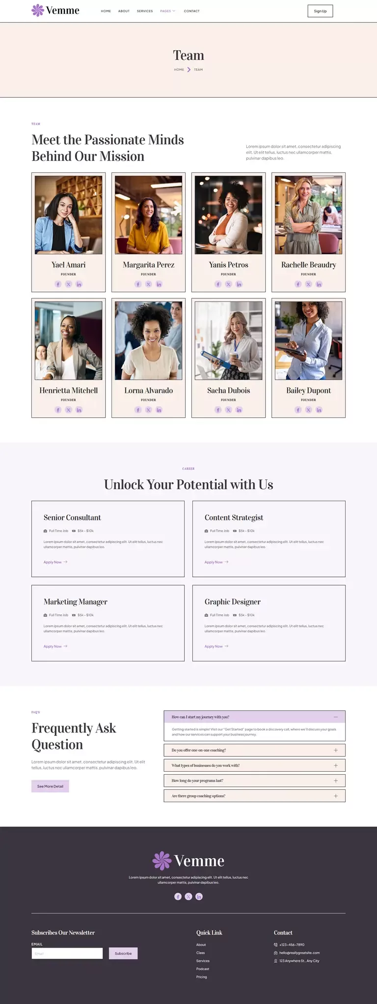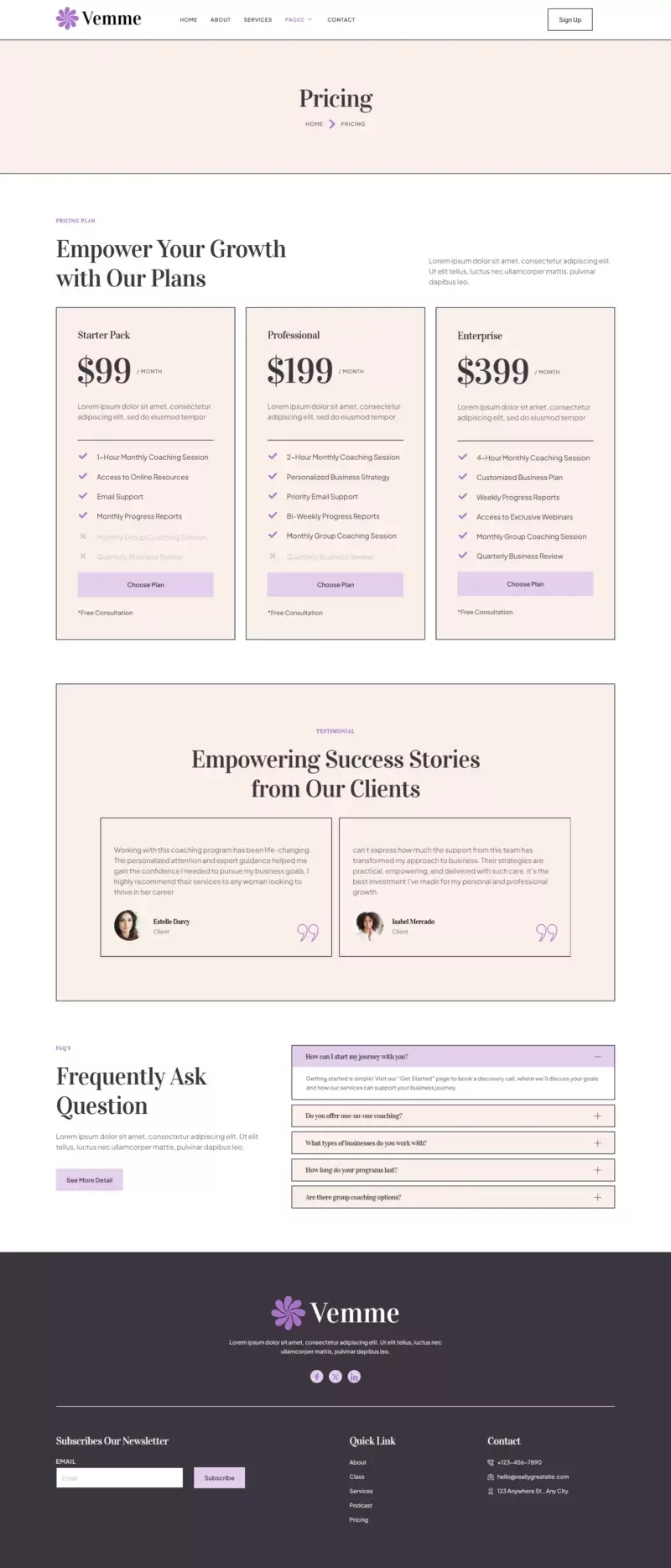 کیت قالب المنتور Vemme یک انتخاب عالی برای مربیان کسبوکار، مشاوران و مربیان زندگی است که به طور خاص بر توانمندسازی زنان کارآفرین تمرکز دارند. این قالب با طراحی شیک و مدرن، به شما کمک میکند تا یک وبسایت حرفهای و جذاب برای کسبوکار مربیگری خود بسازید بدون اینکه نیاز به کدنویسی پیچیده یا توسعه وب داشته باشید. با استفاده از این کیت قالب، شما میتوانید بدون هیچ دردسری وبسایتی با ظاهری حرفهای و کاربردی ایجاد کنید.