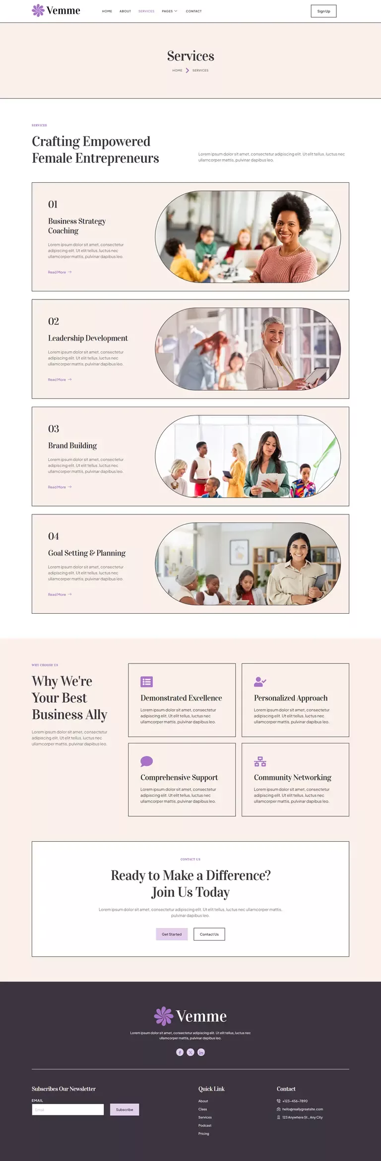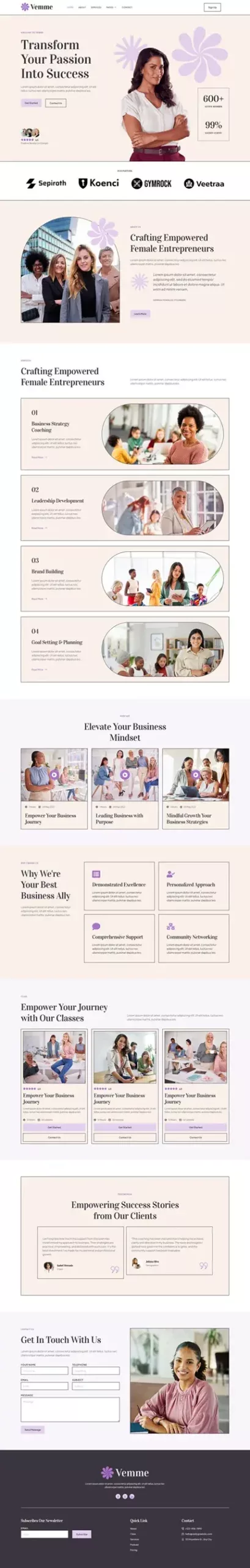 کیت قالب Vemme یک انتخاب عالی برای مربیان کسبوکار زنانه است که به دنبال ساخت یک وبسایت حرفهای، مدرن و جذاب برای کسبوکار خود هستند. با طراحی ساده و تمیز، قابلیت سفارشیسازی کامل، و پشتیبانی از دستگاهها و مرورگرهای مختلف، این کیت قالب به شما این امکان را میدهد که وبسایتی فوقالعاده بسازید که هم از نظر ظاهری و هم از نظر کاربری بینظیر باشد. همچنین، با استفاده از این کیت قالب میتوانید به راحتی ارتباط بیشتری با مخاطبان خود برقرار کرده و کسبوکار خود را به سطح بالاتری برسانید.