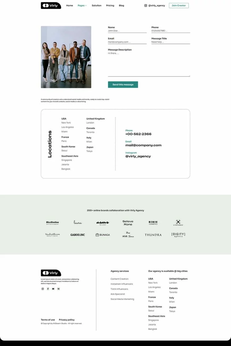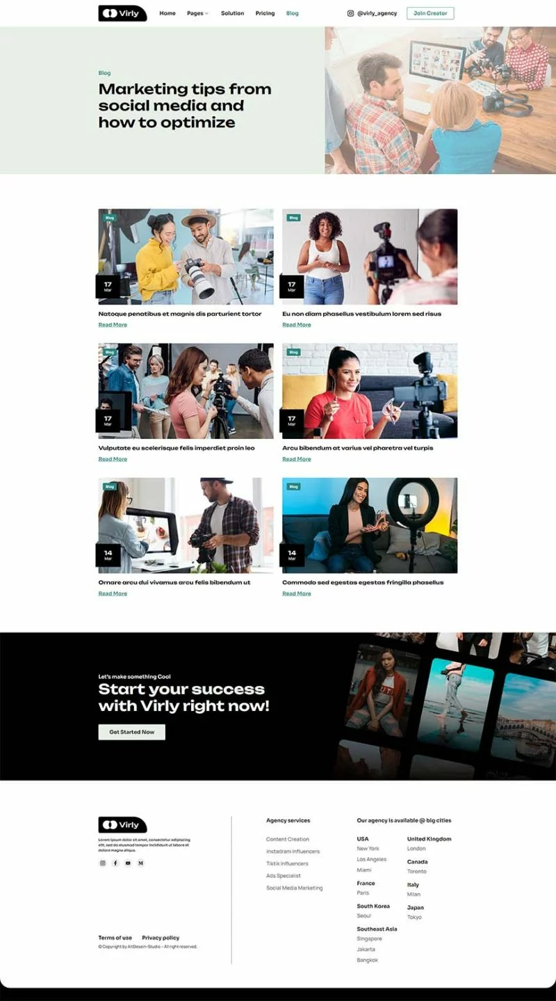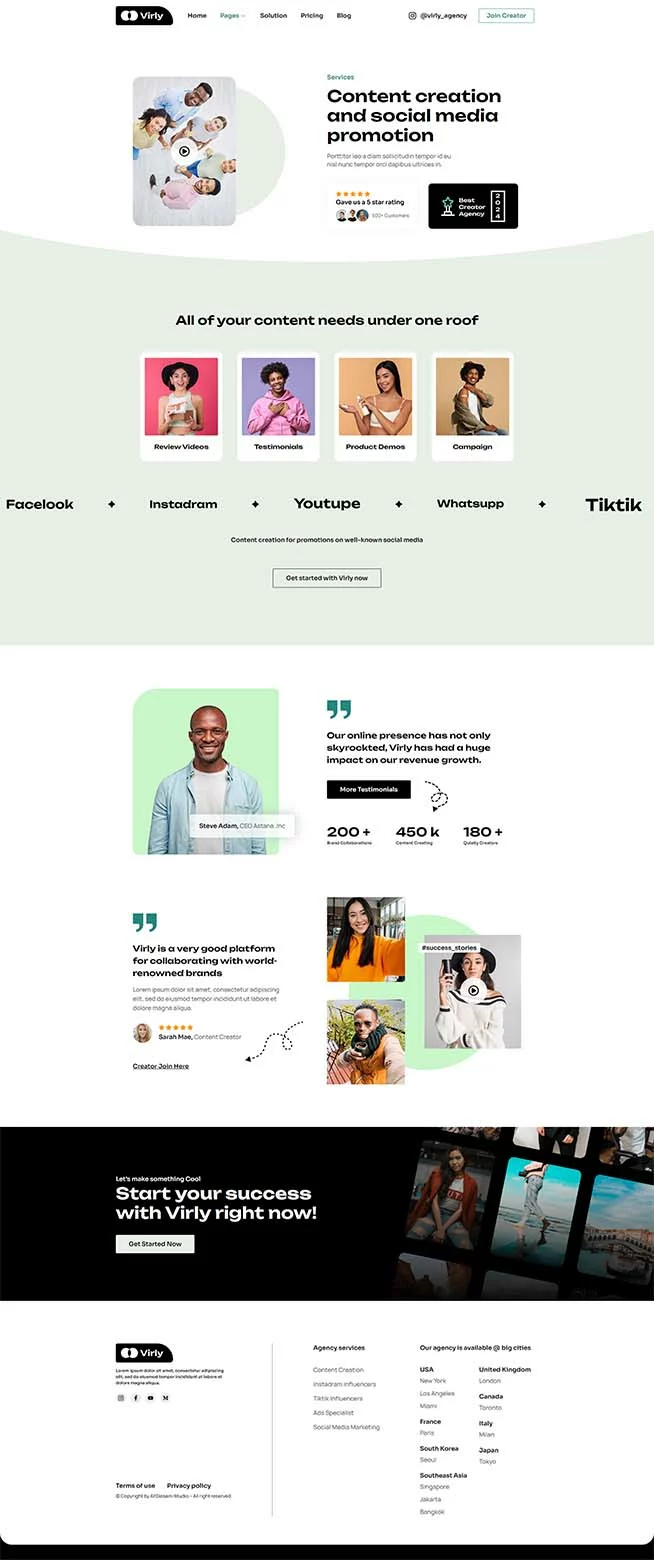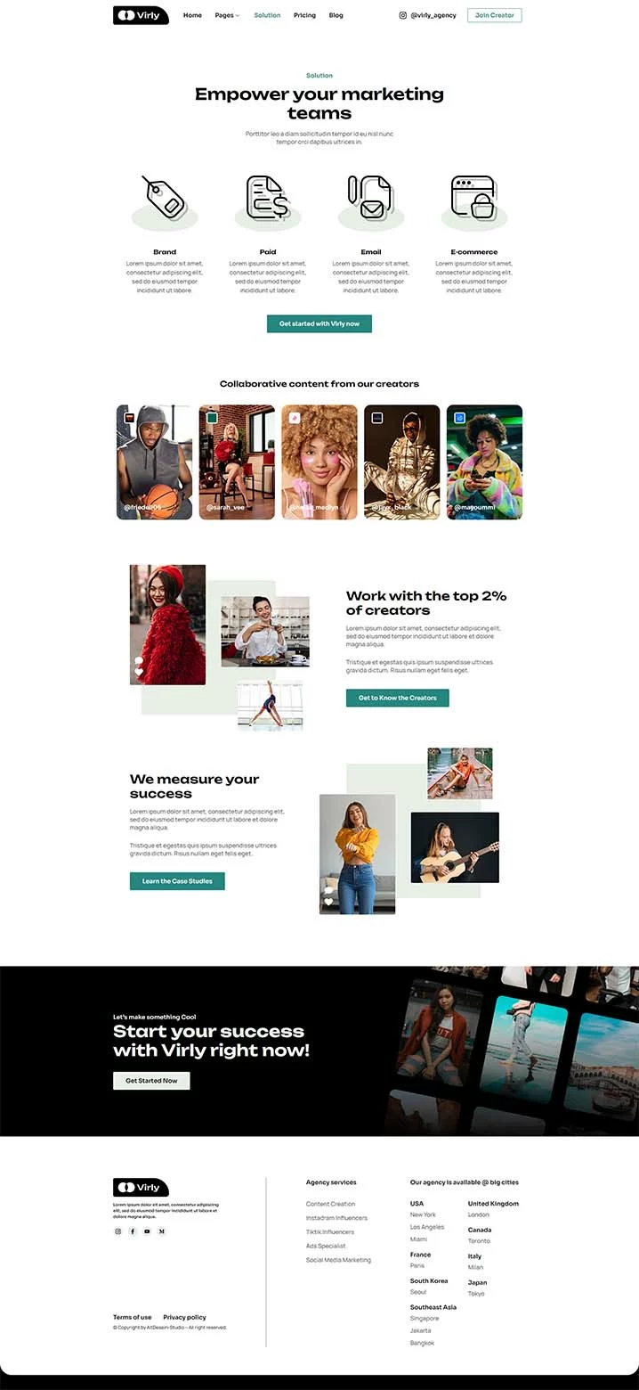 کیت قالب المنتور آژانس بازاریابی Virly برای آژانسهای بازاریابی اینفلوئنسر طراحی شده است. این کیت کاملاً واکنشگرا، تمیز و قابل سفارشیسازی است. این قالب مناسب برای استفاده در کسبوکارهایی مانند آژانسهای اینفلوئنسر، بازاریابی در شبکههای اجتماعی، آژانسهای تولید محتوا، متخصصان تبلیغات، ترویج در شبکههای اجتماعی و دیگر موارد مشابه است.