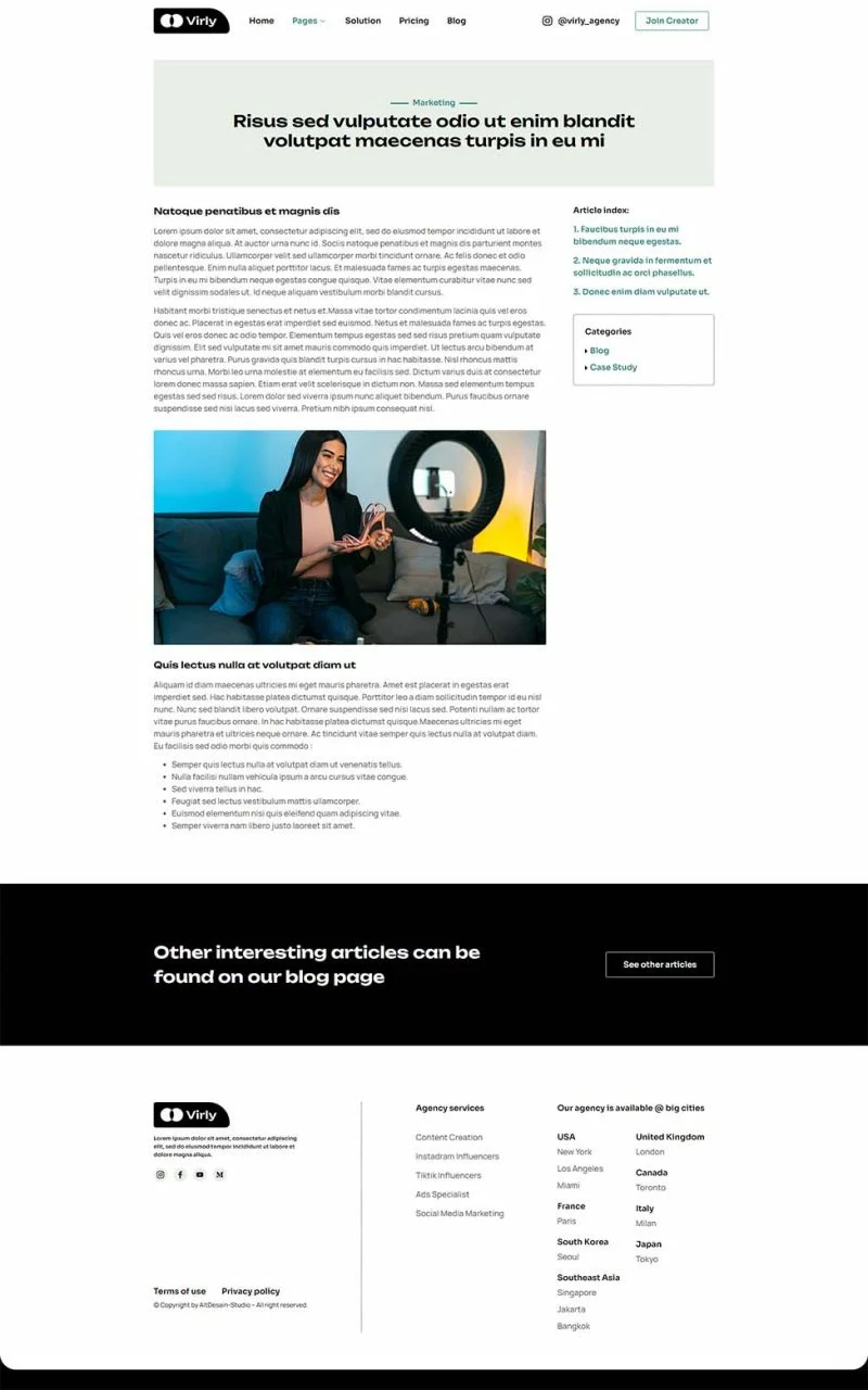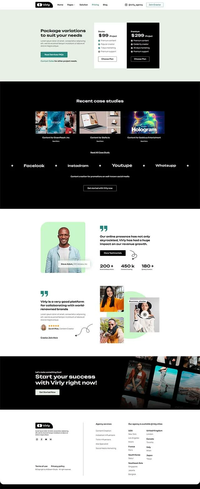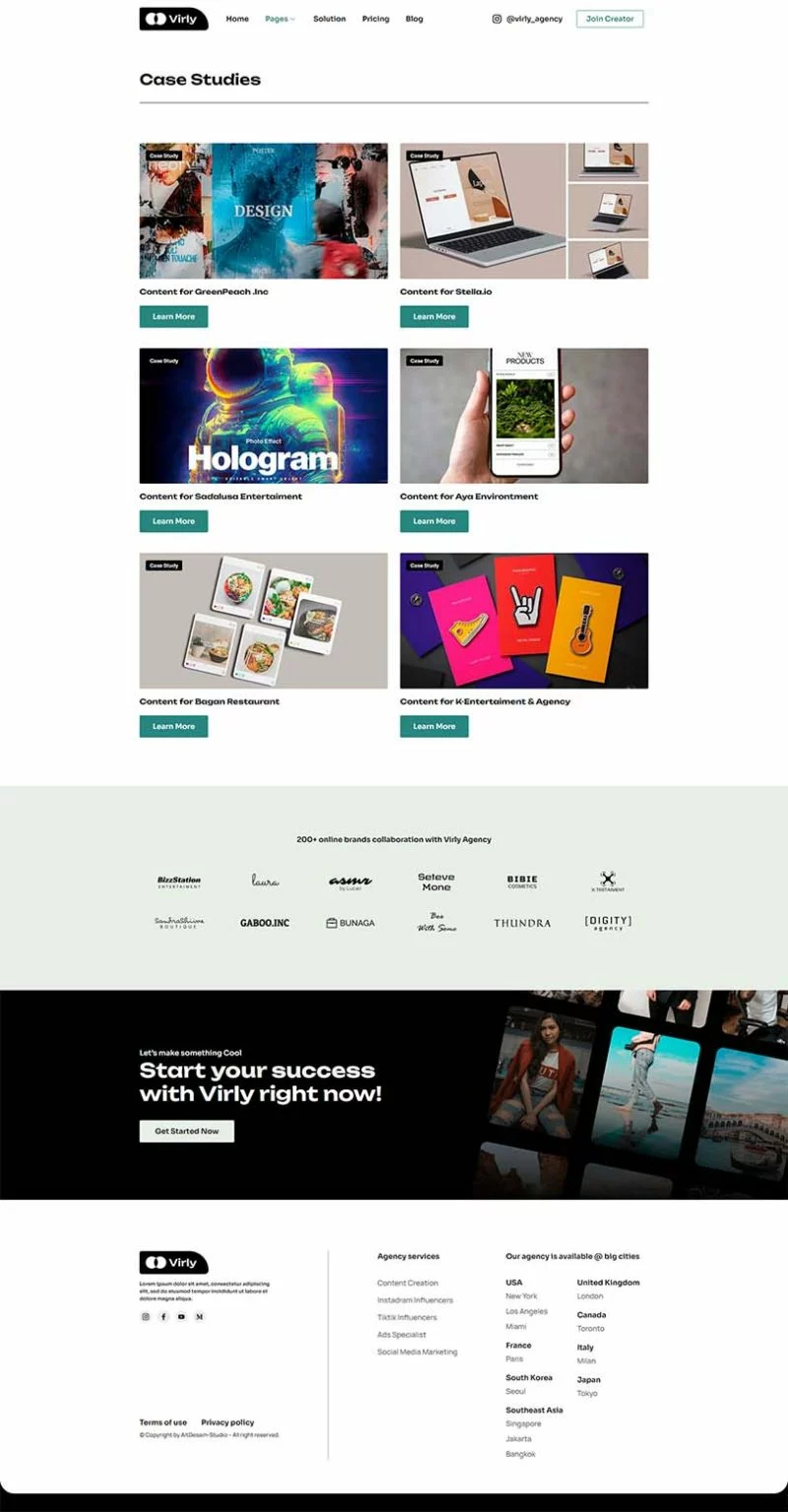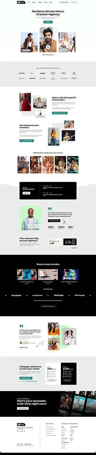 کیت قالب المنتور آژانس بازاریابی Virly برای آژانسهای بازاریابی اینفلوئنسر و تولیدکنندگان محتوا ایدهآل است که به دنبال طراحی حرفهای و کاربرپسند هستند. این کیت به شما امکان میدهد بهراحتی و بدون نیاز به کدنویسی، وبسایتی جذاب و مدرن برای نمایش خدمات و مطالعات موردی خود ایجاد کنید. با استفاده از این قالب، میتوانید حضور خود در دنیای دیجیتال را تقویت کرده و خدمات بازاریابی خود را به بهترین شکل ممکن به مخاطبان خود ارائه دهید.