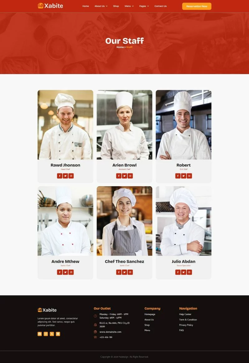 صفحه اصلی، درباره ما، کارکنان، فروشگاه، منو، جزئیات منو، گالری، رزرو، اخبار و مقالات، بلاگ تکی، تماس با ما، فرم تماس، فرم اشتراک، هدر، فوتر