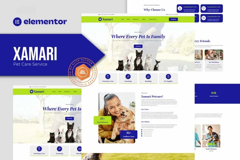 کیت قالب المنتور خدمات مراقبت از حیوانات Xamari شامل محتوای صفحات برای ایجاد صفحات المنتور است و برای استفاده با تم رایگان “Hello Elementor” بهینهسازی شده است.
