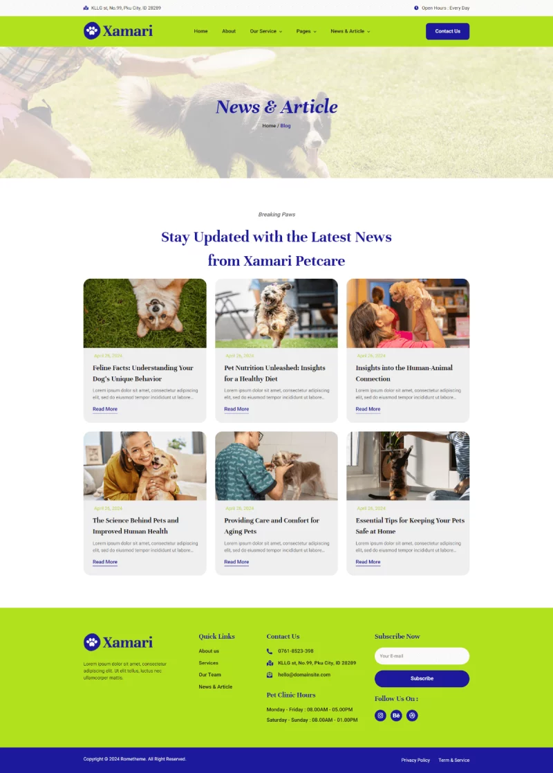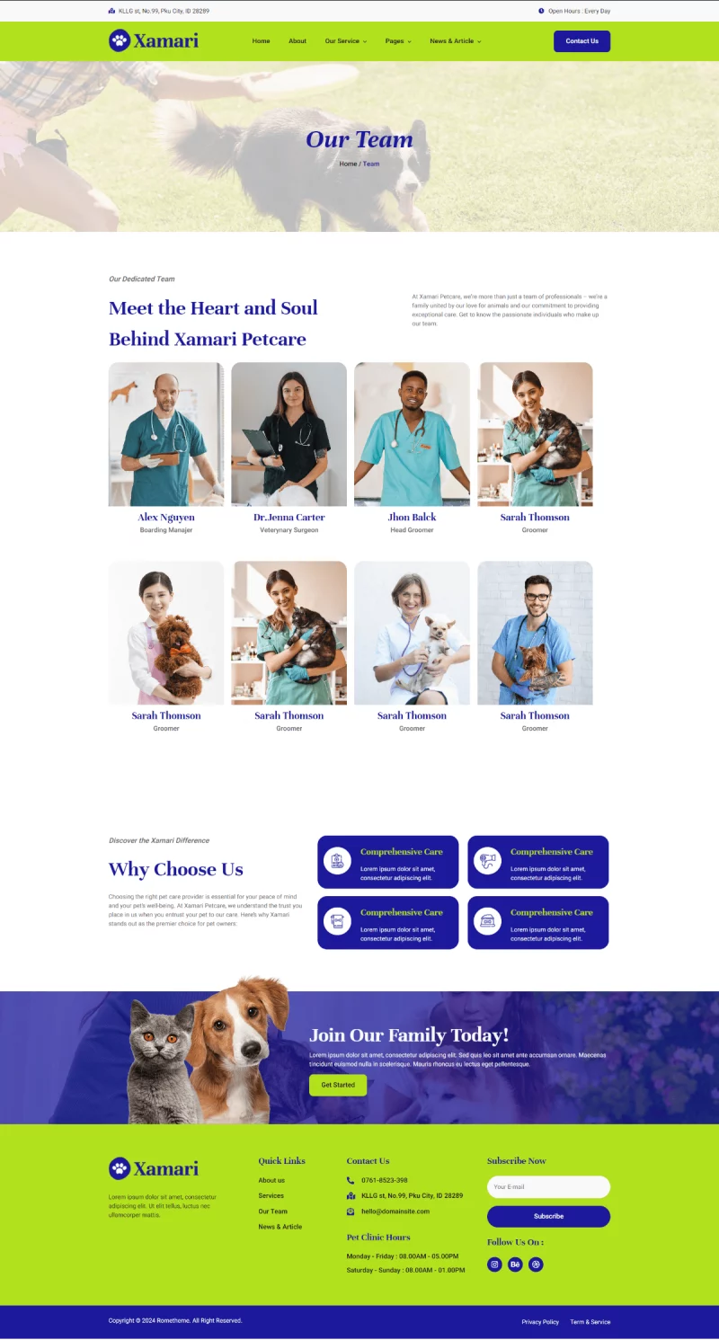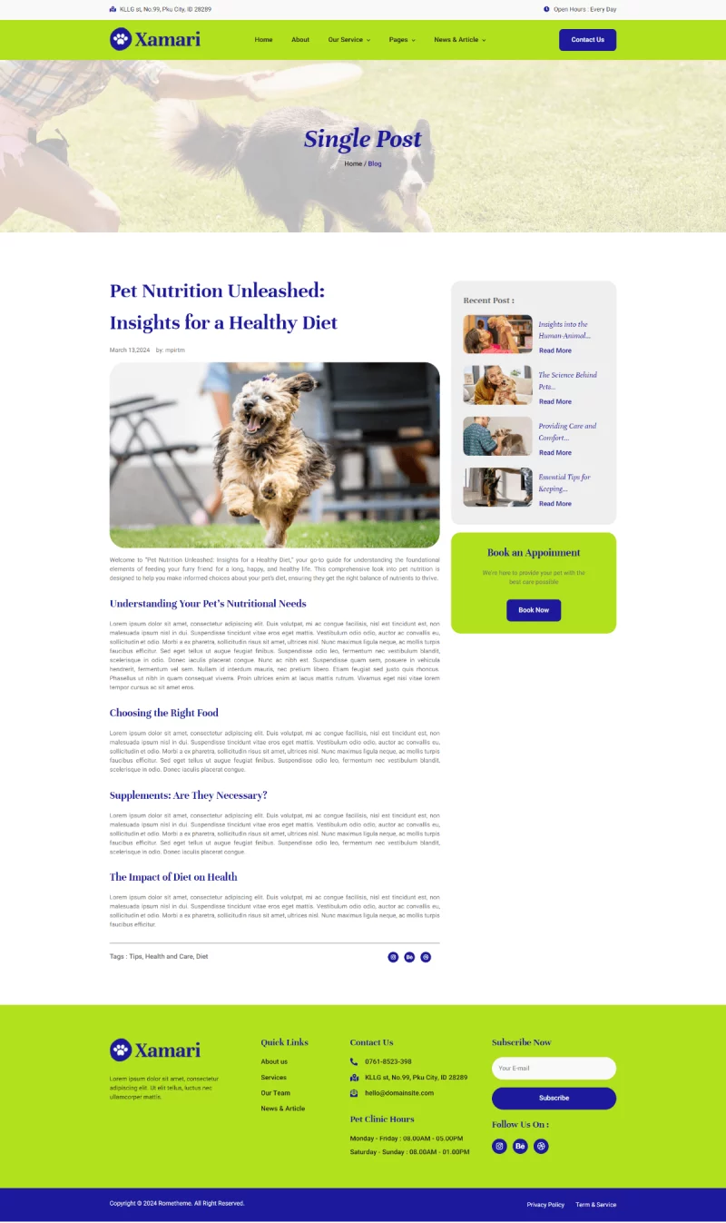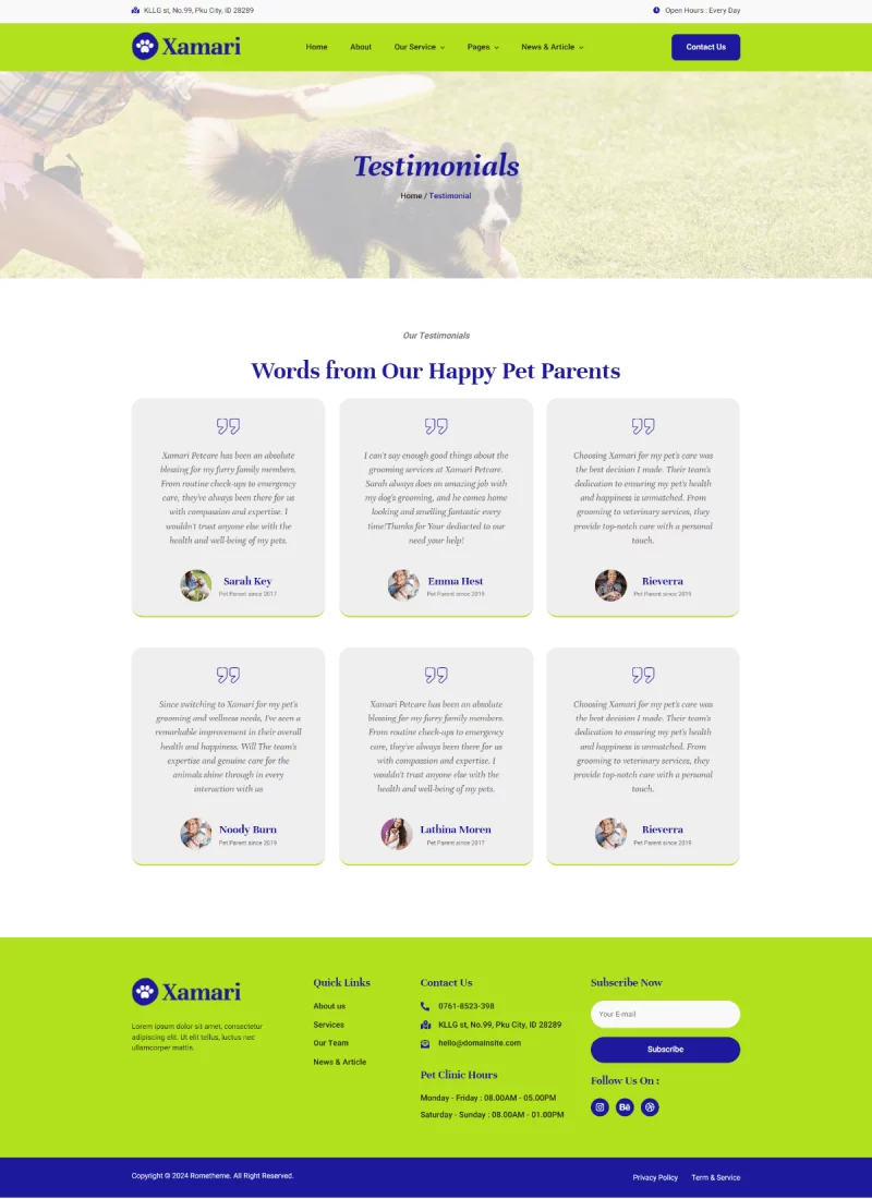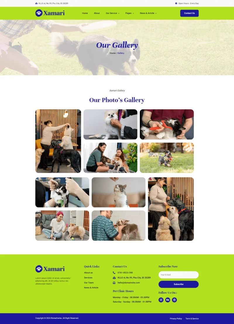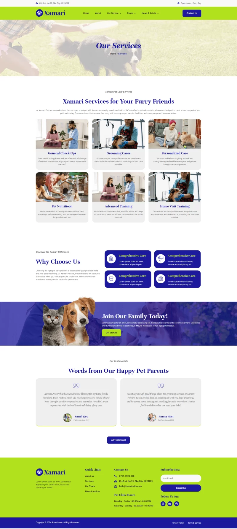 کیت قالب المنتور خدمات مراقبت از حیوانات Xamari انتخابی ایدهآل برای هر آژانس یا سازمانی است که به خدمات مرتبط با حیوانات خانگی میپردازد، از جمله مراقبت از حیوانات، مهد کودک حیوانات، نگهداری از گربه و سگ، آرایش حیوانات، پانسیون حیوانات، کلینیک حیوانات، بیمارستان حیوانات، پناهگاه حیوانات و خدمات دامپزشکی. این کیت دارای طراحی مدرن و منحصربهفرد با چیدمان 100% واکنشگرا است که به سادگی نصب و به راحتی قابل سفارشیسازی است، زیرا با استفاده از المنتور ساخته شده و نیازی به کدنویسی ندارد.