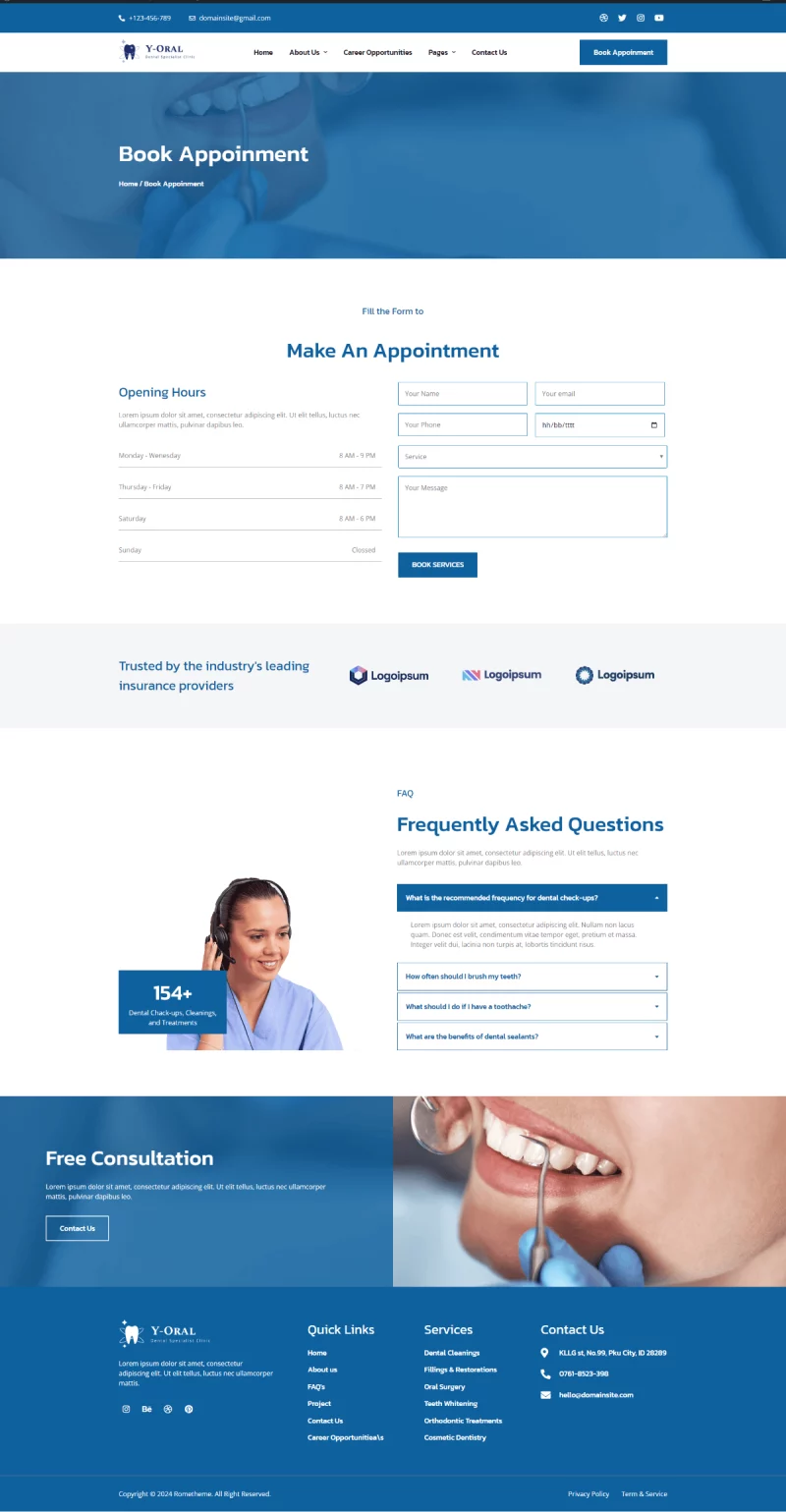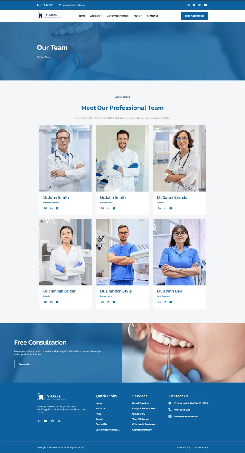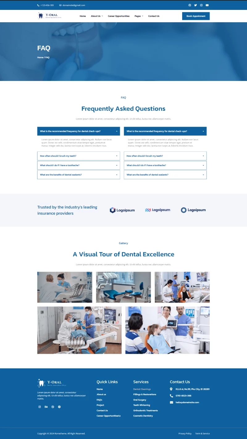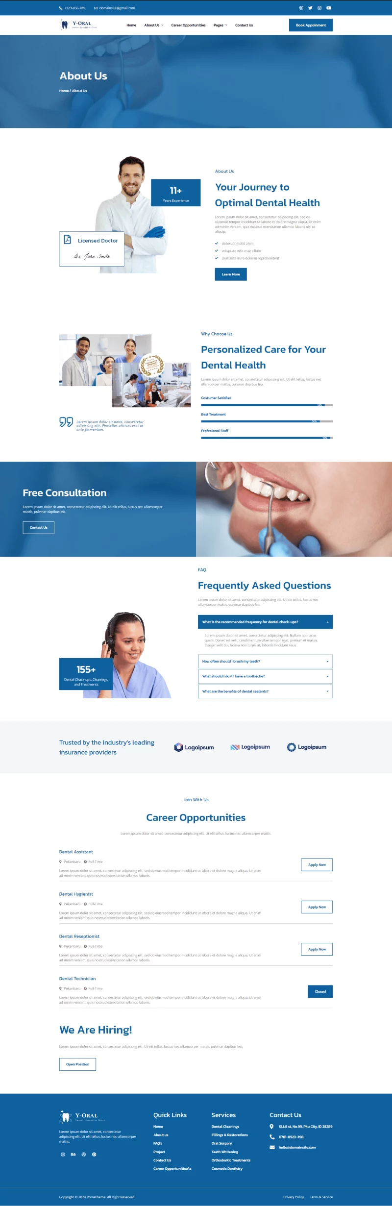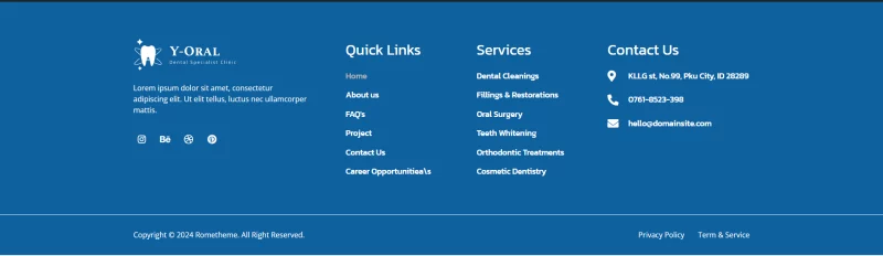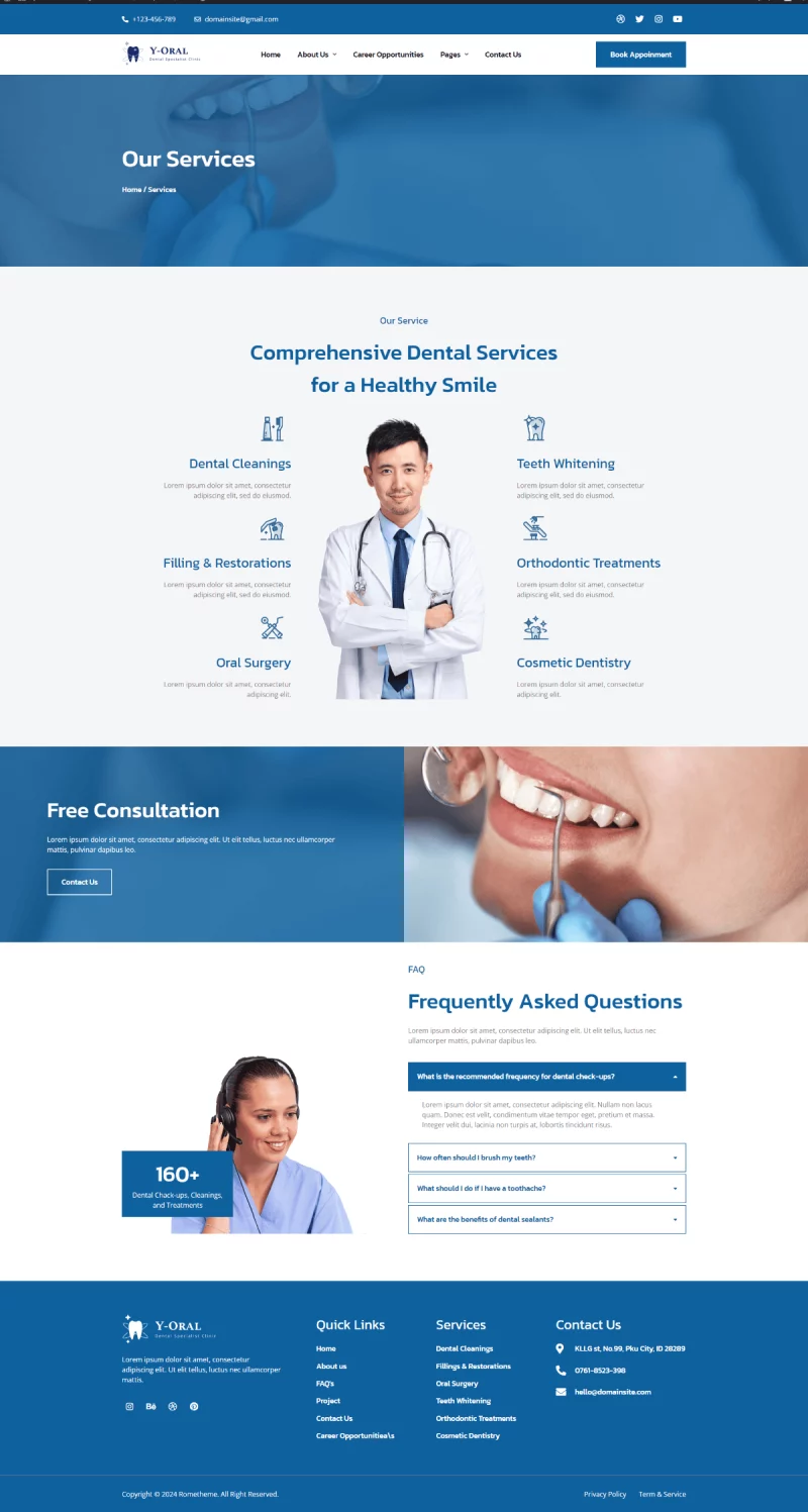 کیت قالب المنتور کلینیک دندانپزشکی Y-Oral با طراحی مدرن و منحصر به فرد، بهطور کامل ریسپانسیو و سازگار با دستگاههای مختلف است و با استفاده از المنتور، سفارشیسازی آن بدون نیاز به کدنویسی امکانپذیر است.