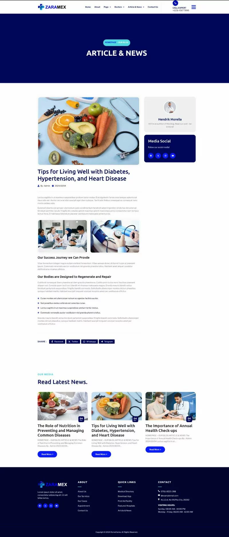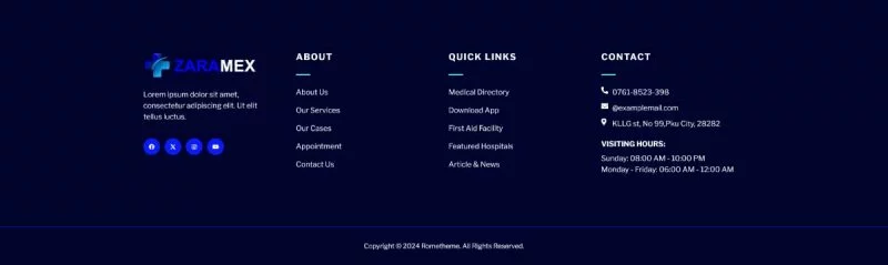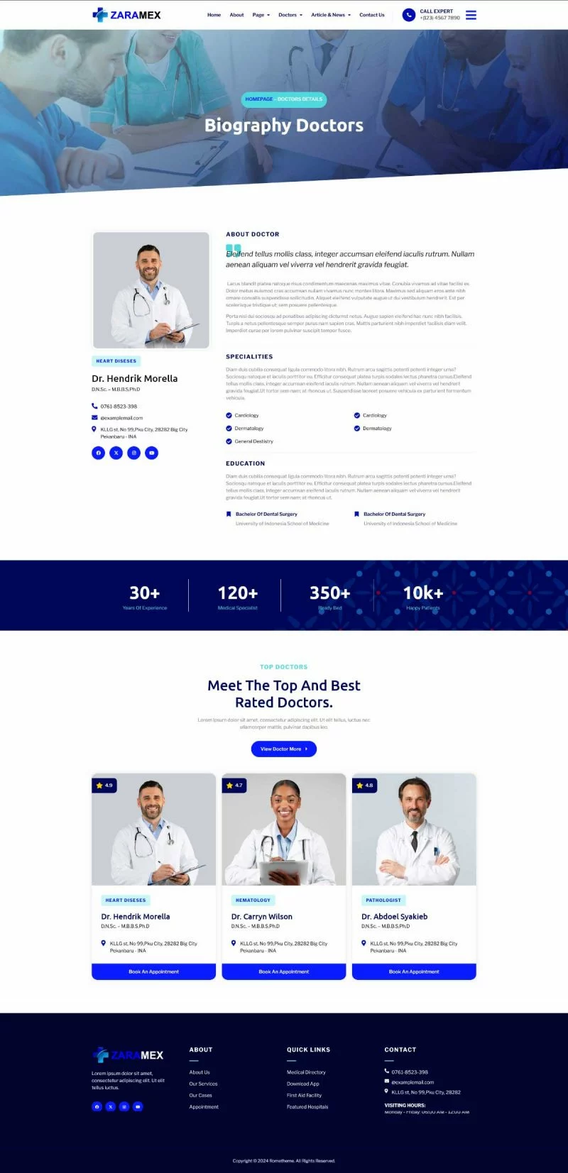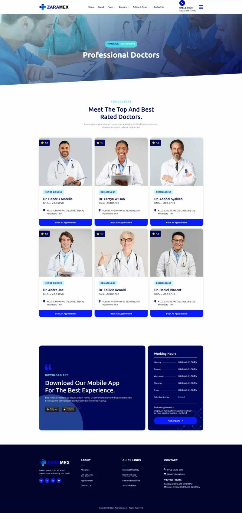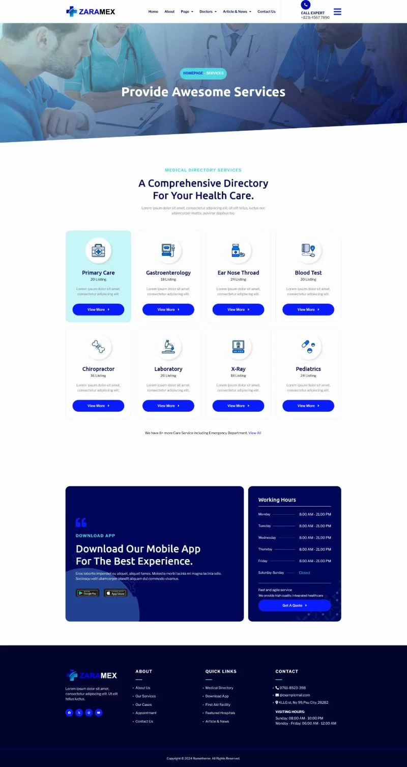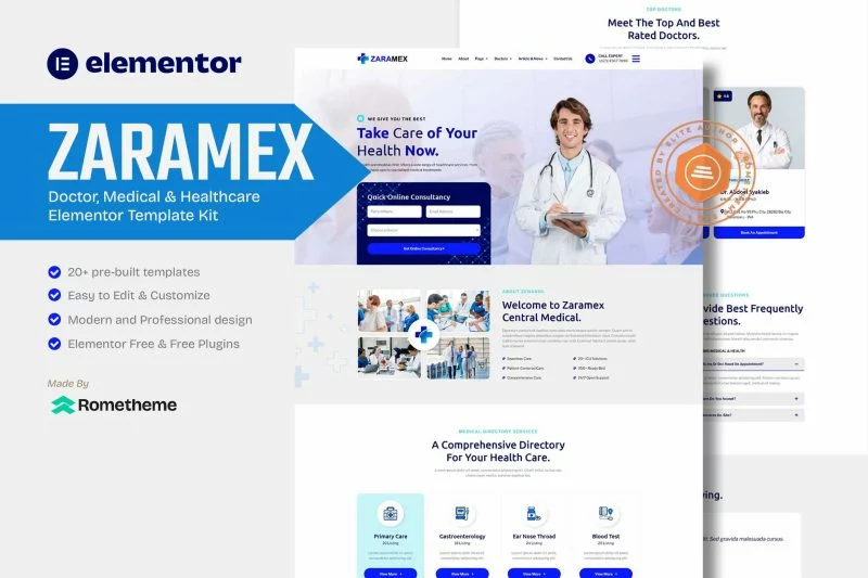 کیت قالب المنتور Zaramex بهطور ویژه برای وبسایتهای پزشکان، خدمات پزشکی و بهداشتی طراحی شده است. این کیت مجموعهای کامل از قالبها را ارائه میدهد که برای کسبوکارهایی مانند کلینیکها، بیمارستانها، پزشکان، مراکز درمانی، خدمات پرستاری و سایر خدمات مرتبط با سلامت ایدهآل است.