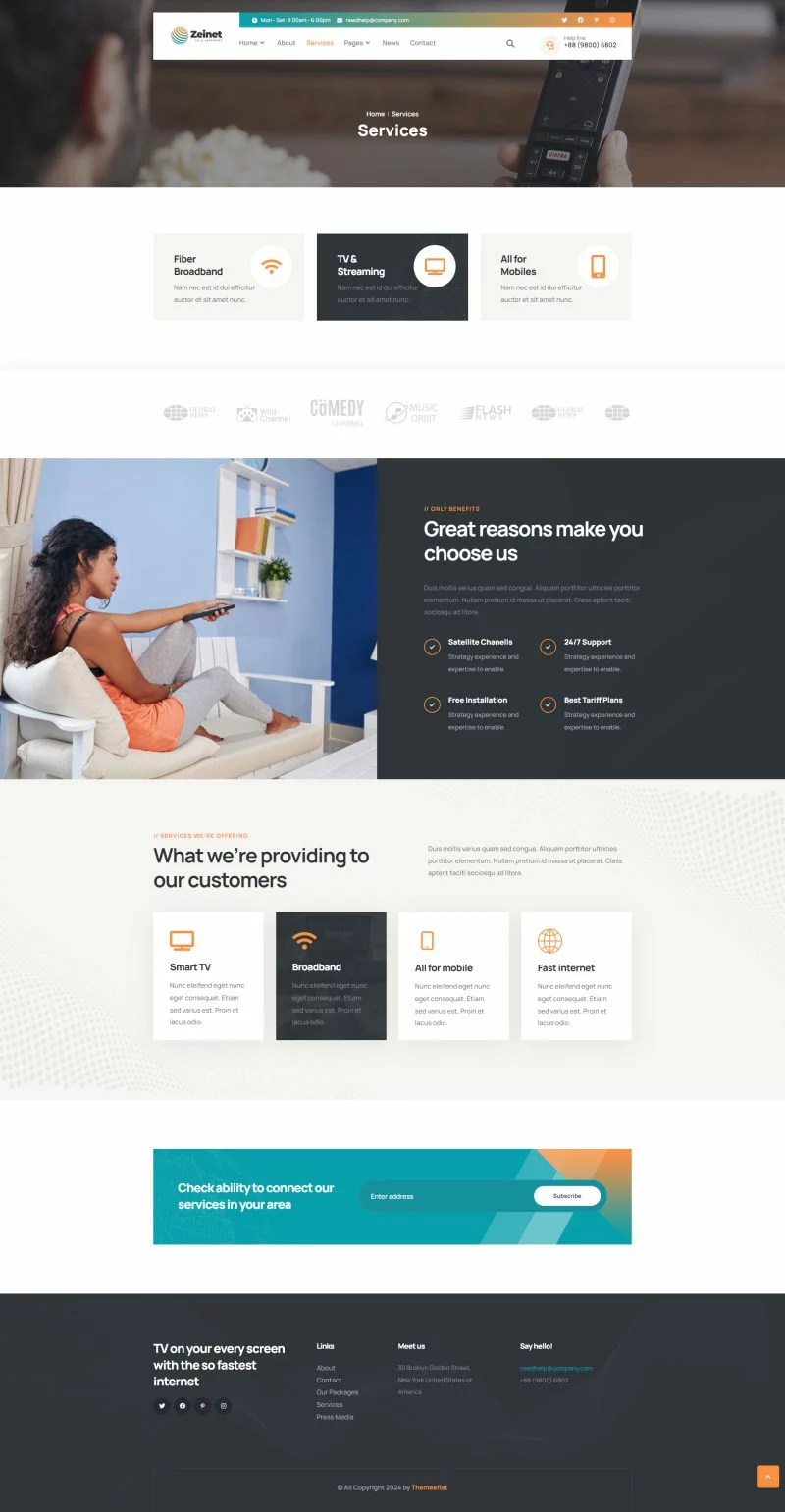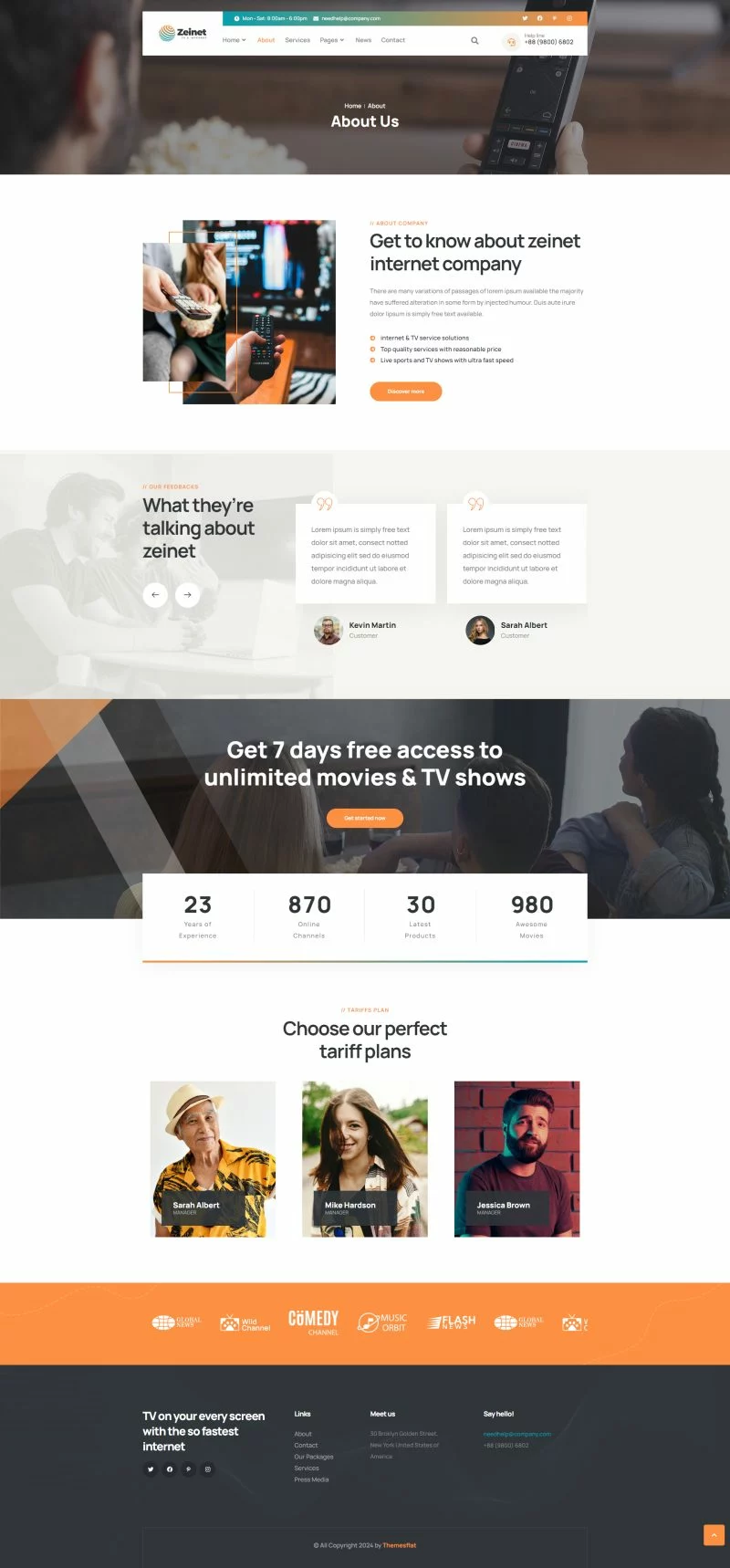 کیت قالب المنتور ارائه دهنده اینترنت Zeinet بهطور ویژه برای انواع وبسایتهای ارائهدهنده خدمات اینترنت، تلویزیون ماهوارهای، پهنای باند، تلویزیون آنلاین، تلویزیون کابلی، IPTV، شرکتهای مخابراتی، سینمای آنلاین و بسیاری دیگر طراحی شده است. این کیت همچنین برای VoIP، اپراتورهای موبایل، فروشگاههای اینترنت و تلویزیون، تلویزیون دیجیتال، سینماهای آنلاین، شبکههای کامپیوتری و سایر وبسایتها، کسبوکارها و شرکتهای مرتبط مناسب است.