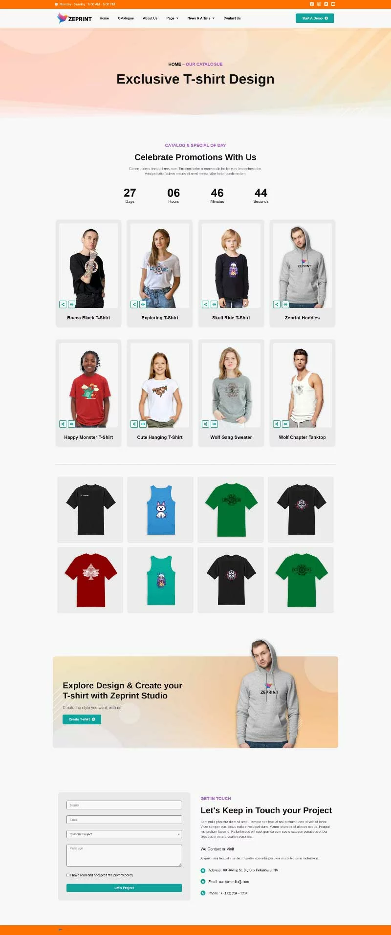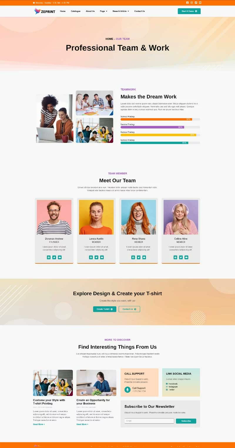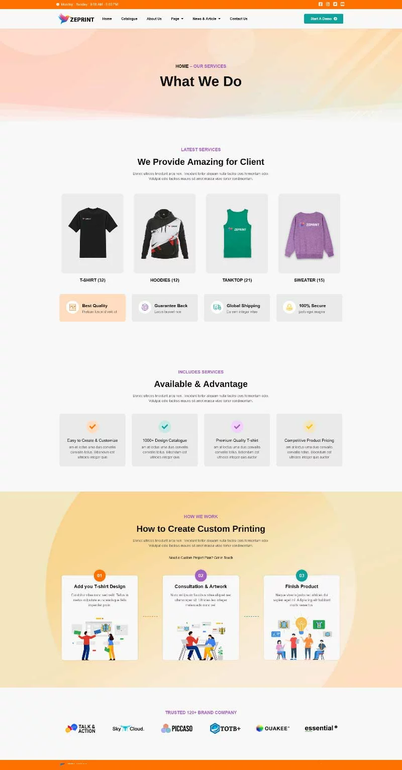 کیت قالب المنتور طراحی و چاپ تیشرت Zeprint از چیدمانهای پیشساخته برای افزونه صفحهساز المنتور وردپرس است. Zeprint دارای 13 قالب پیشساخته با طراحی مدرن، تمیز و کاملاً واکنشگرا است که به سادگی قابل سفارشیسازی هستند. این کیت برای استفاده در وبسایتهای مرتبط با چاپ، طراحی تیشرت و آژانسهای طراحی بسیار مناسب است. همچنین میتواند برای شرکتها به منظور نمایش پروژههای مدرن و شگفتانگیز آنها مورد استفاده قرار گیرد.