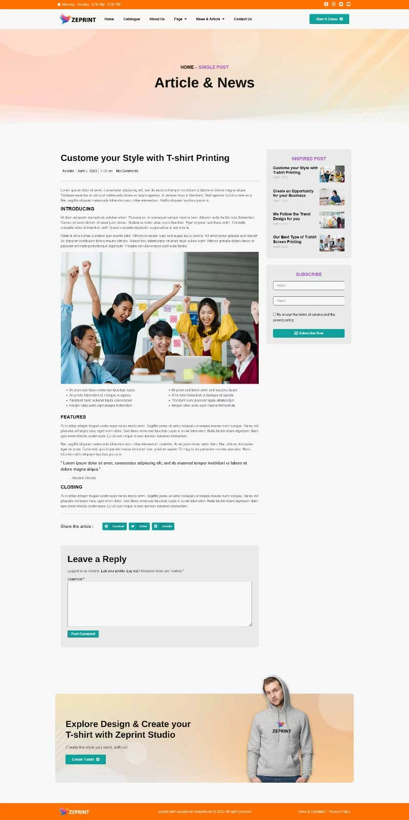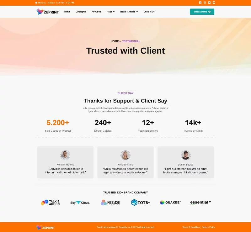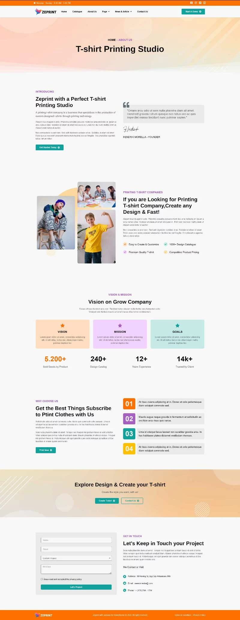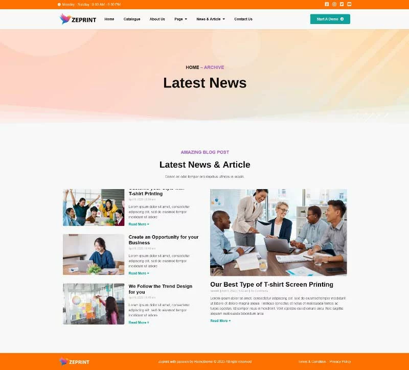 کیت قالب المنتور طراحی و چاپ تیشرت Zeprint از چیدمانهای پیشساخته برای افزونه صفحهساز المنتور وردپرس است. Zeprint دارای 13 قالب پیشساخته با طراحی مدرن، تمیز و کاملاً واکنشگرا است که به سادگی قابل سفارشیسازی هستند. این کیت برای استفاده در وبسایتهای مرتبط با چاپ، طراحی تیشرت و آژانسهای طراحی بسیار مناسب است. همچنین میتواند برای شرکتها به منظور نمایش پروژههای مدرن و شگفتانگیز آنها مورد استفاده قرار گیرد.