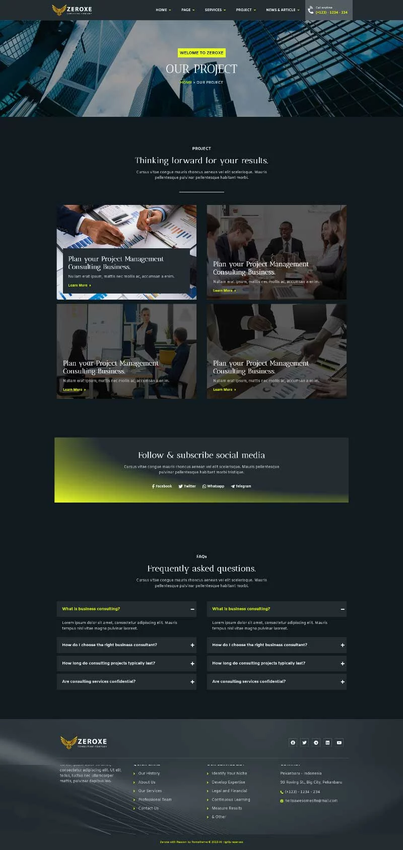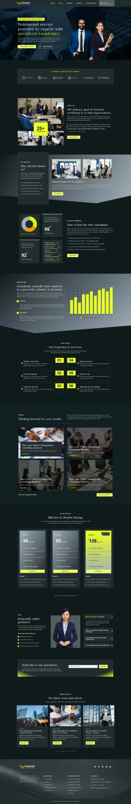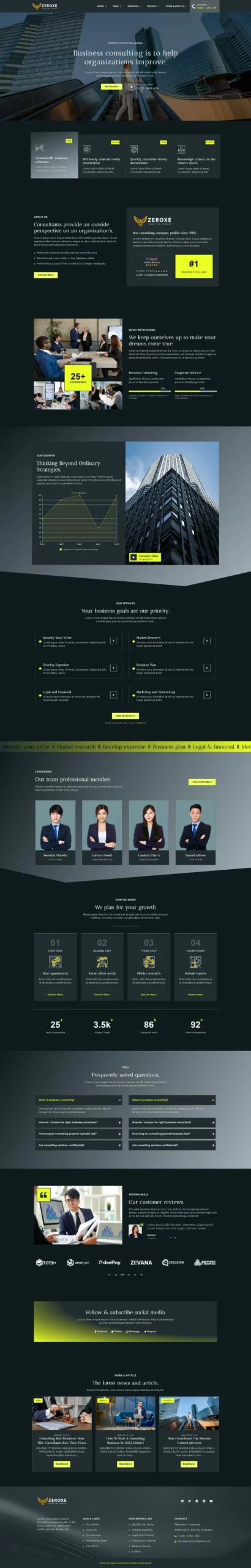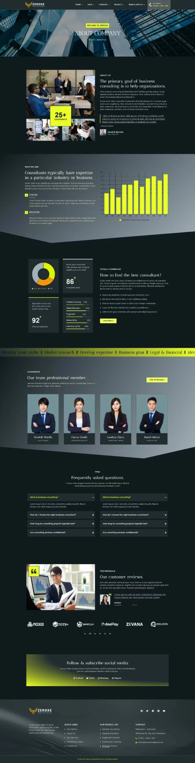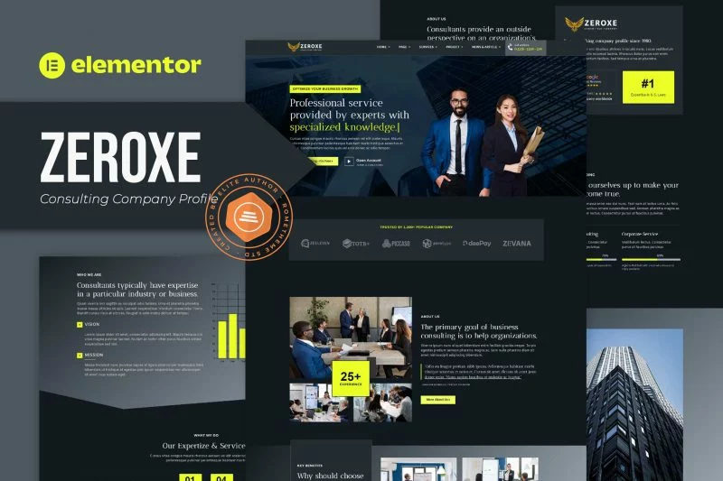 کیت قالب المنتور پروفایل شرکت مشاوره Zeroxe با انتخاب ایدهآل از قالبها برای مشاوره، حسابداری، کسبوکار، آژانس، امور مالی و خدمات طراحی شده است.