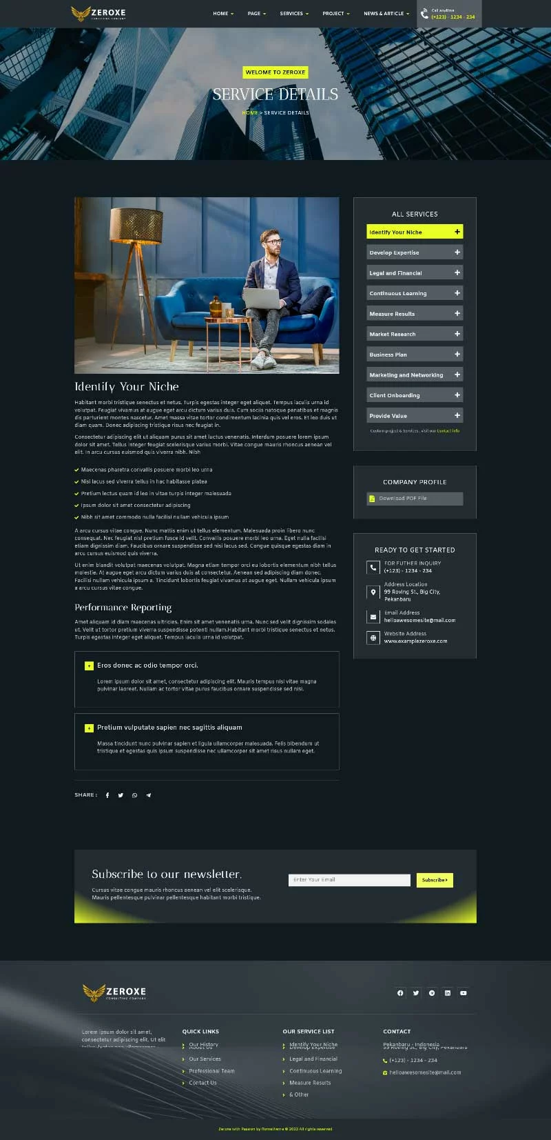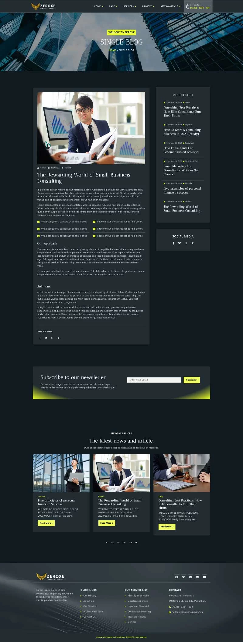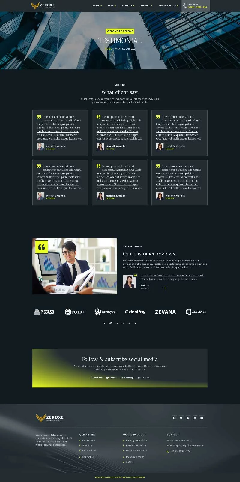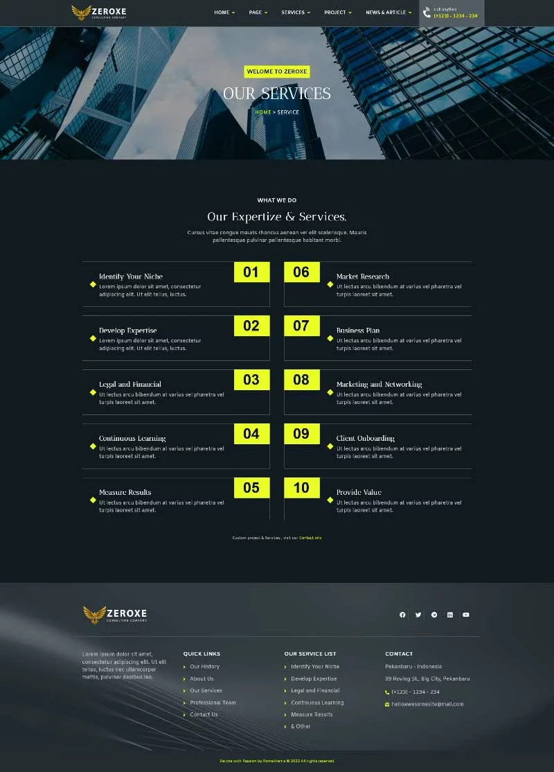 کیت قالب المنتور پروفایل شرکت مشاوره Zeroxe با انتخاب ایدهآل از قالبها برای مشاوره، حسابداری، کسبوکار، آژانس، امور مالی و خدمات طراحی شده است.