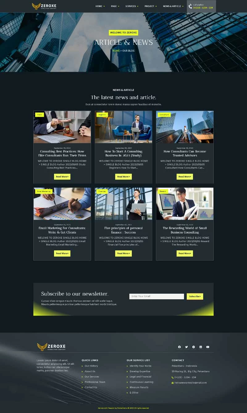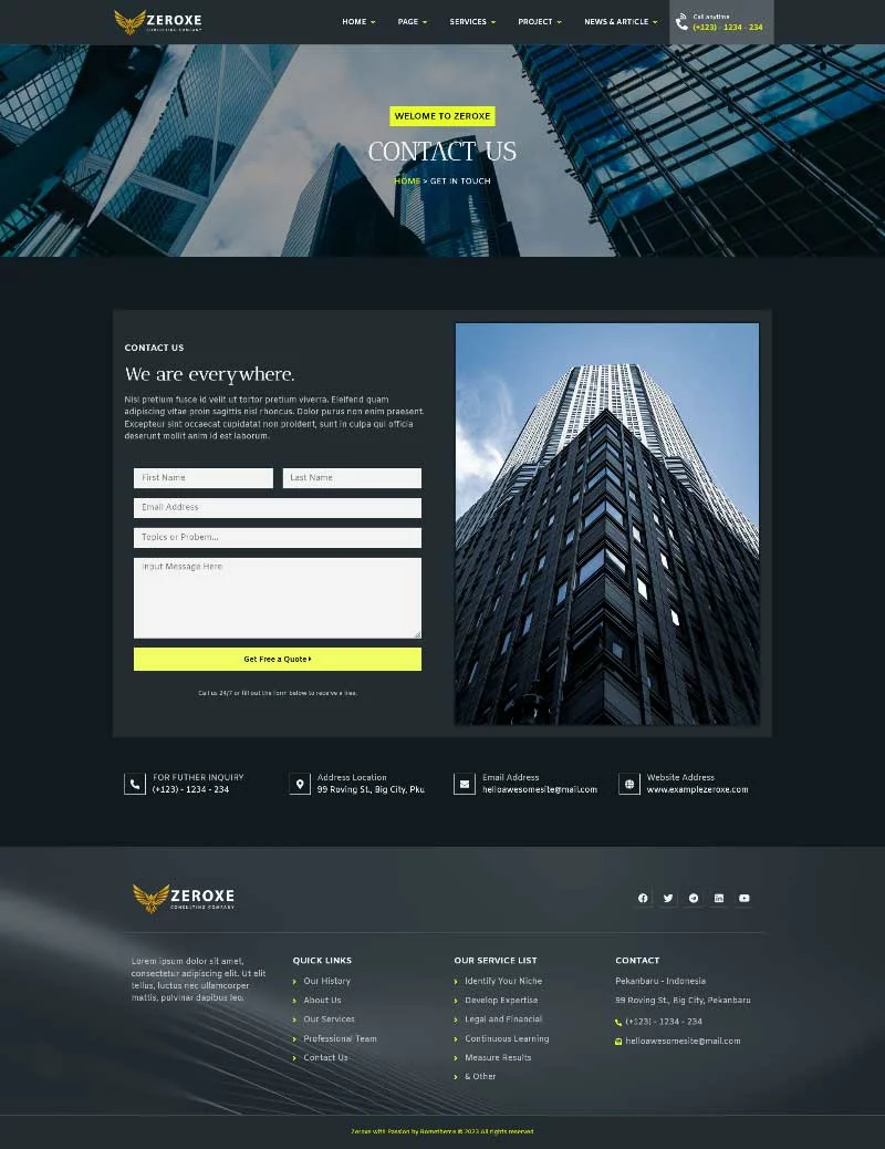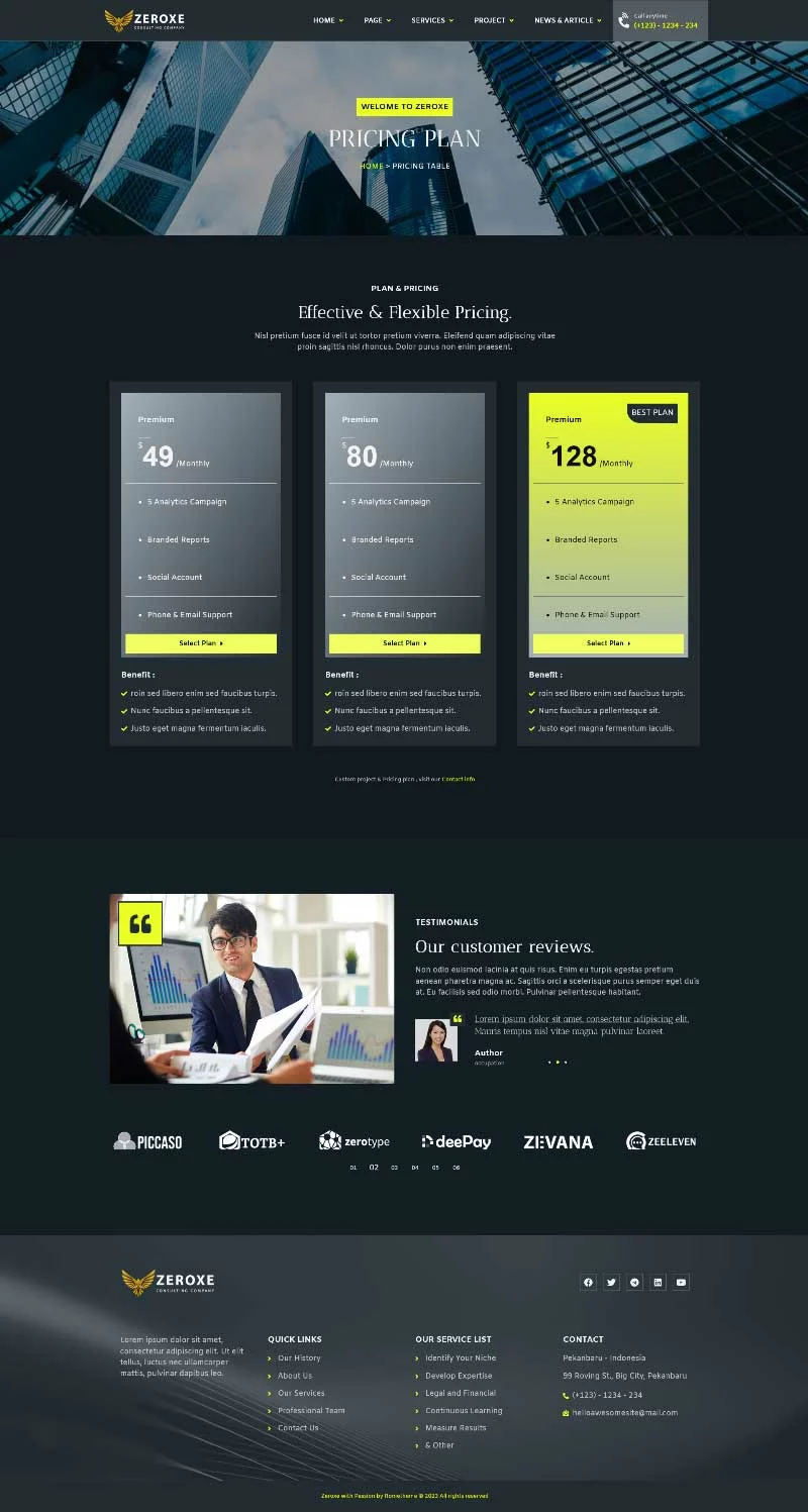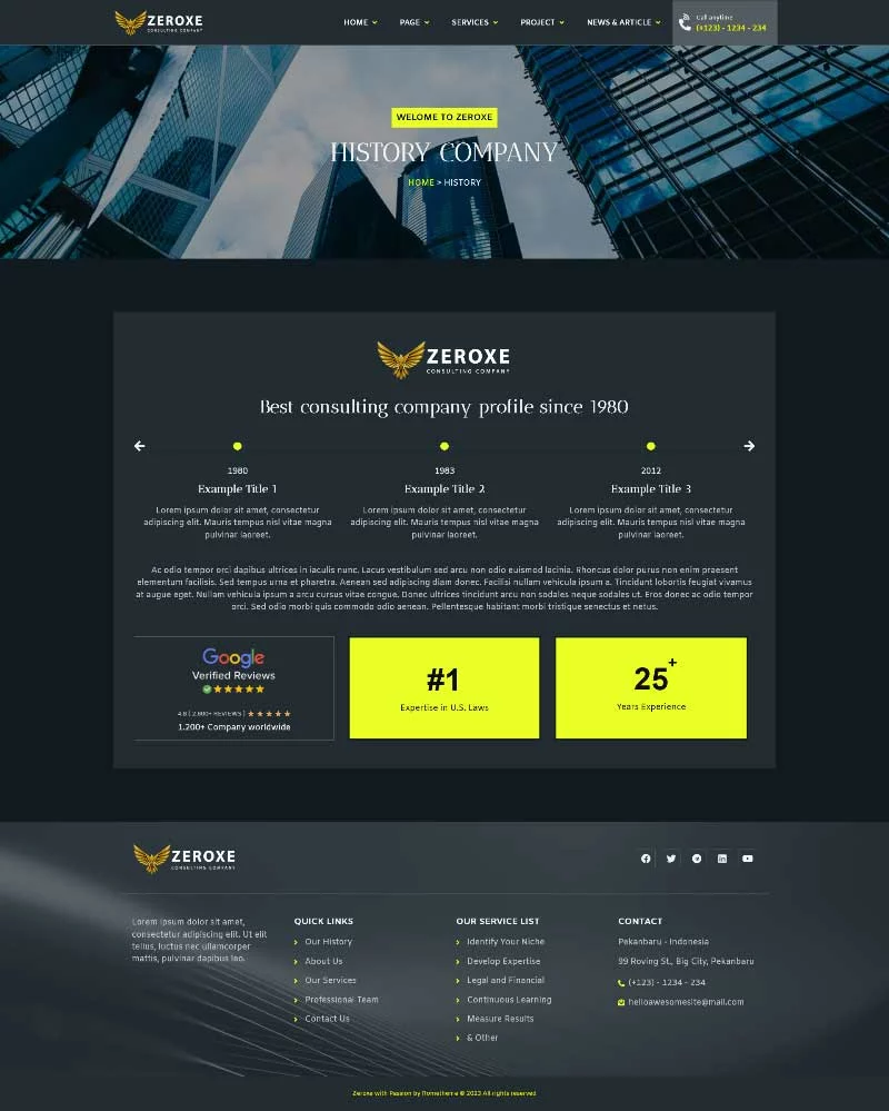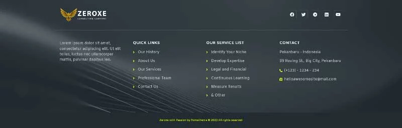 کیت قالب المنتور پروفایل شرکت مشاوره Zeroxe با انتخاب ایدهآل از قالبها برای مشاوره، حسابداری، کسبوکار، آژانس، امور مالی و خدمات طراحی شده است.